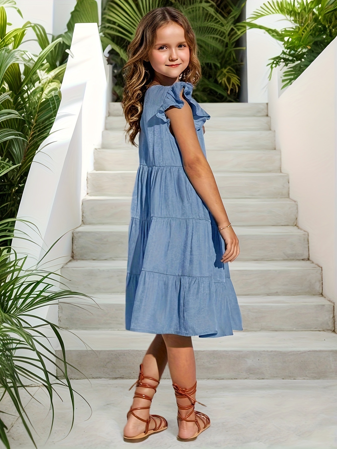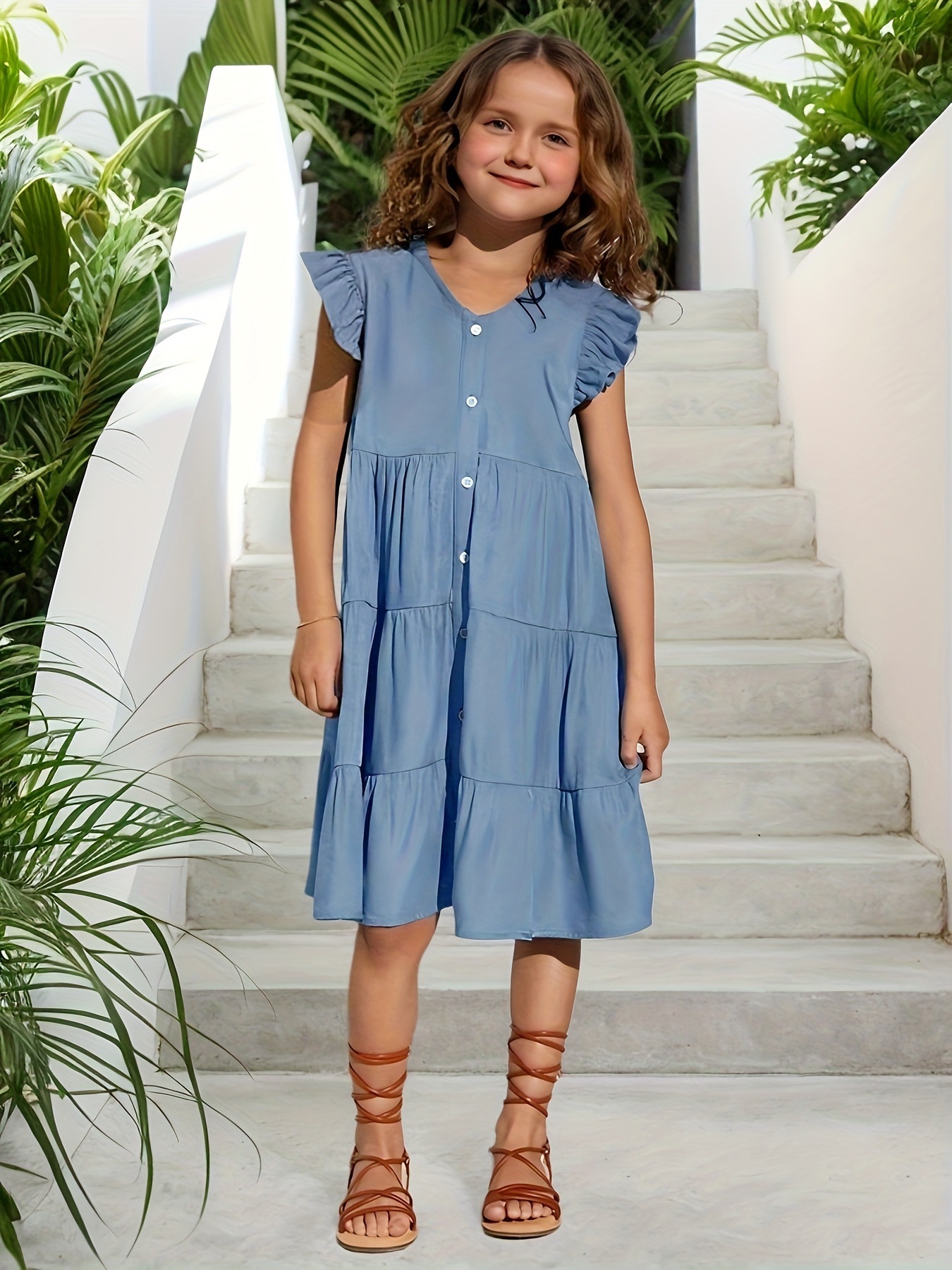 국경 간 대외 무역 INS 소녀 스커트 2025 새로운 유럽과 미국의 버튼 허리 슬리밍 복고풍 플라잉 슬리브 드레스 접합스토어 가기
