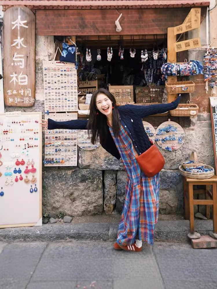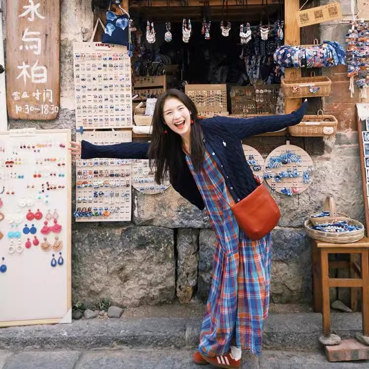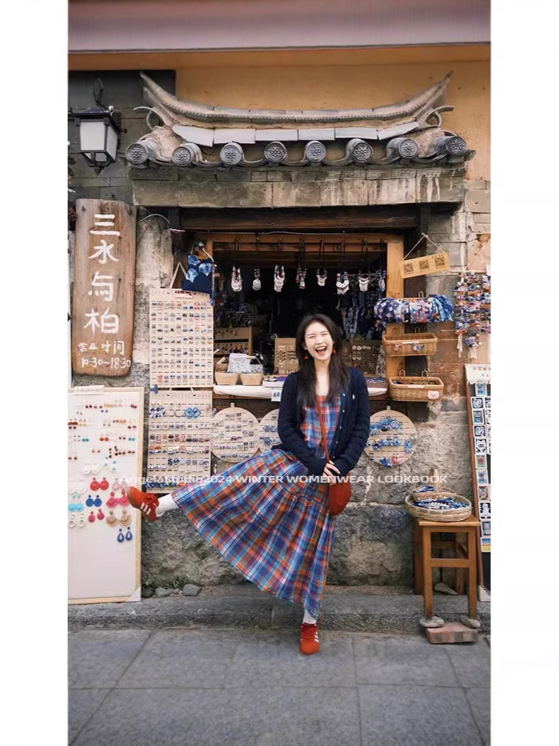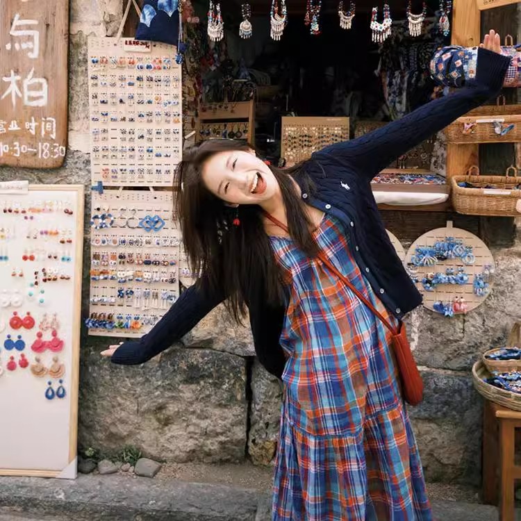 2025 슈퍼 핫 니치 컬러 플레이드 슬링 원피스 여성 봄 2025 느슨한 여행 휴일 스커트스토어 가기