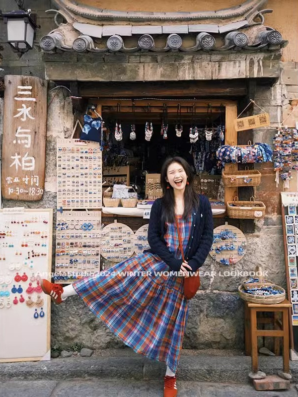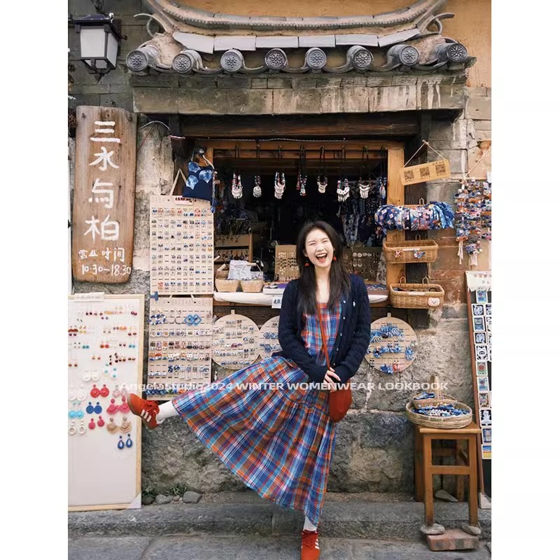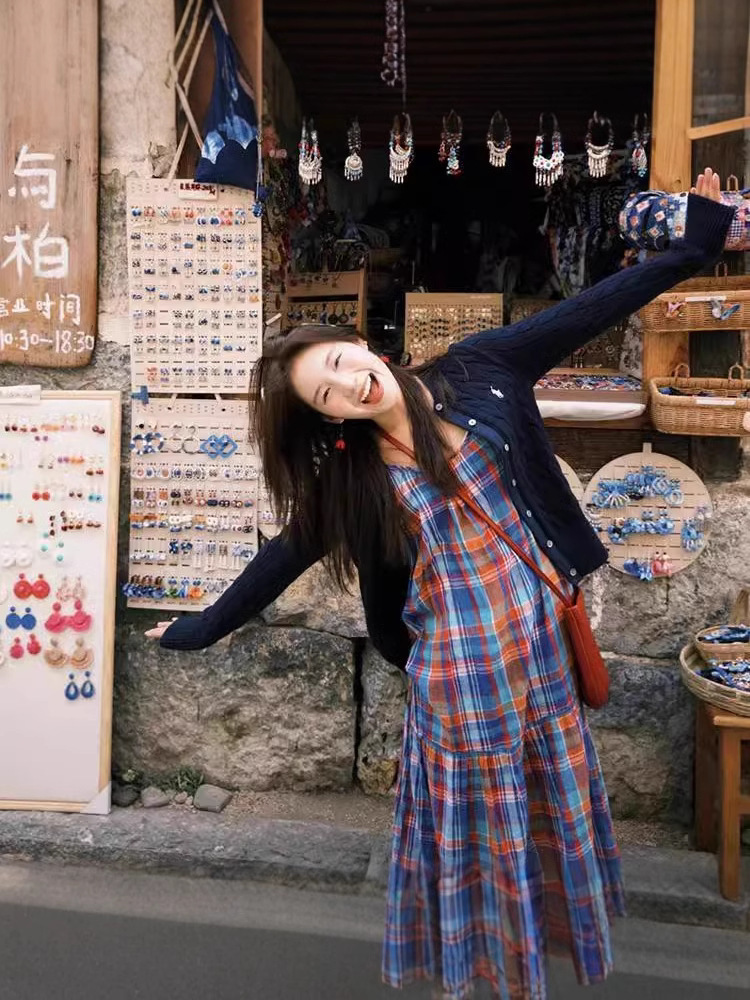2025 슈퍼 핫 니치 컬러 플레이드 슬링 원피스 여성 봄 2025 느슨한 여행 휴일 스커트