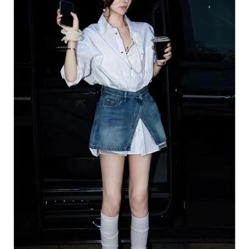 패션 디자인 감각 기질 옷깃 긴 소매 셔츠 여성의 여름 달콤한 매운 레이스 스티칭 데님 스커트 투피스 세트스토어 가기