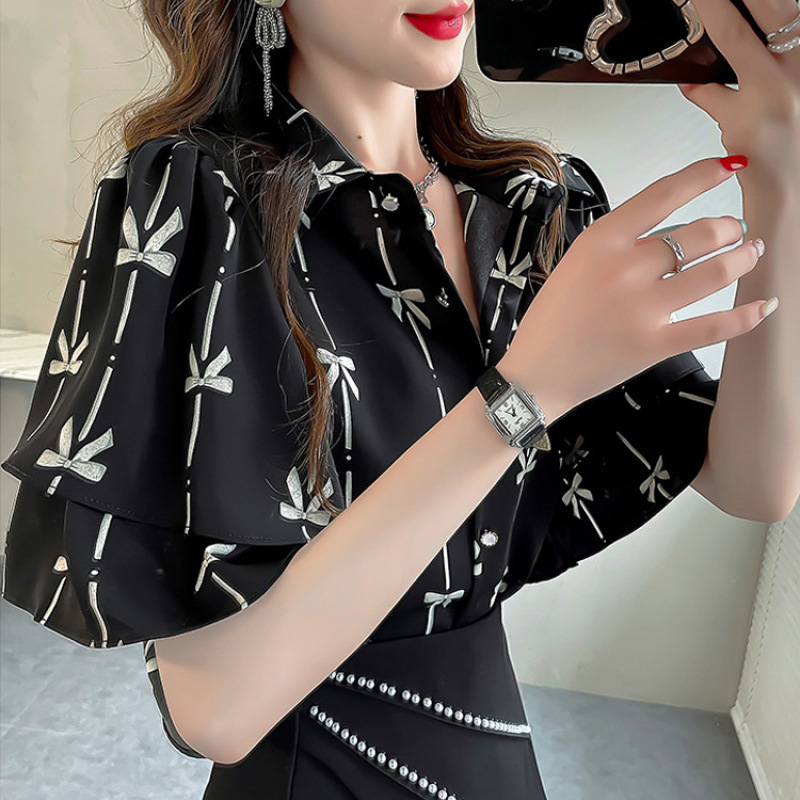 여성을위한 디자인 프릴 꽃 탑 새로운 반팔 스위트 블루 셔츠 여성 여름 느슨한 대형 꽃 셔츠
