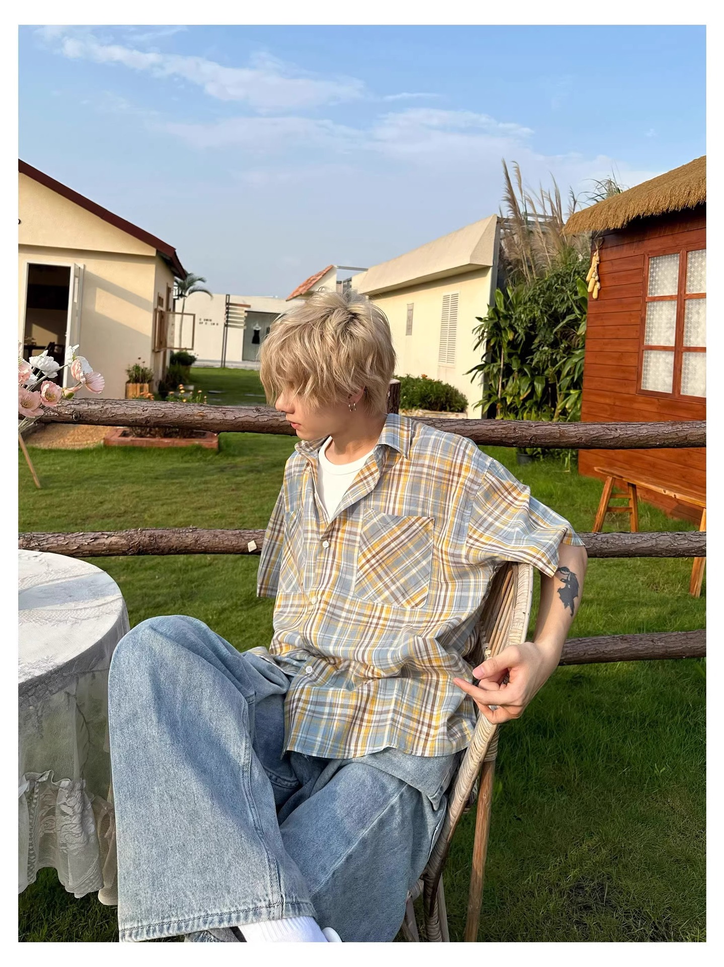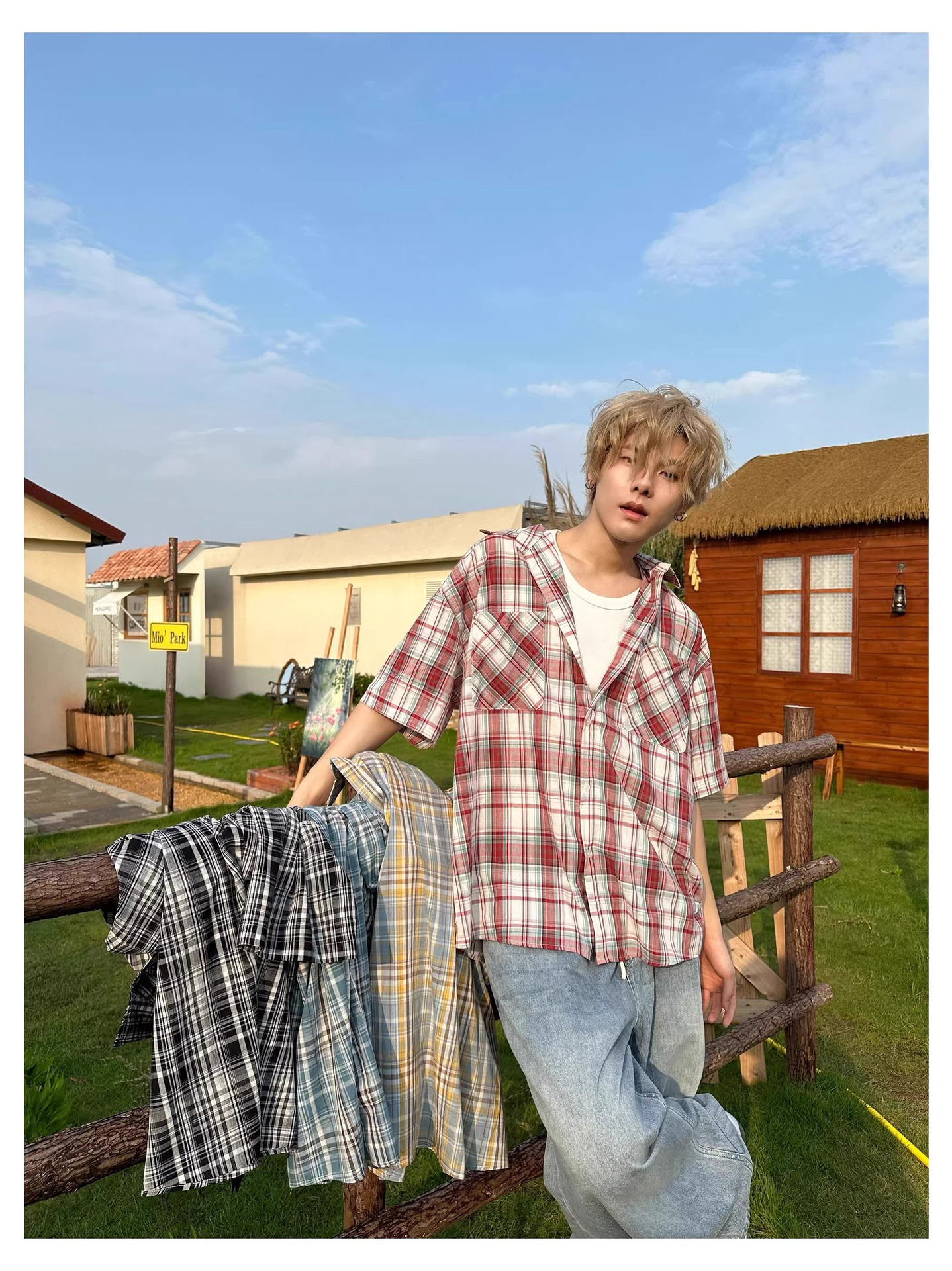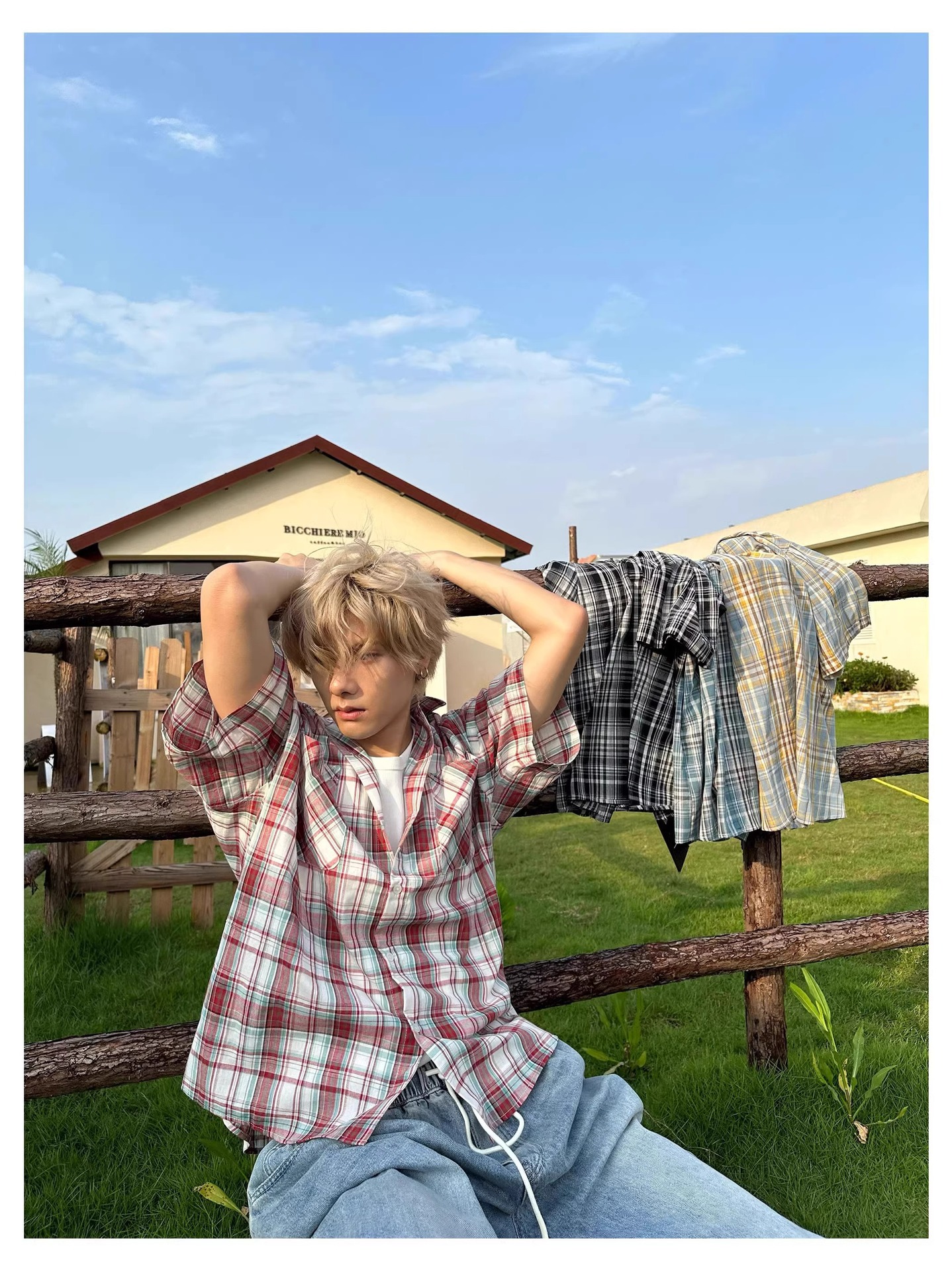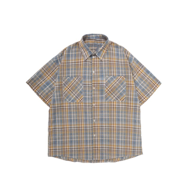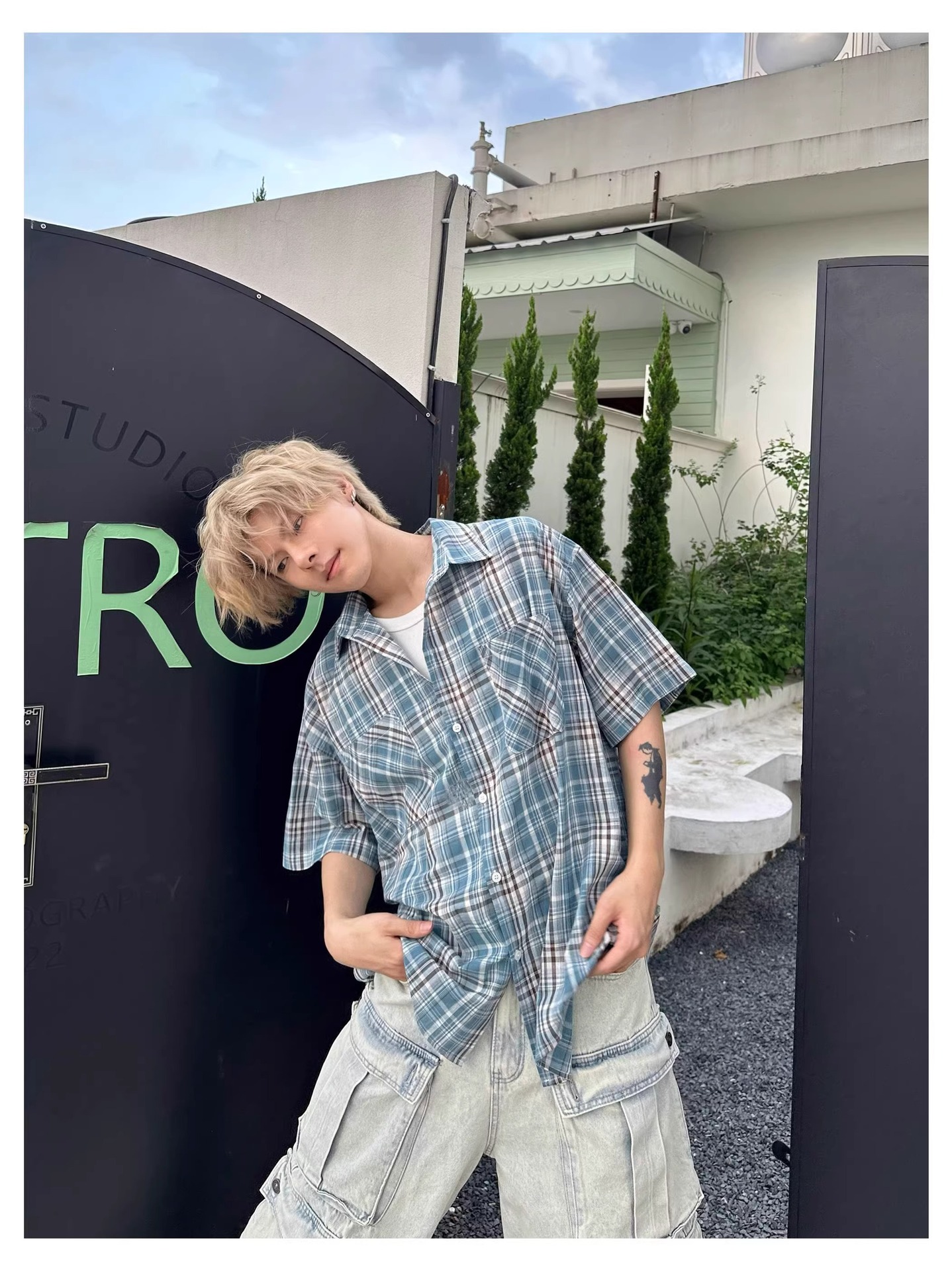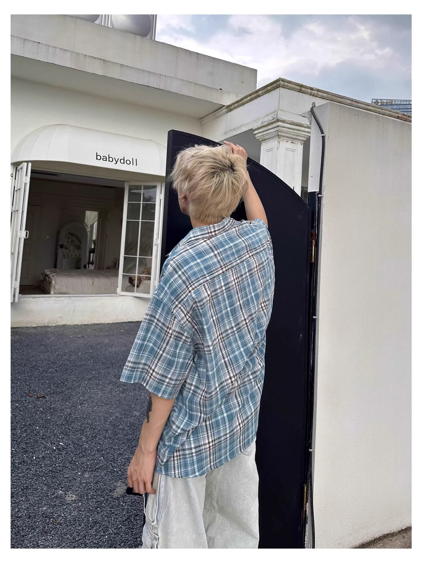 아메리칸 스타일 레트로 샌딩 플레이드 반팔 셔츠 남자 여름 새로운 느슨한 올매치 커플의 캐주얼 반소매 셔츠