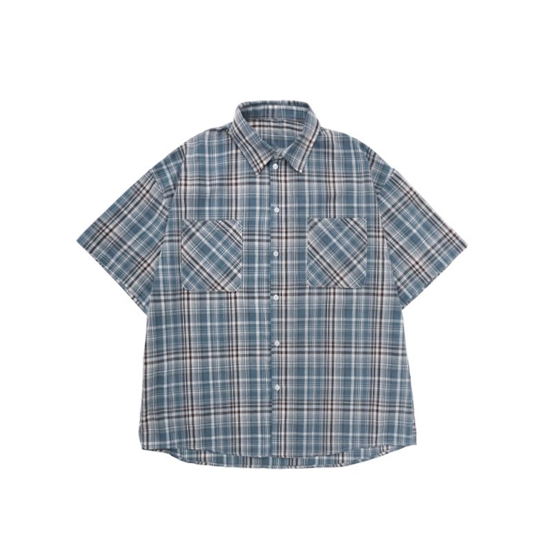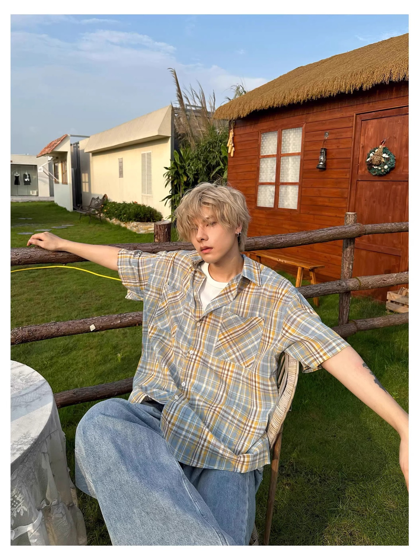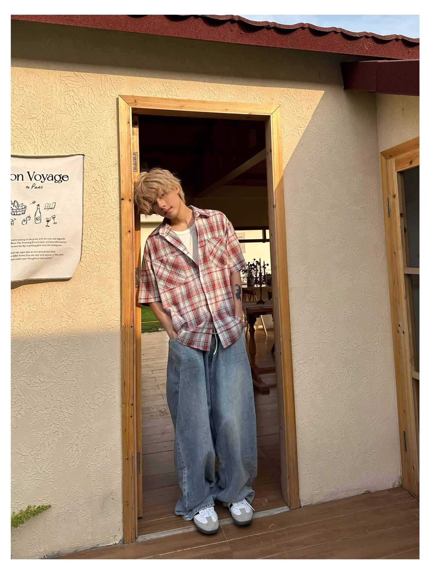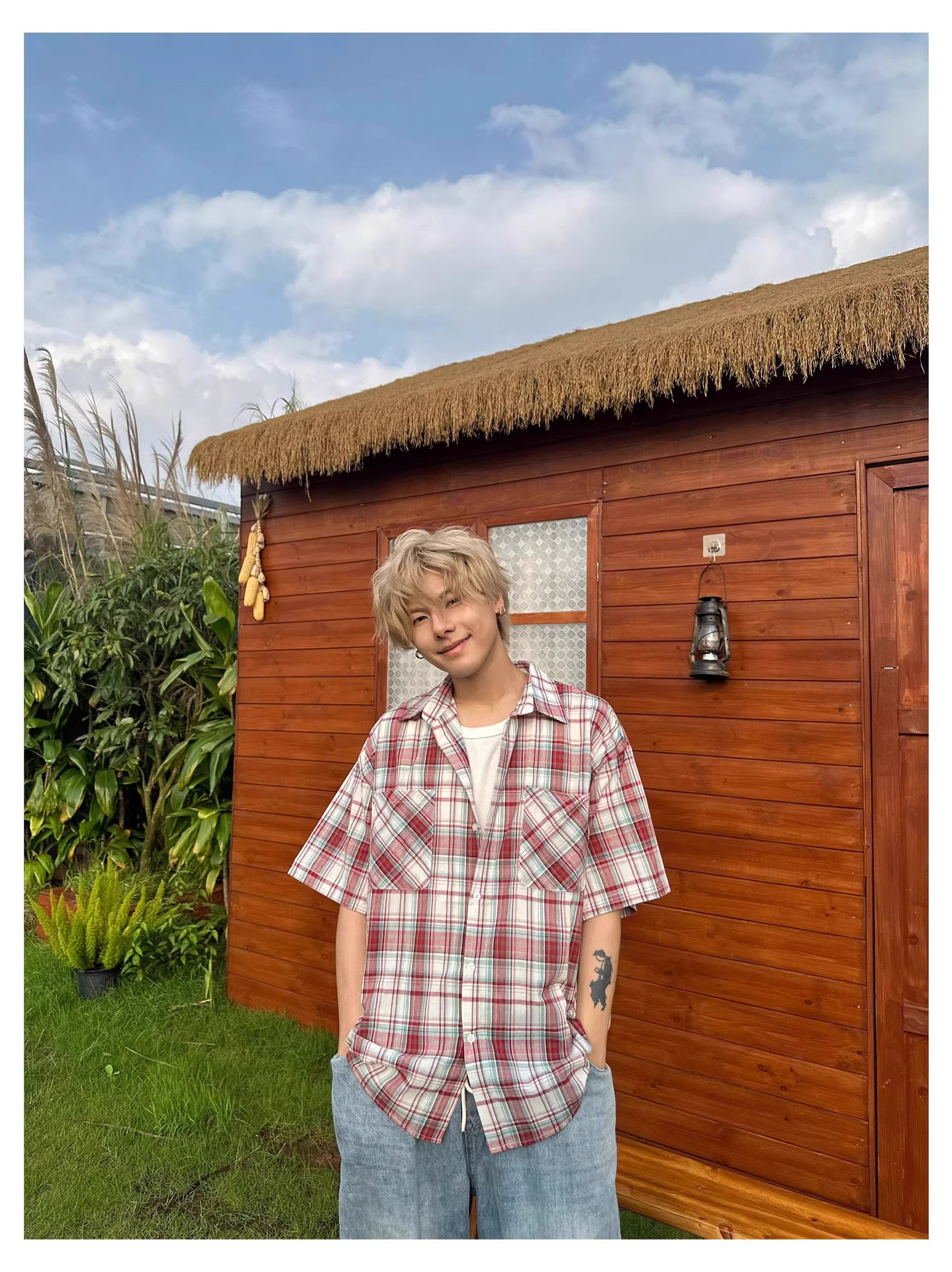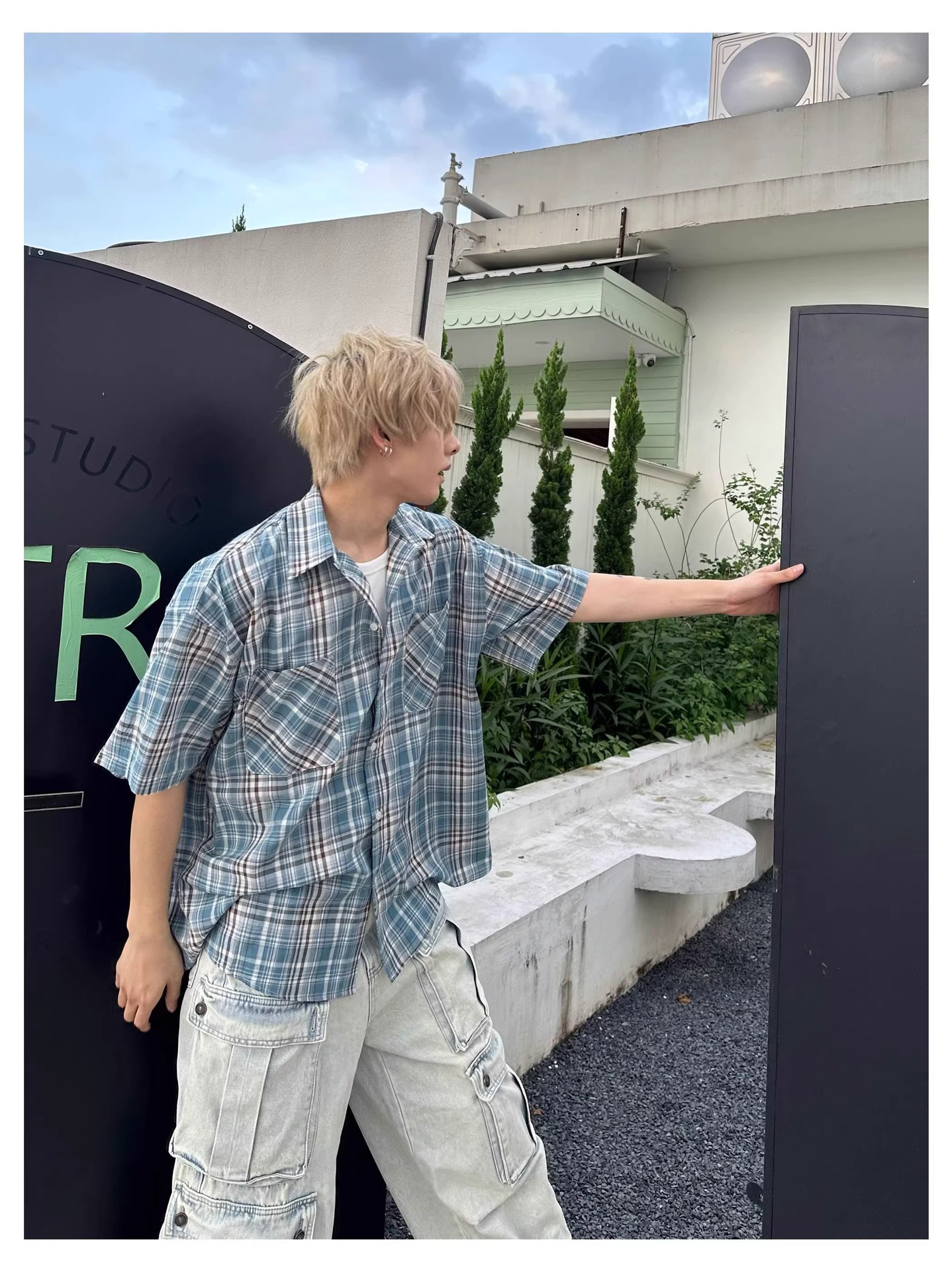 아메리칸 스타일 레트로 샌딩 플레이드 반팔 셔츠 남자 여름 새로운 느슨한 올매치 커플의 캐주얼 반소매 셔츠