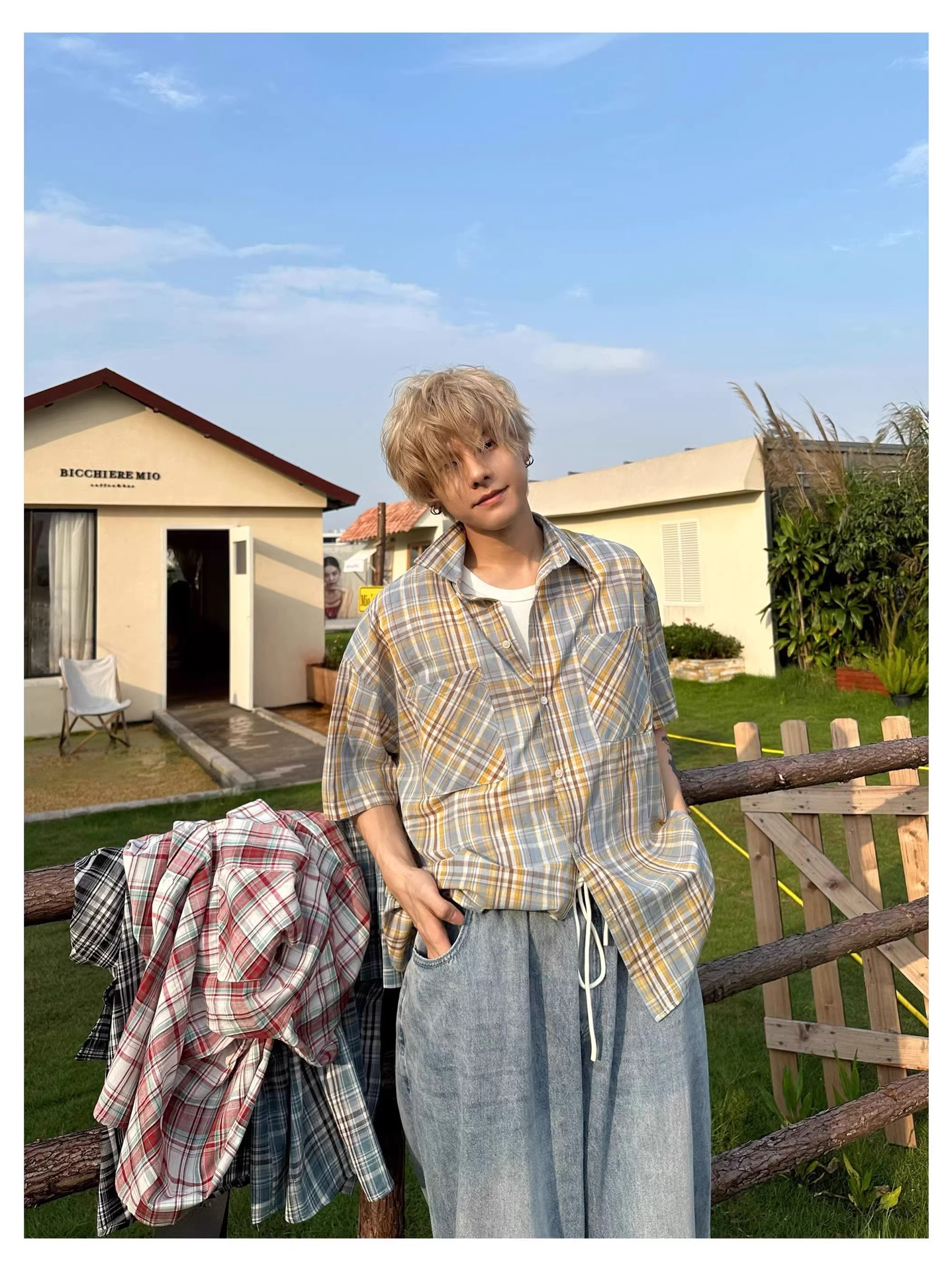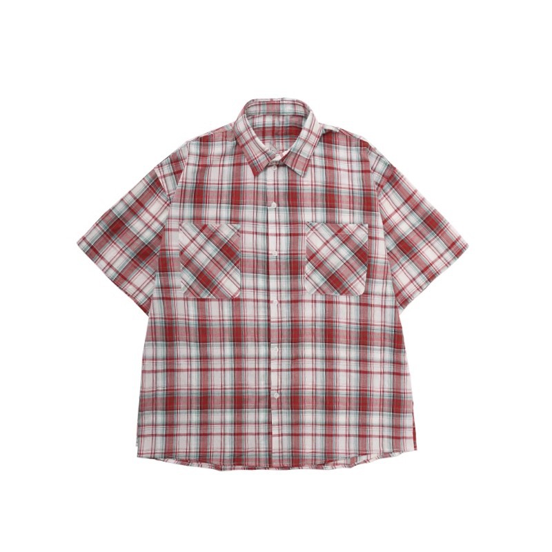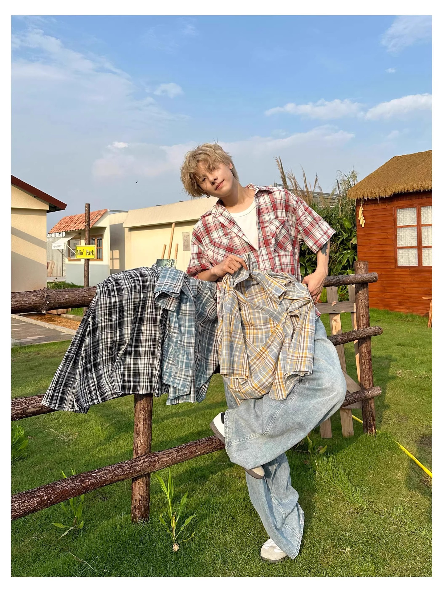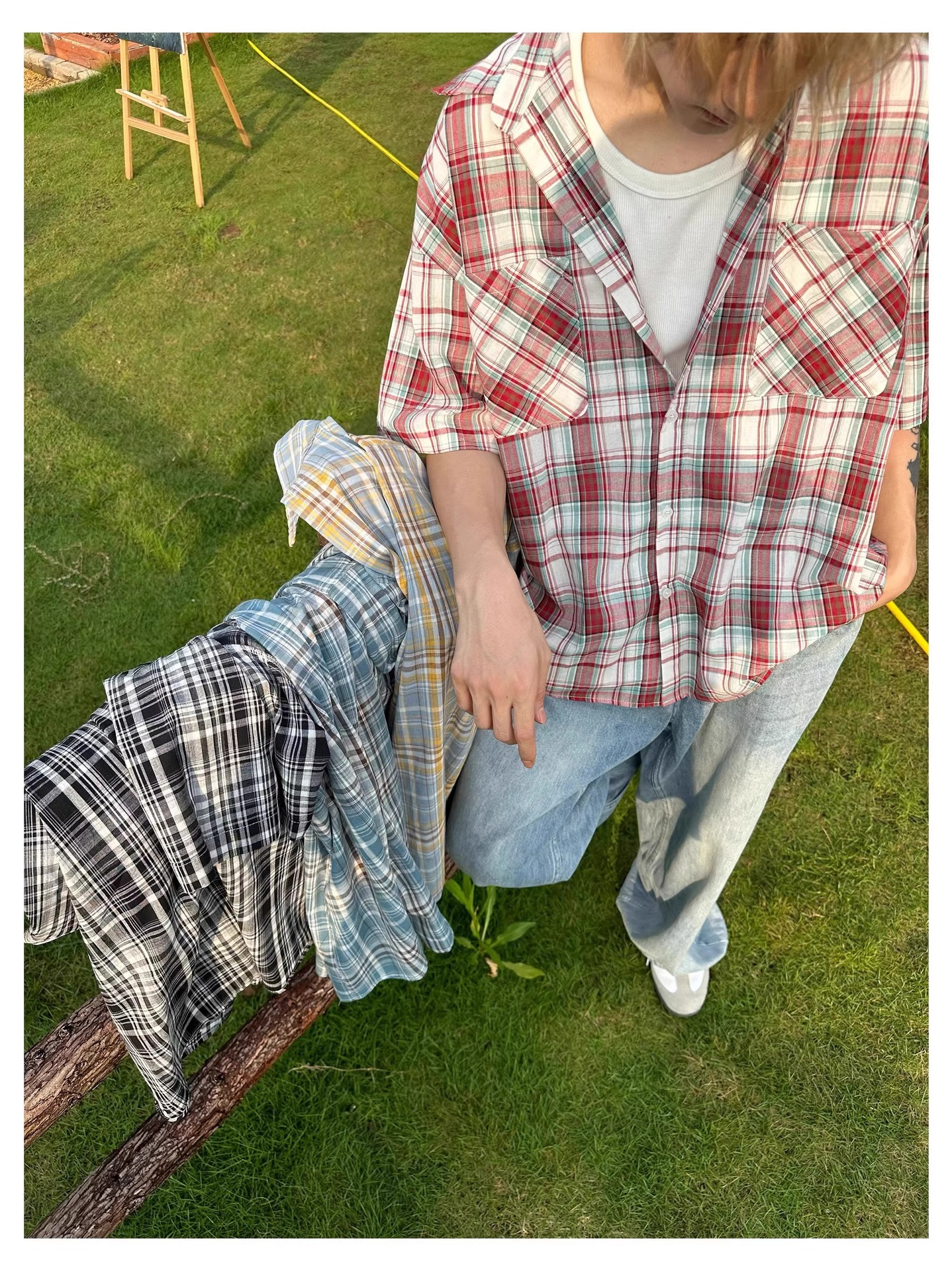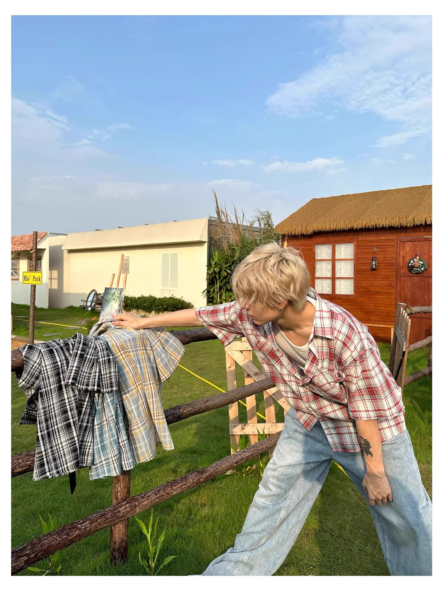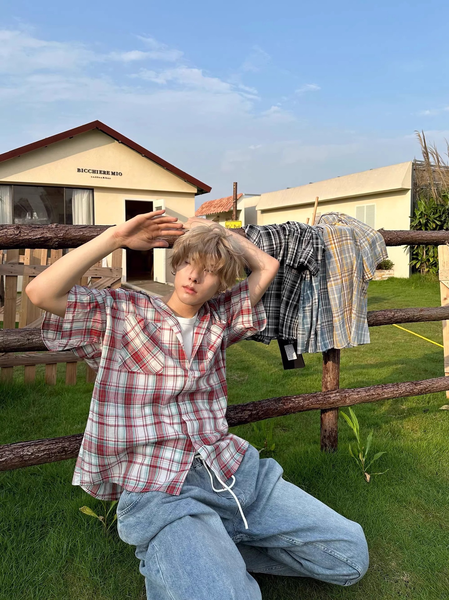 아메리칸 스타일 레트로 샌딩 플레이드 반팔 셔츠 남자 여름 새로운 느슨한 올매치 커플의 캐주얼 반소매 셔츠