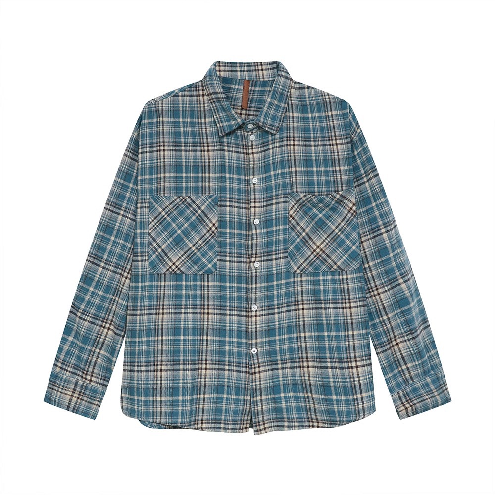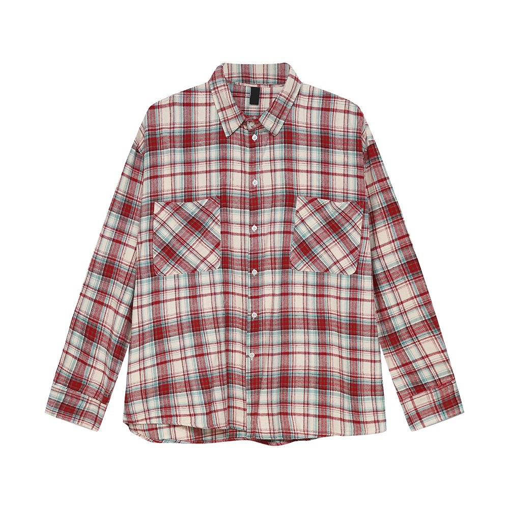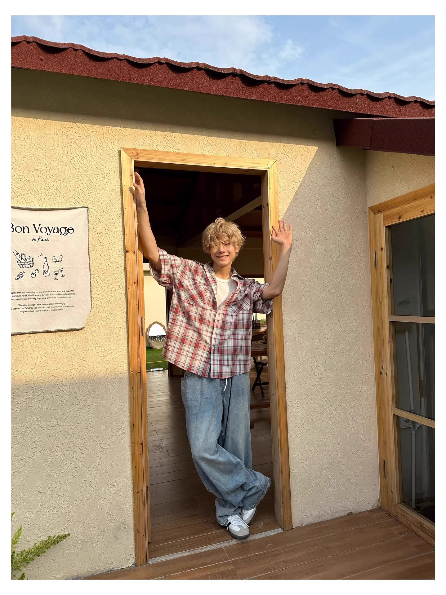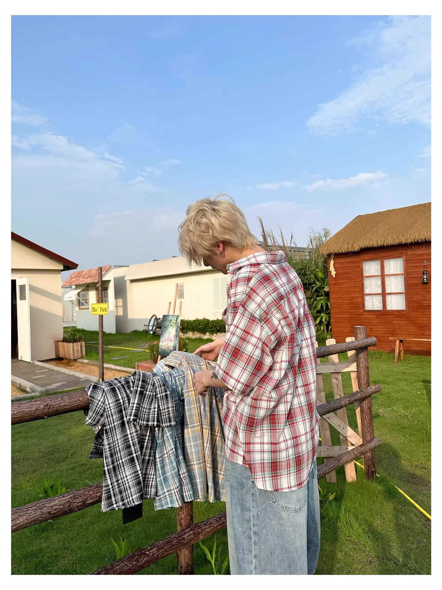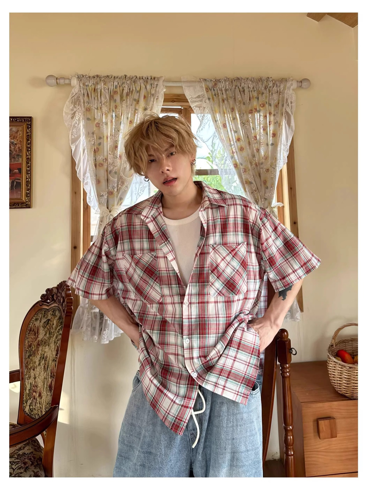 아메리칸 스타일 레트로 샌딩 플레이드 반팔 셔츠 남자 여름 새로운 느슨한 올매치 커플의 캐주얼 반소매 셔츠