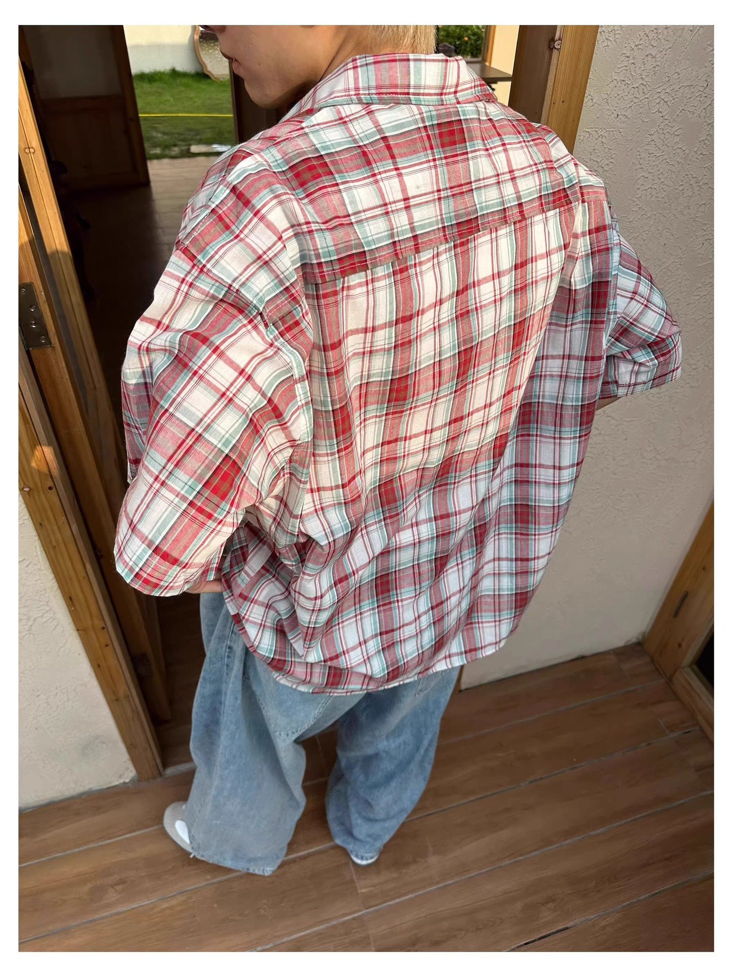 아메리칸 스타일 레트로 샌딩 플레이드 반팔 셔츠 남자 여름 새로운 느슨한 올매치 커플의 캐주얼 반소매 셔츠스토어 가기