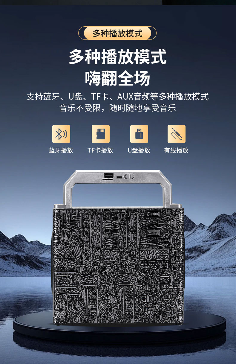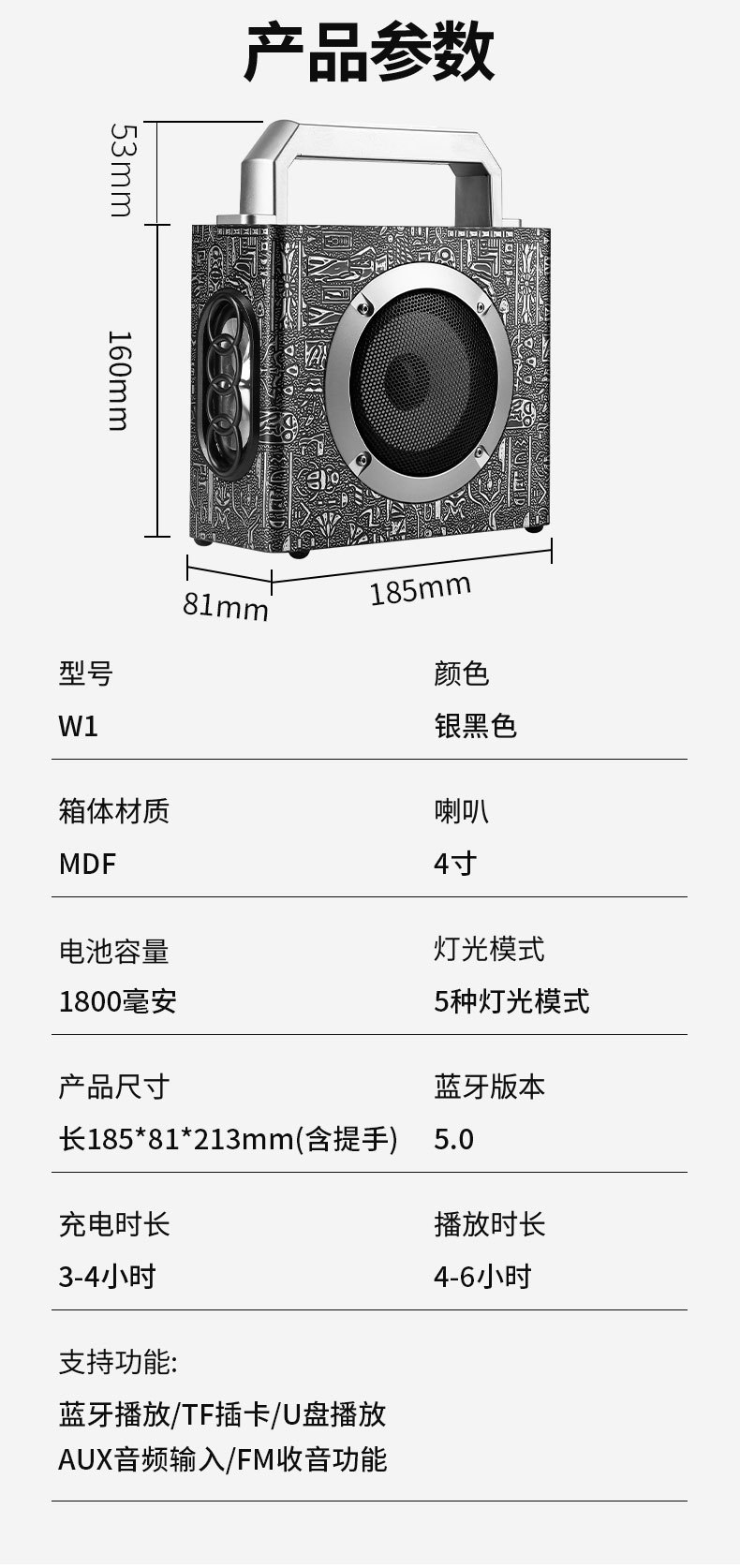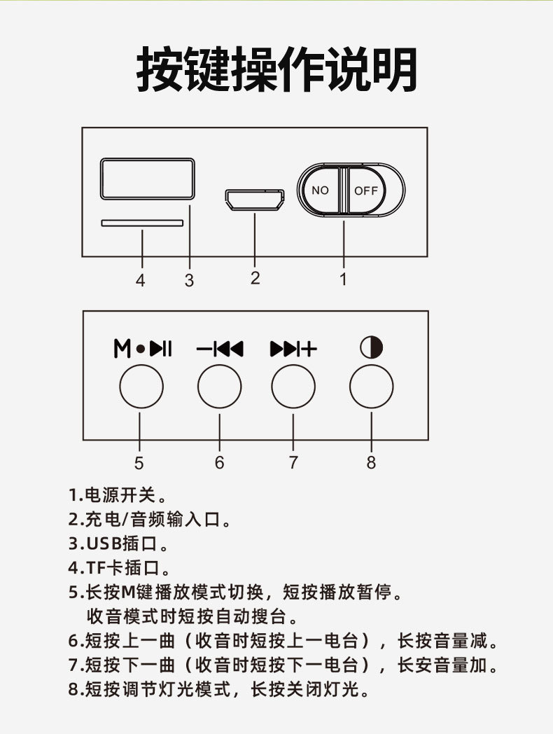 功能:蓝牙、音频线输入、TF卡、U盘、收音机(有收音机功能但是不强,搜台效果根据信号决定,可能搜不到台或者至多搜到1个台,介意勿拍)