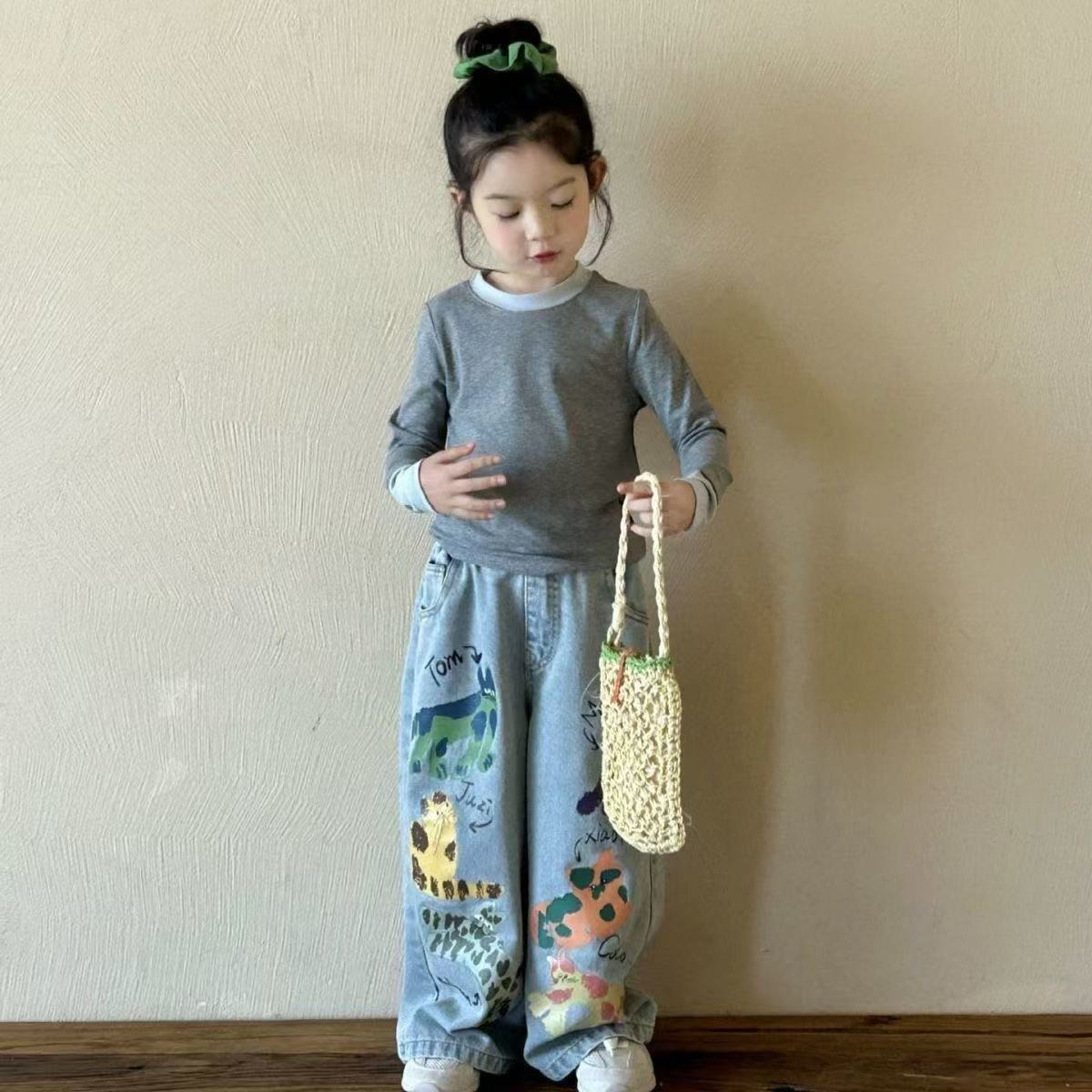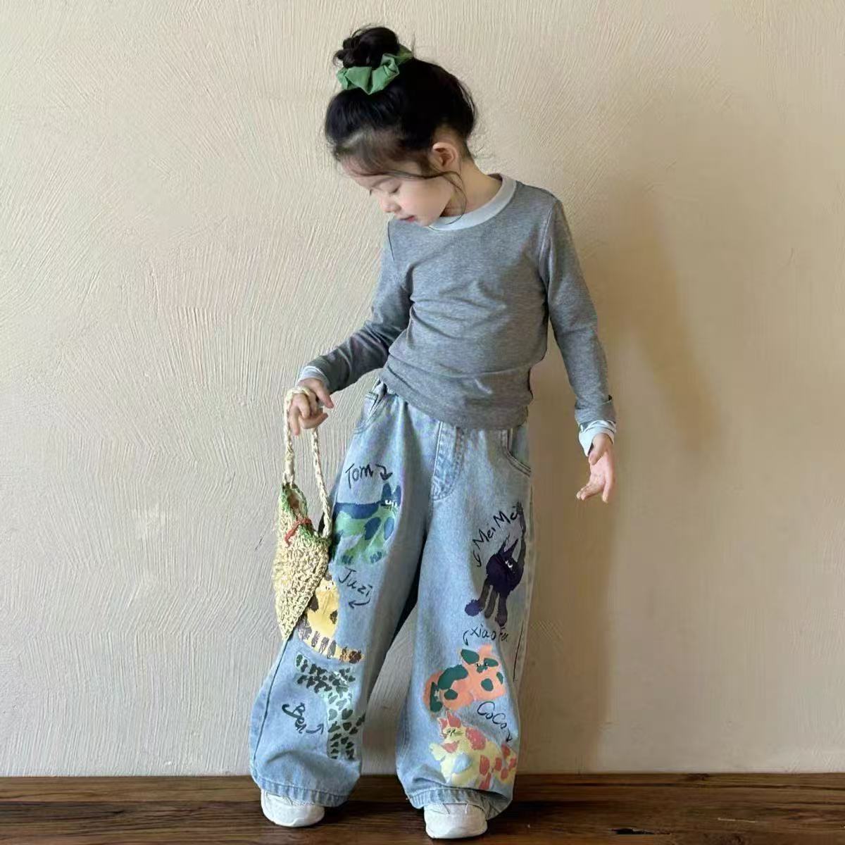 2025 봄 아동복 여아 투피스 스타일 이너웨어 그래피티 프린트 데님 팬츠 스트레이트 팬츠 한국 스타일 트렌디 아동복