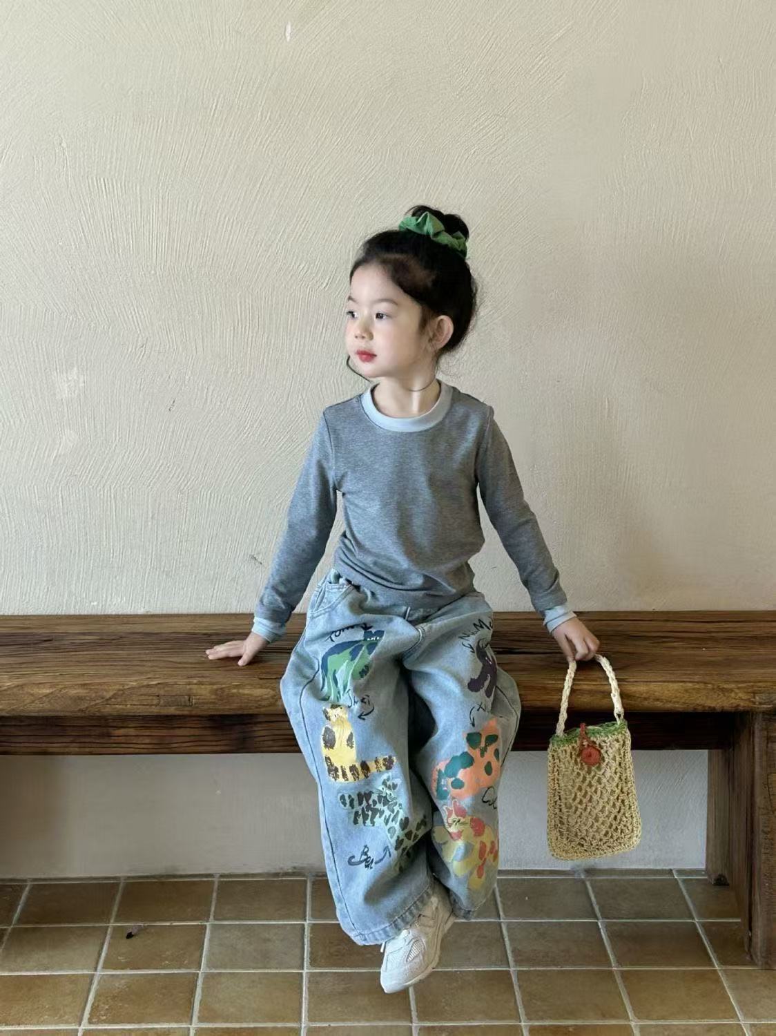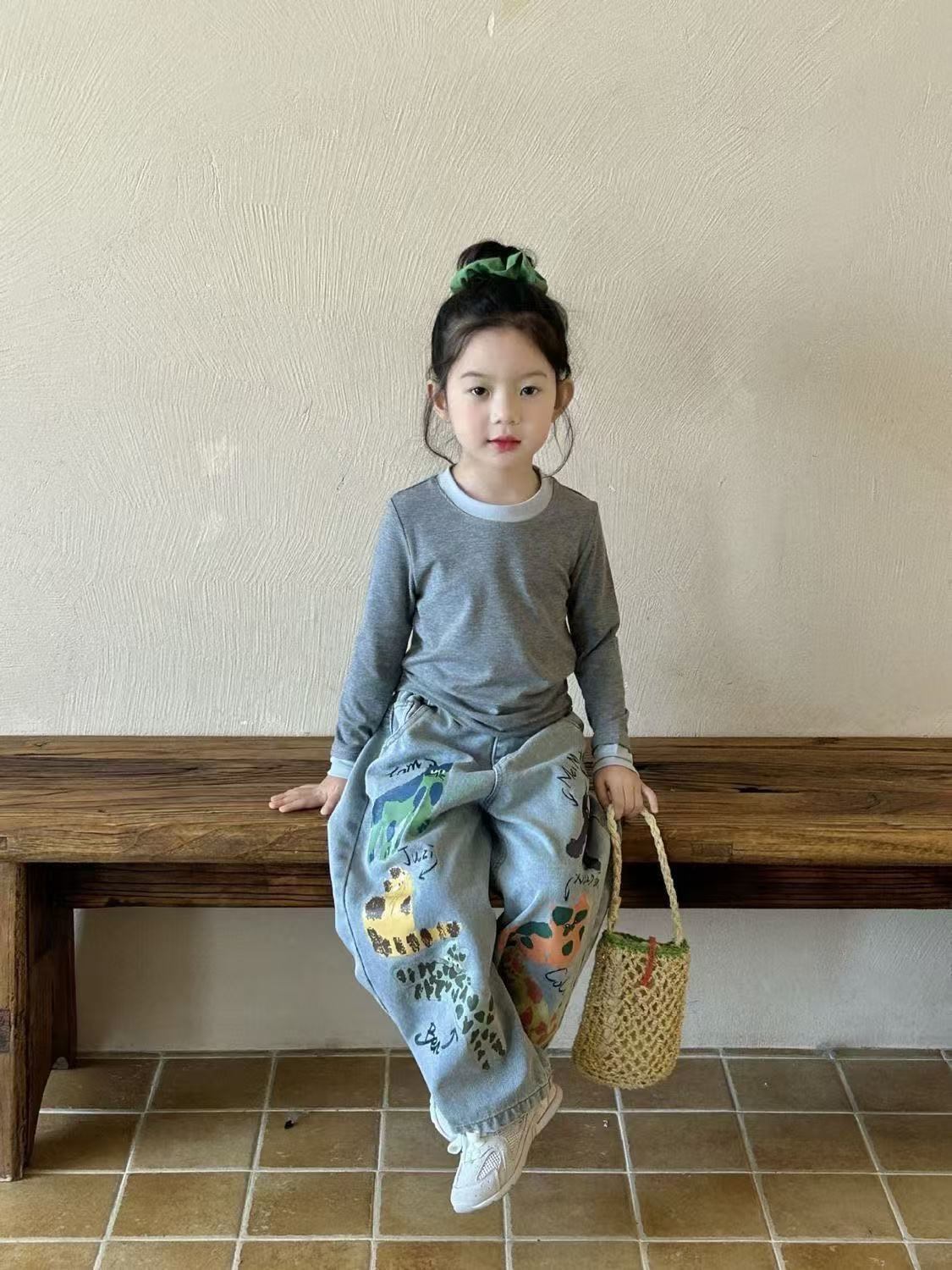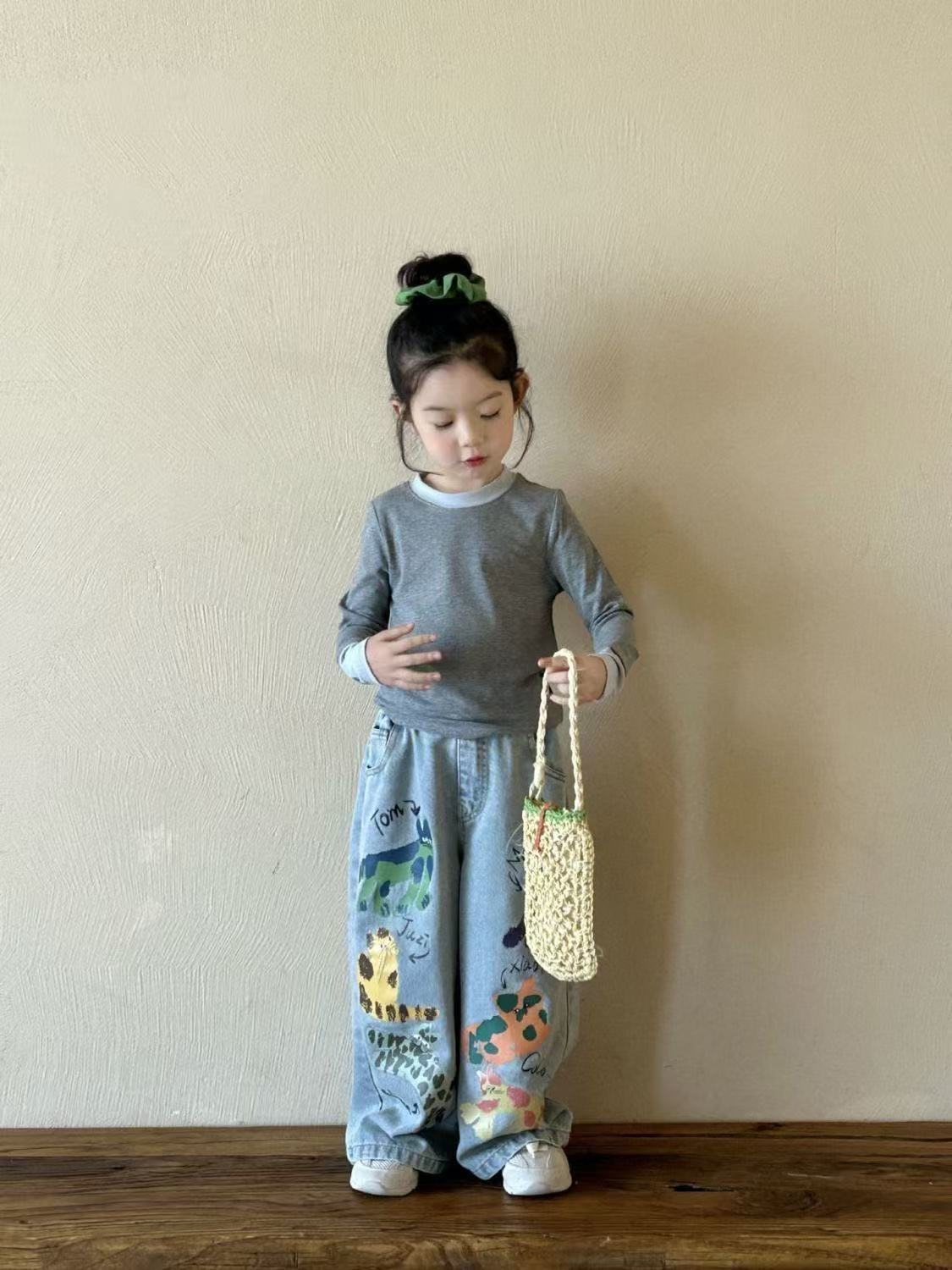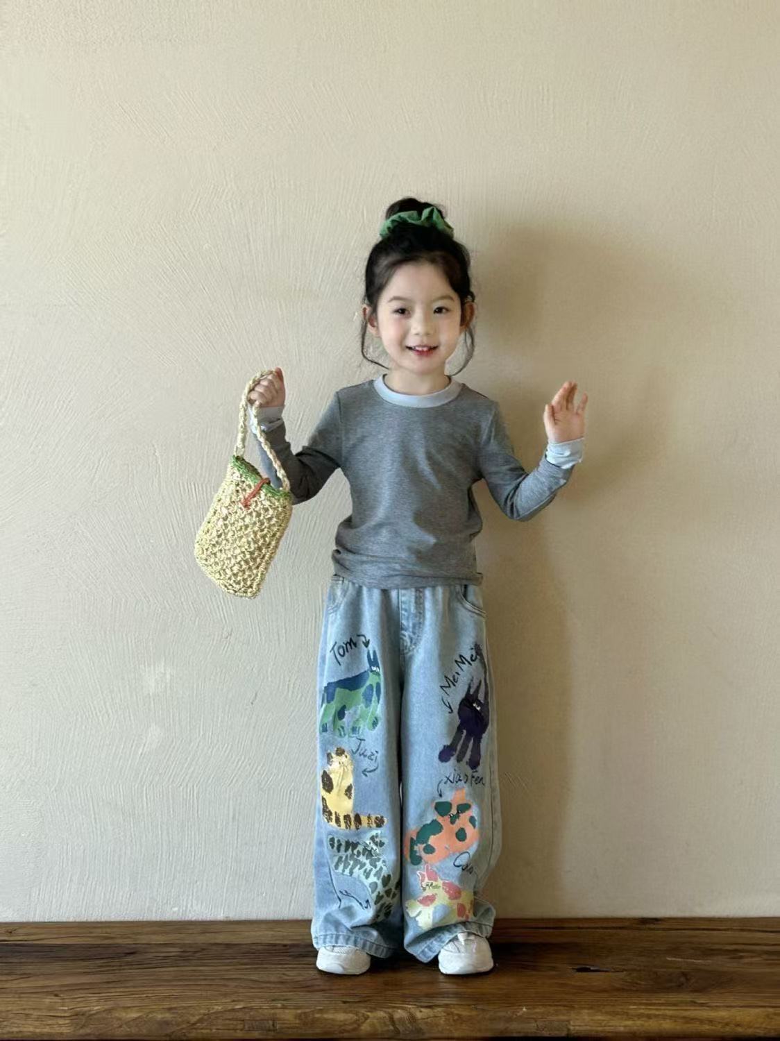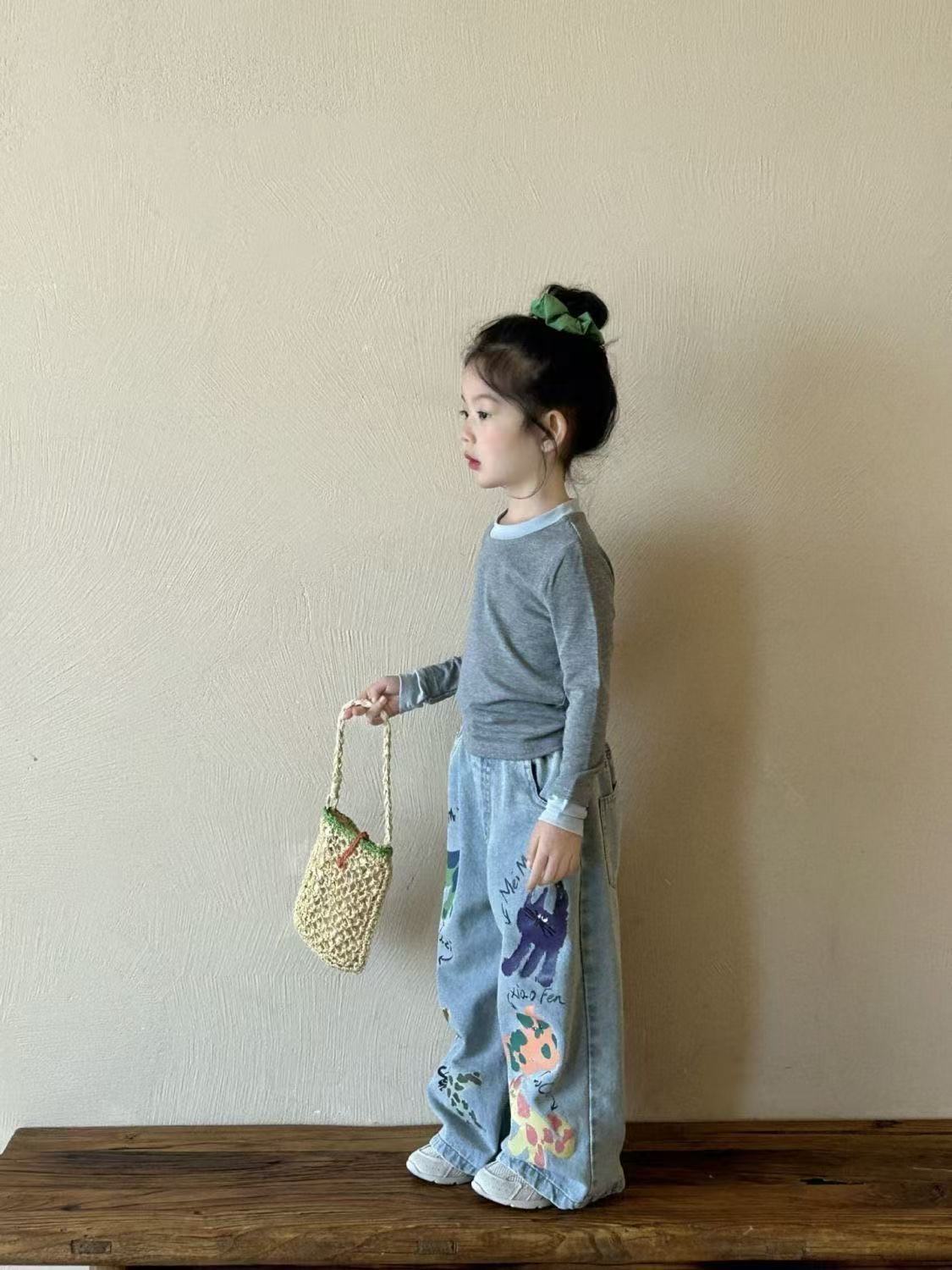 2025 봄 아동복 여아 투피스 스타일 이너웨어 그래피티 프린트 데님 팬츠 스트레이트 팬츠 한국 스타일 트렌디 아동복스토어 가기