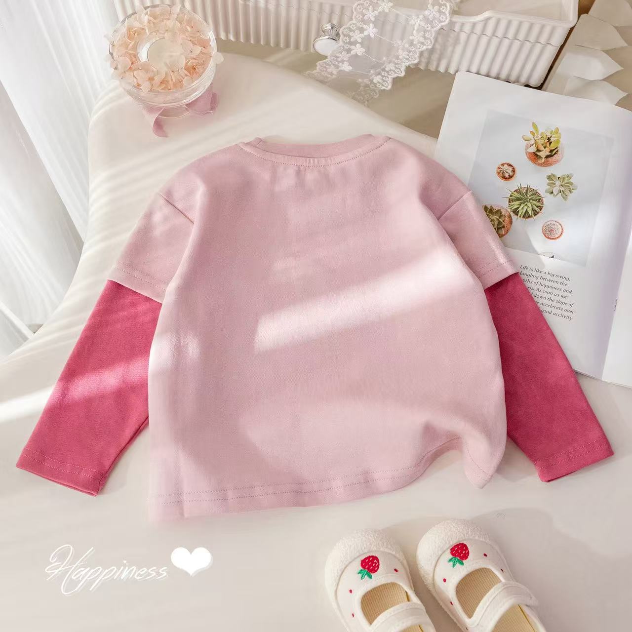 100% 면 소녀베이스 셔츠 가짜 투피스 긴팔 티셔츠 아기 최고 중소형 어린이 둥근 목 느슨한 한국 카드스토어 가기