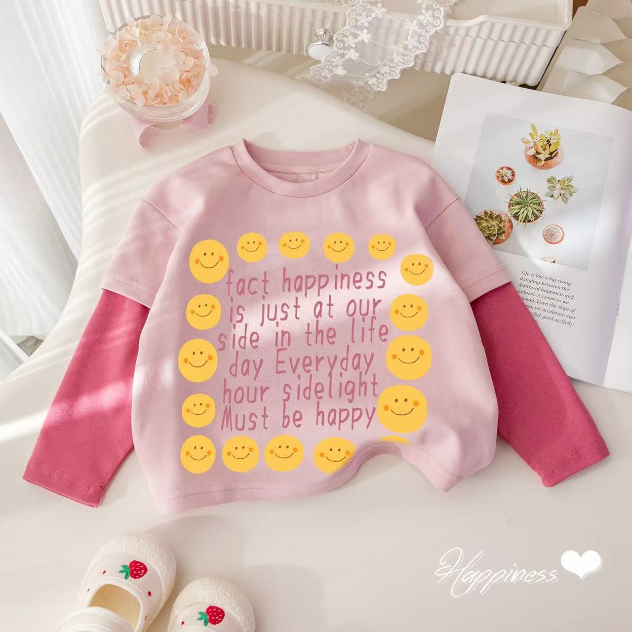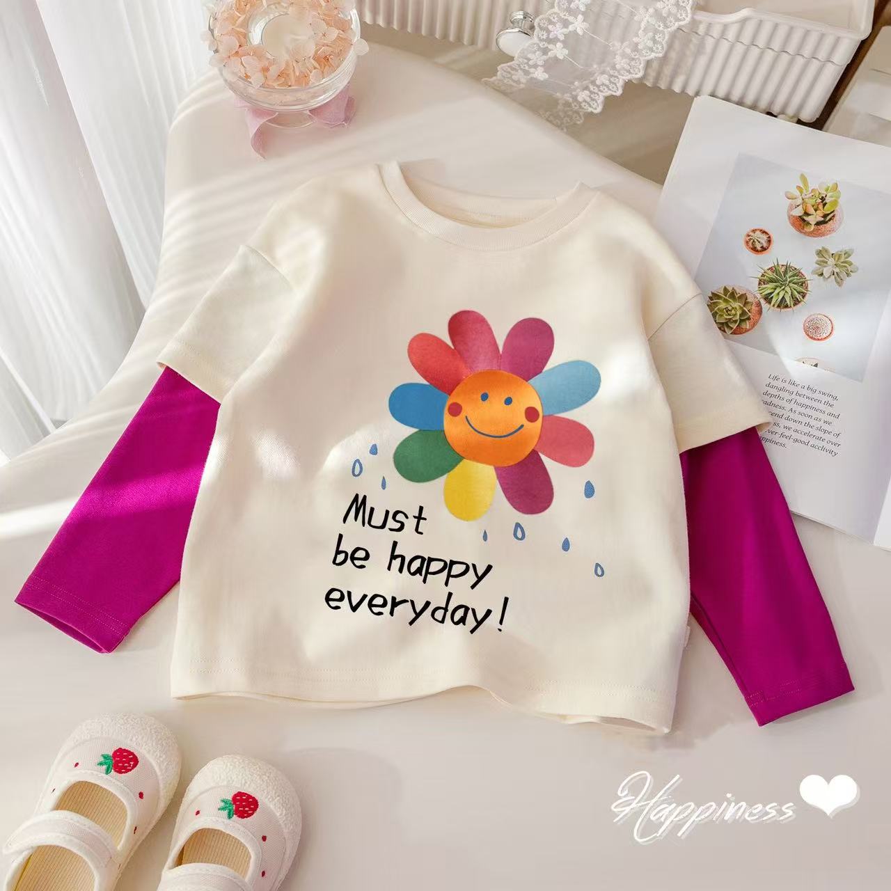 100% 면 소녀베이스 셔츠 가짜 투피스 긴팔 티셔츠 아기 최고 중소형 어린이 둥근 목 느슨한 한국 카드