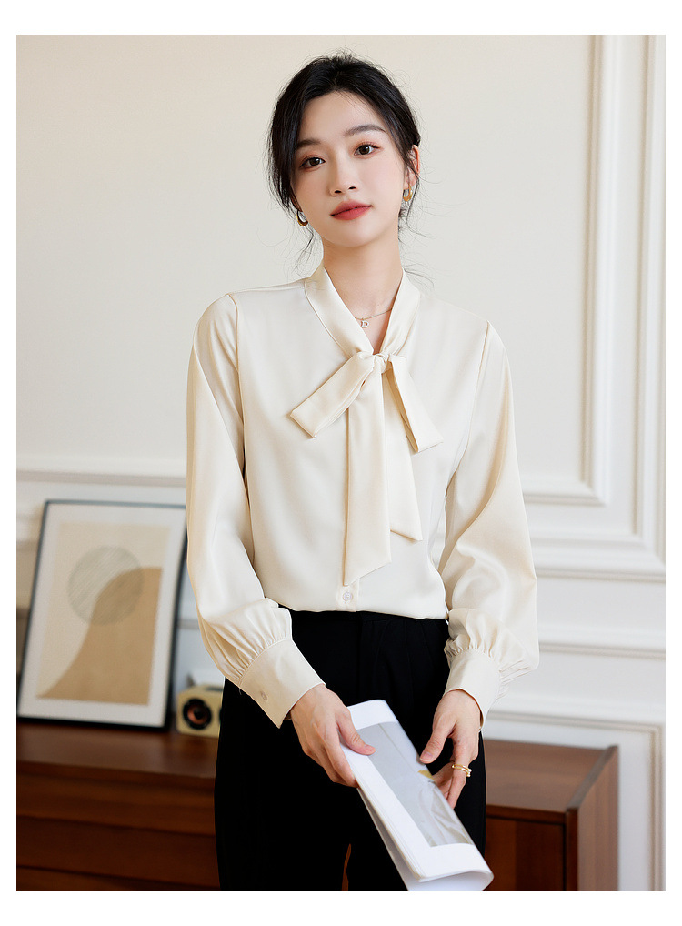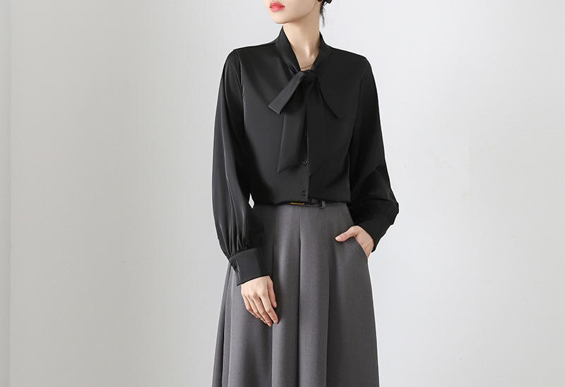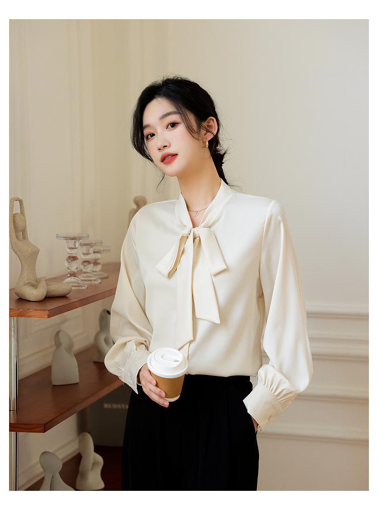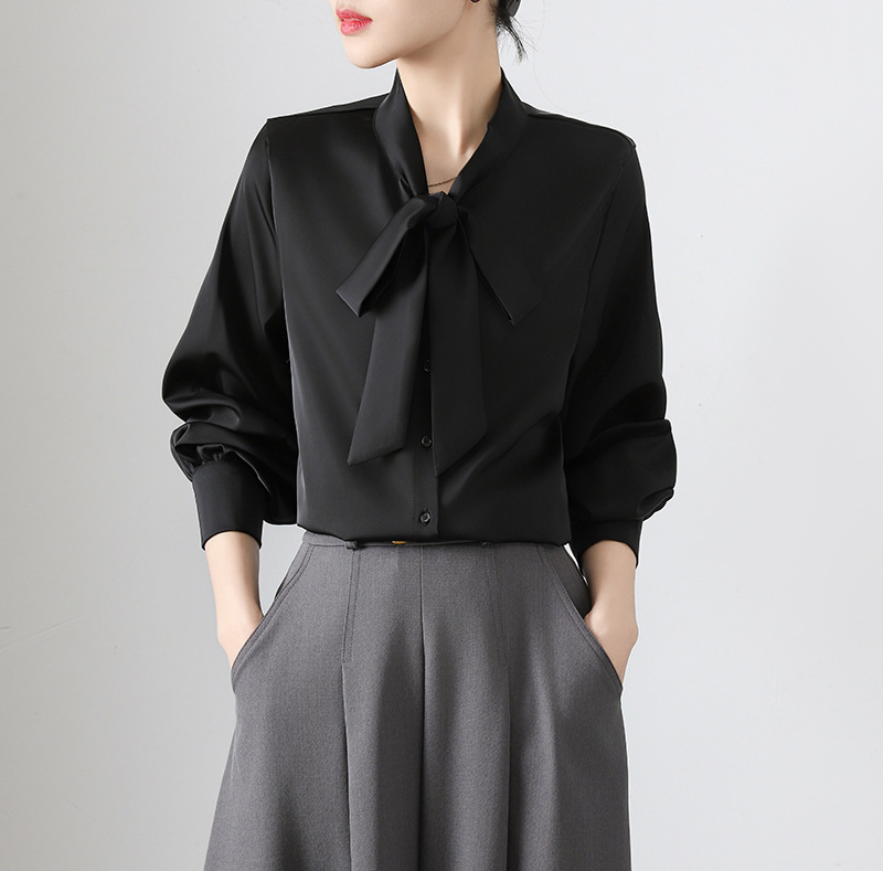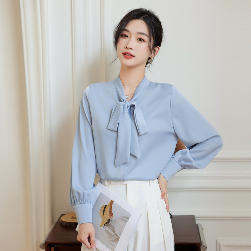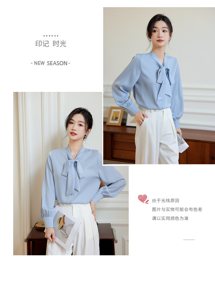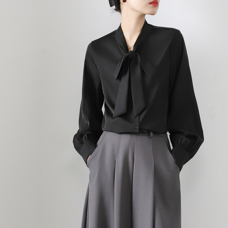 리얼샷 새틴 기질 쉬폰 셔츠 초가을 긴팔 통근 전문 셔츠 기질 리본 탑스토어 가기