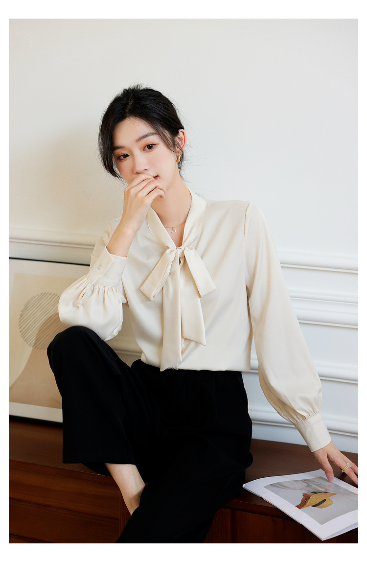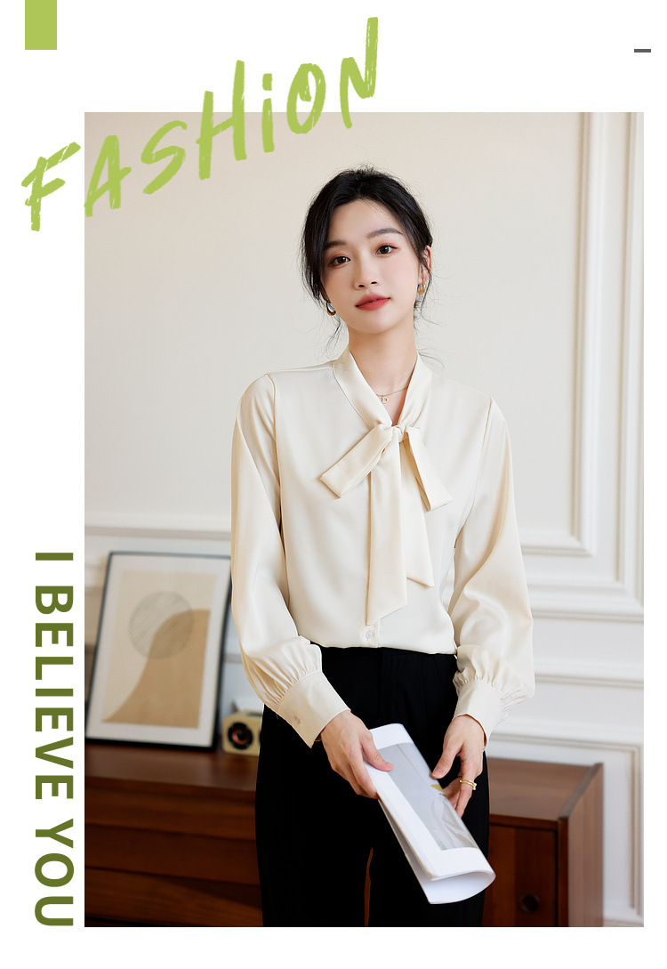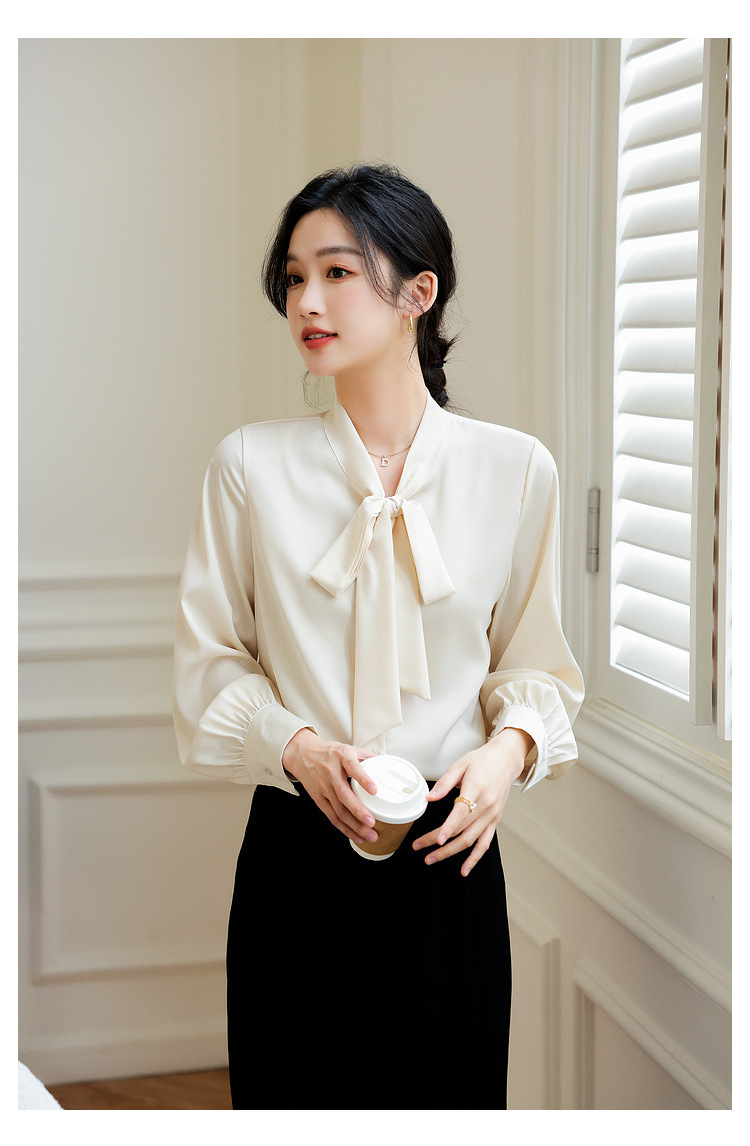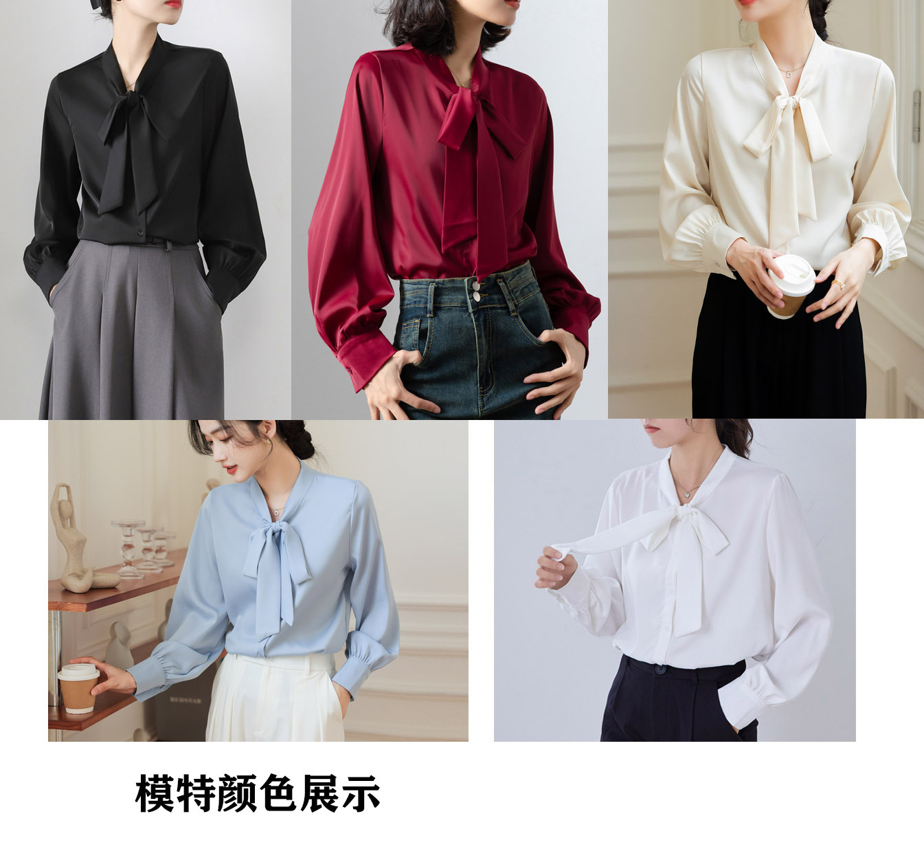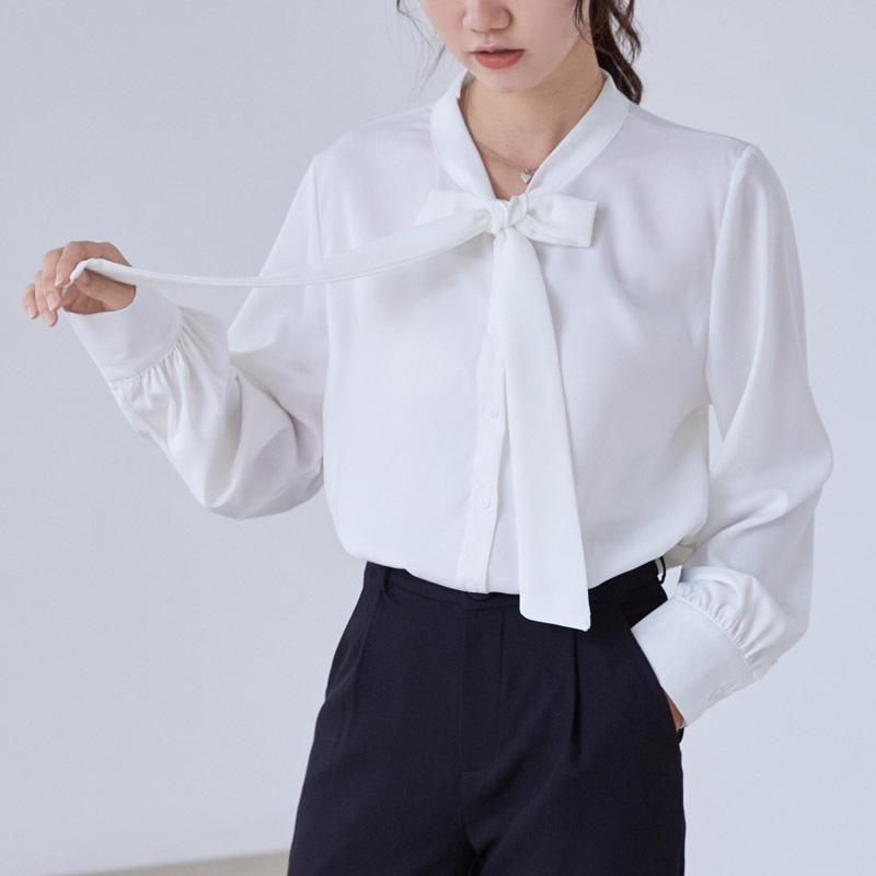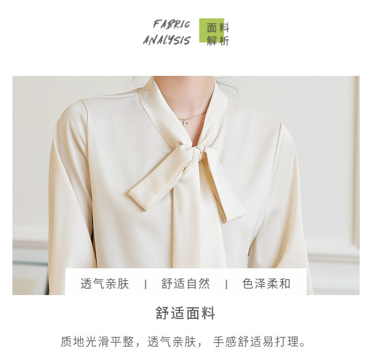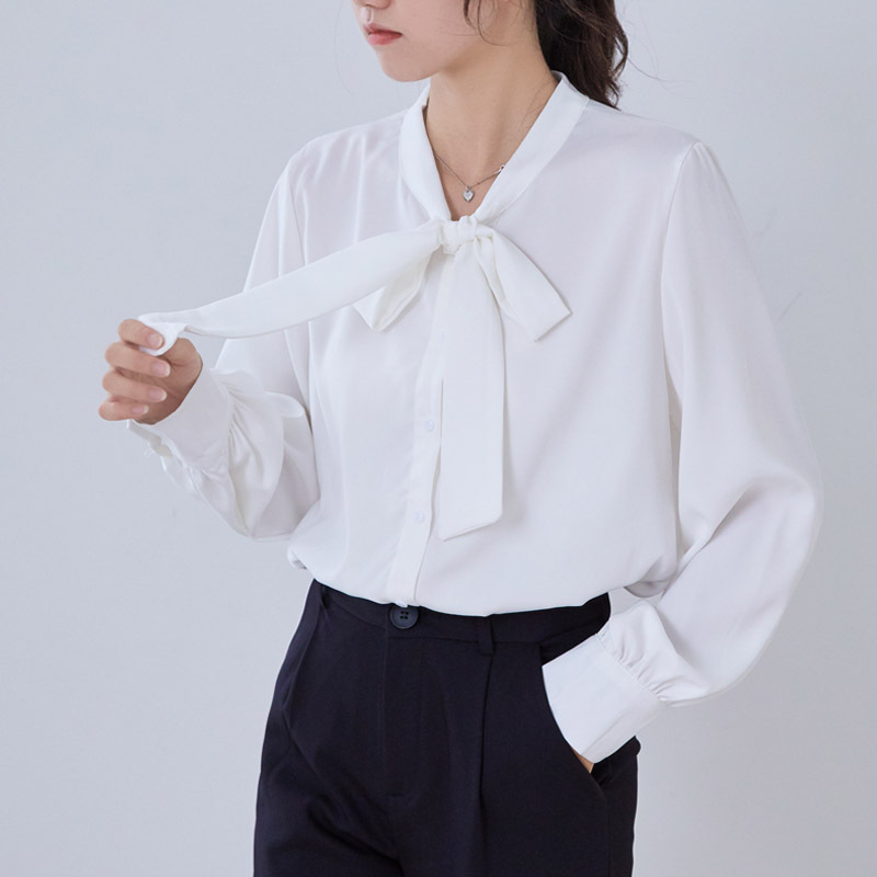 리얼샷 새틴 기질 쉬폰 셔츠 초가을 긴팔 통근 전문 셔츠 기질 리본 탑