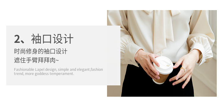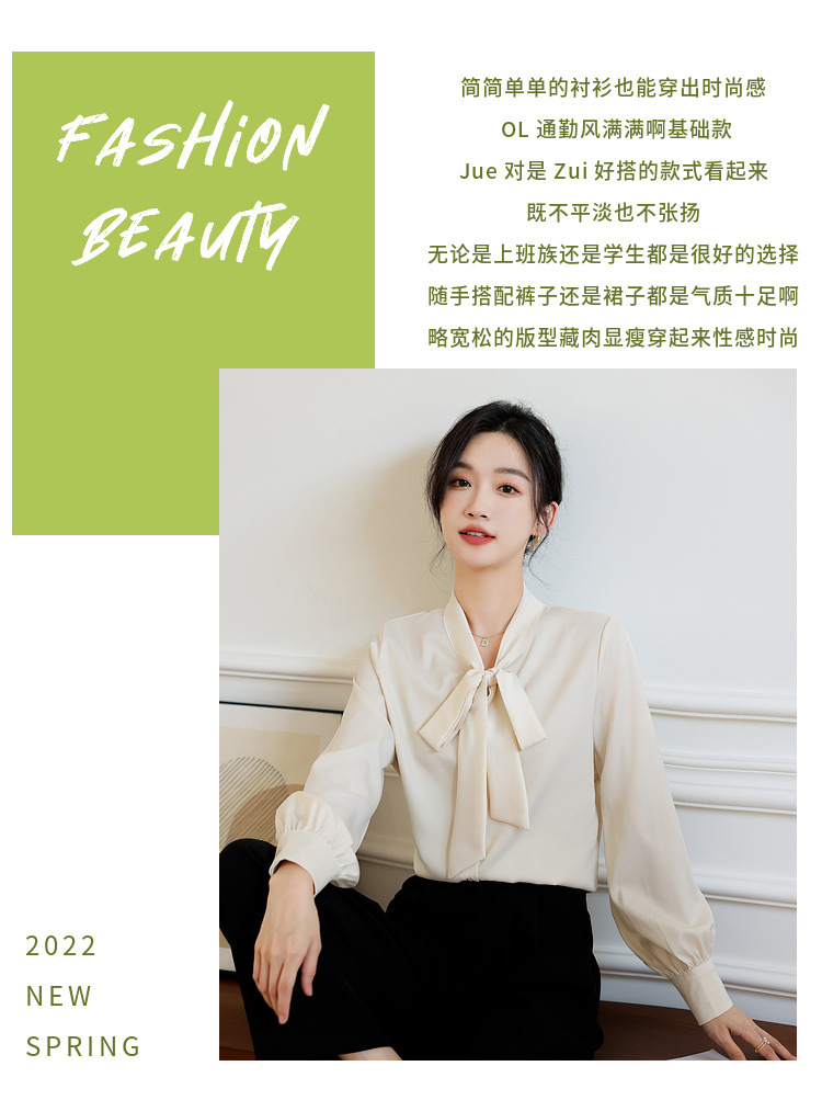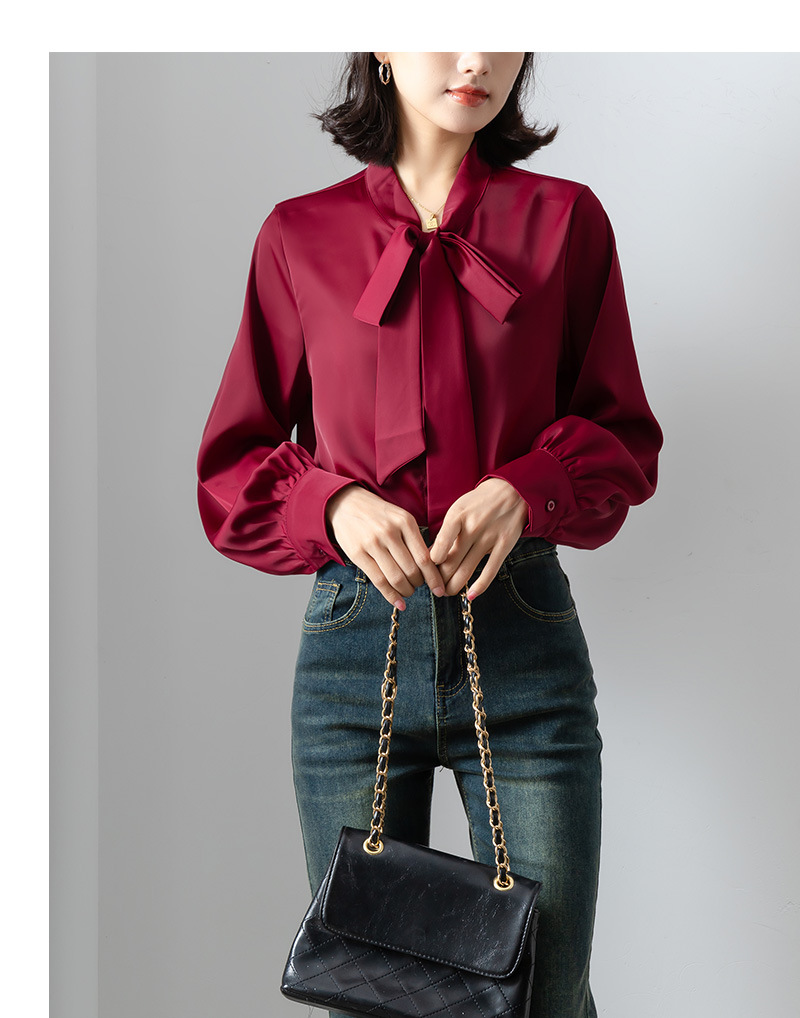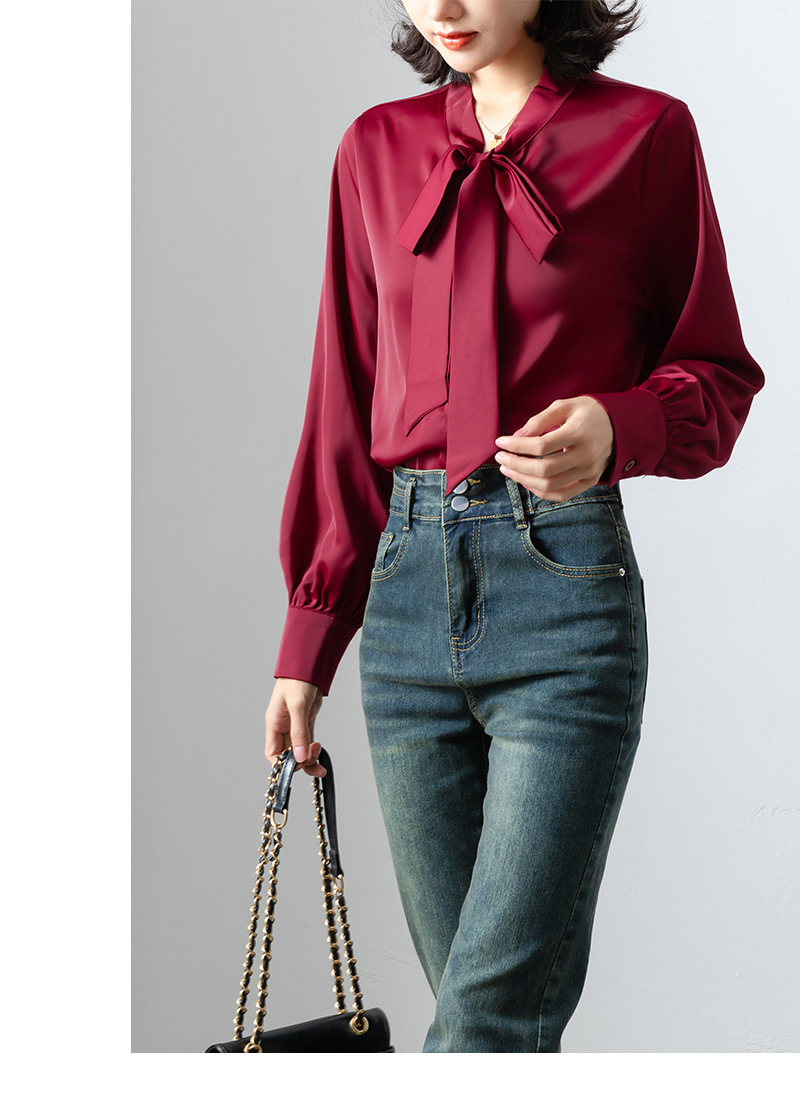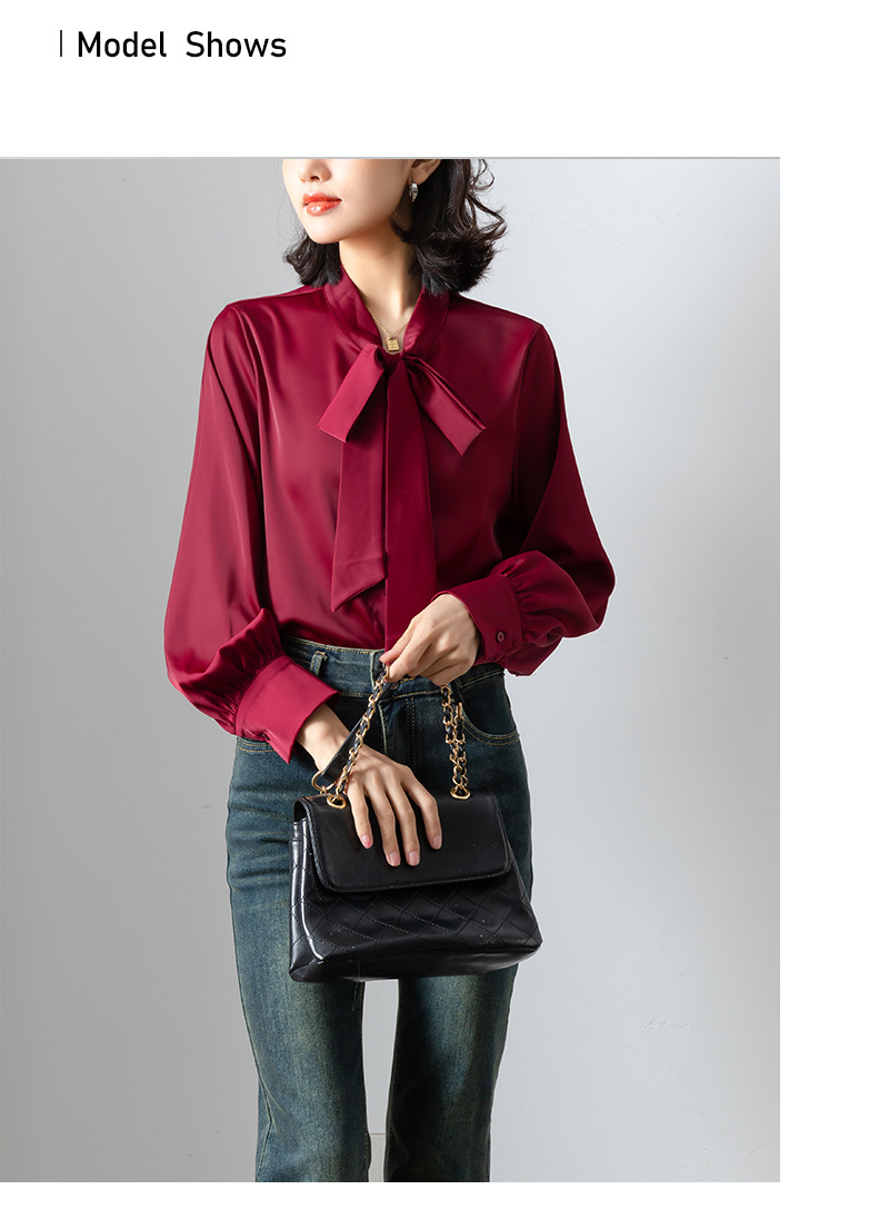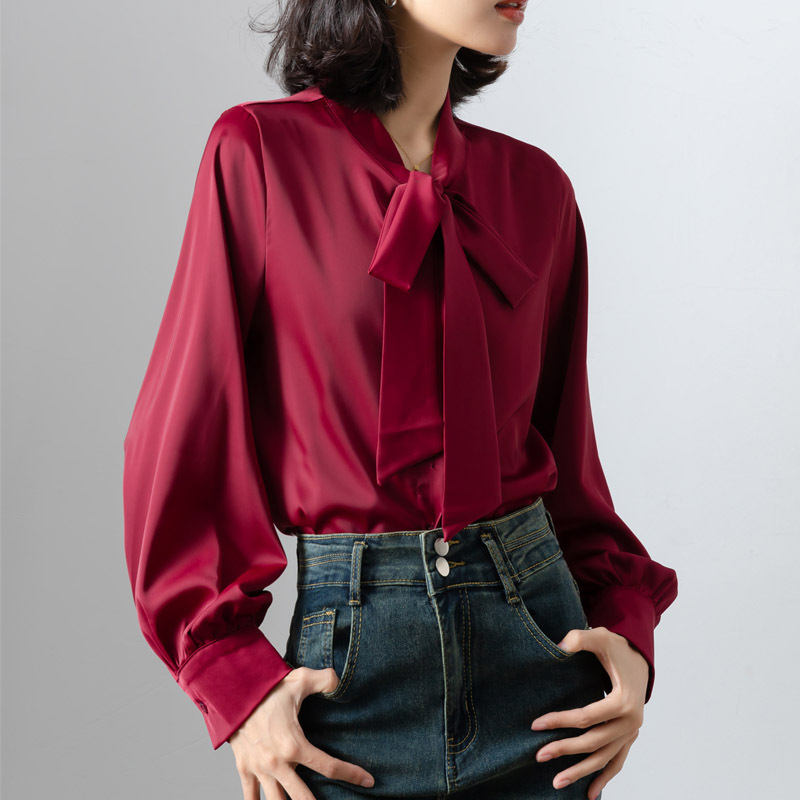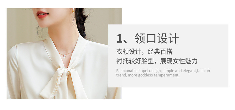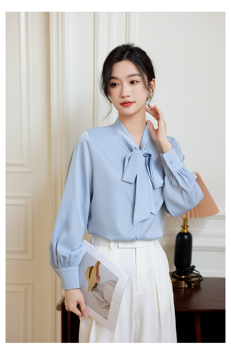 리얼샷 새틴 기질 쉬폰 셔츠 초가을 긴팔 통근 전문 셔츠 기질 리본 탑
