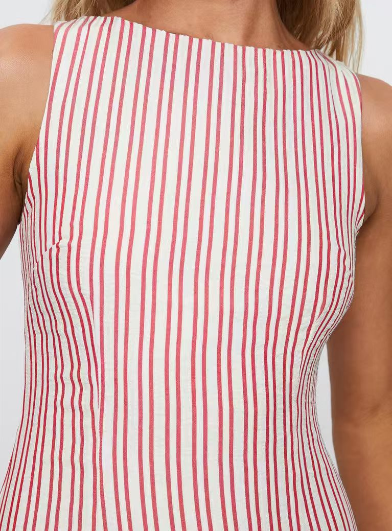 유럽과 미국의 줄무늬 2024 봄 여름 새로운 라운드 넥 틈새 민소매 다용도 얇은 드레스는 신선하고 슬림합니다.