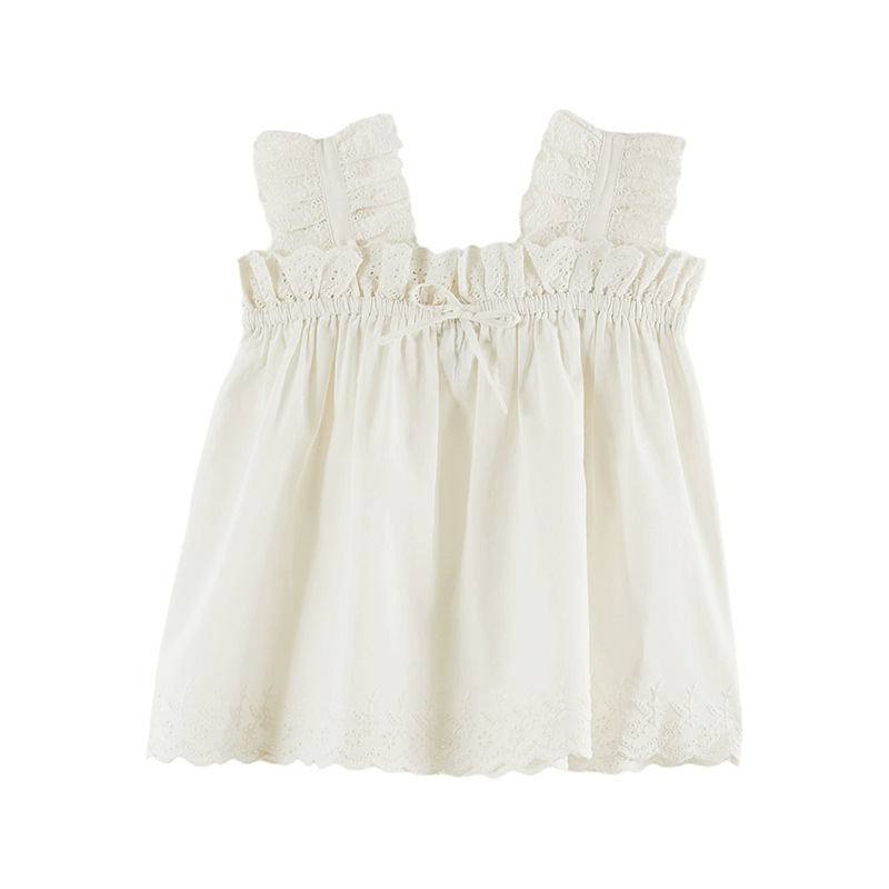 어린이 톱 2025 여름 EM 목회 스타일 소녀의 여름 꽃 가오 딩 세트 수놓은 셔츠 반바지 세트