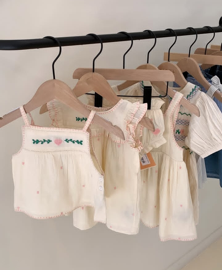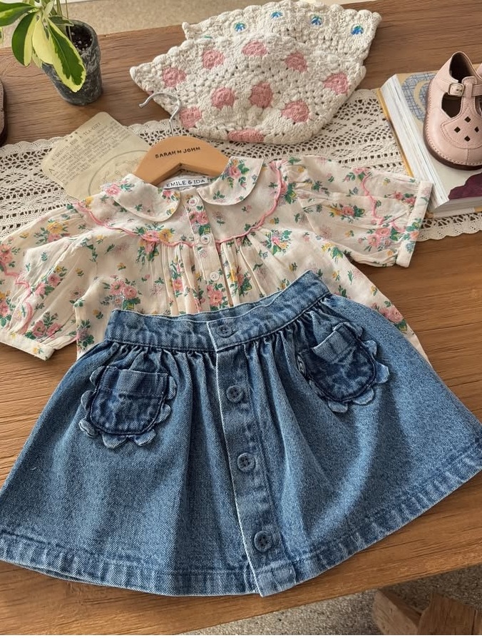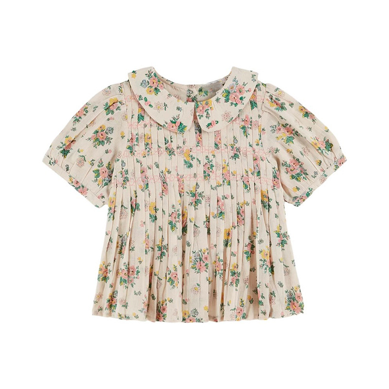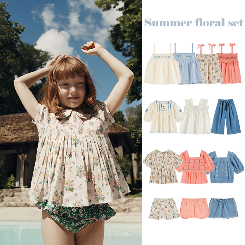 어린이 톱 2025 여름 EM 목회 스타일 소녀의 여름 꽃 가오 딩 세트 수놓은 셔츠 반바지 세트스토어 가기