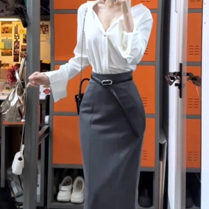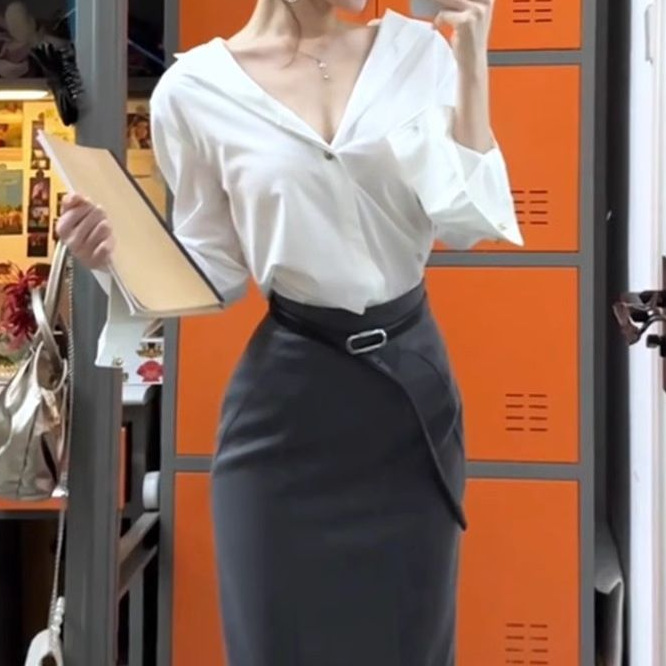 하이 엔드 우아한 통근 화이트 V 넥 긴팔 셔츠 여성 봄 패션 올 매치 하프 길이 원피스 왕실 자매 세트스토어 가기