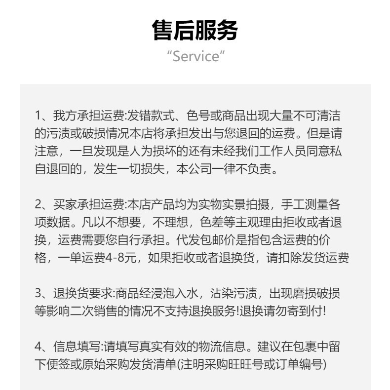 本店包邮产品如果需要拦截退回、拒收或者退货退款,造成交易不成功的情况下,申请售后的时候请扣除发货运费,本司不承担发出运费,请知悉,拍下即作为认同此项!