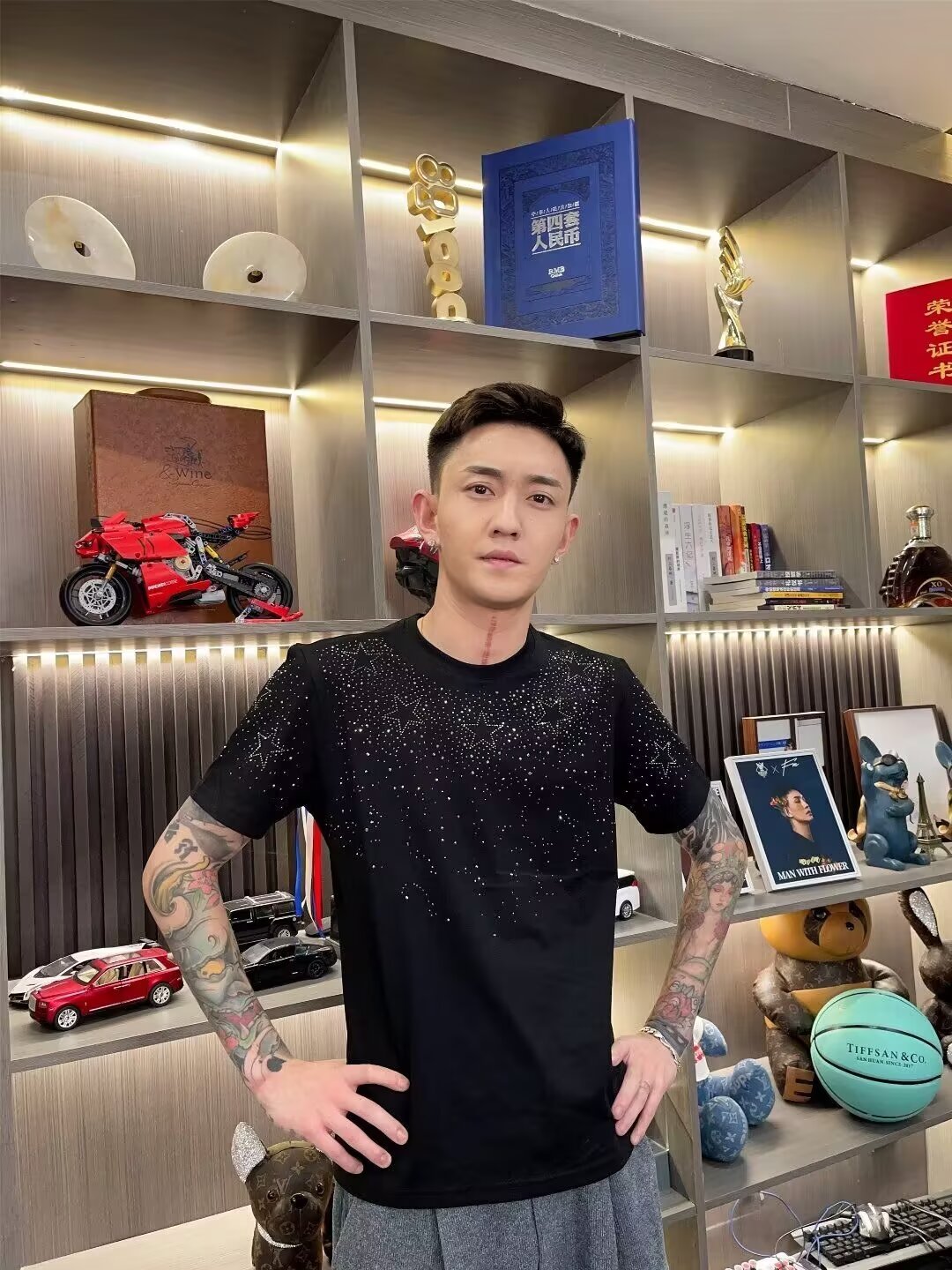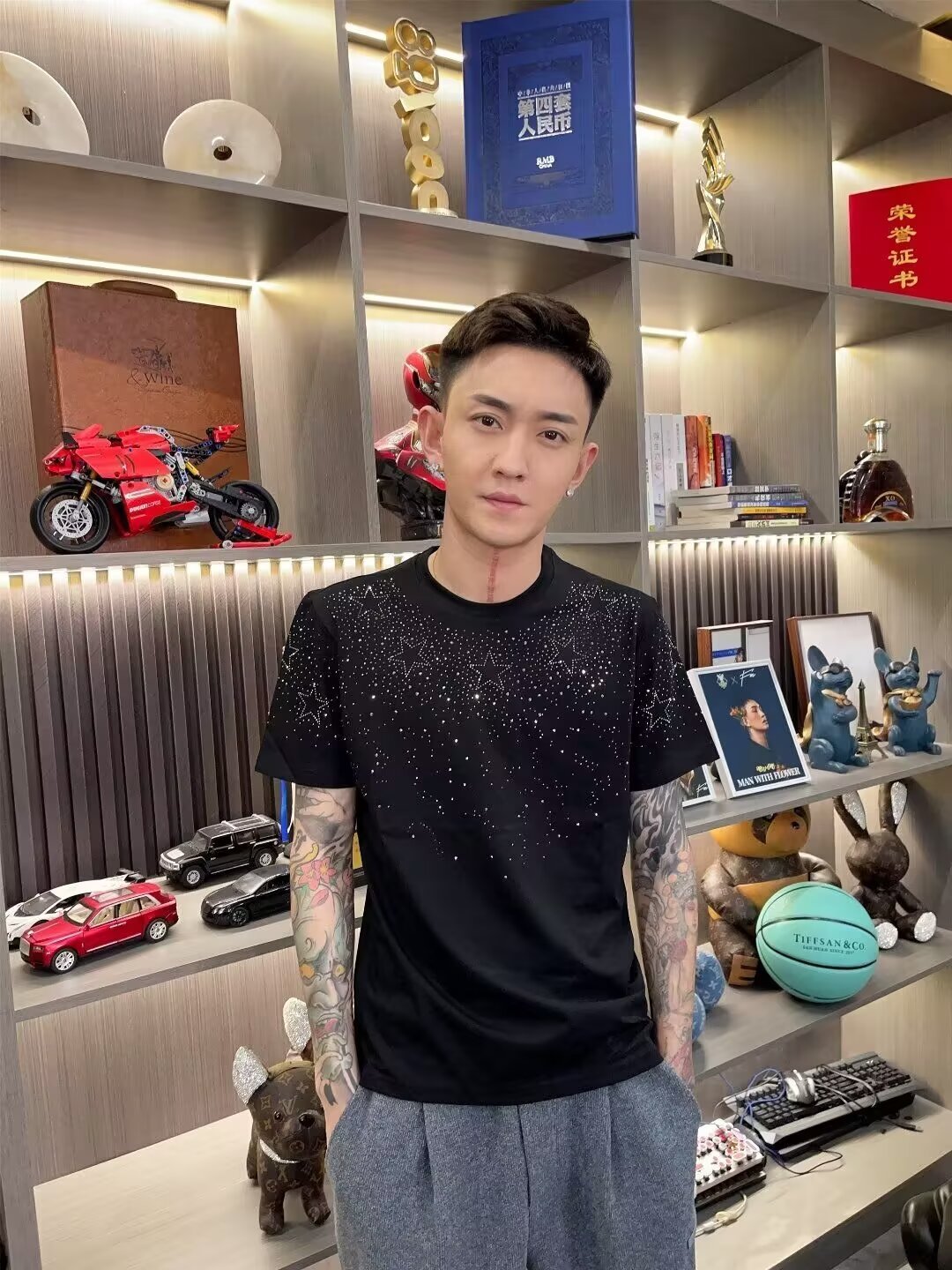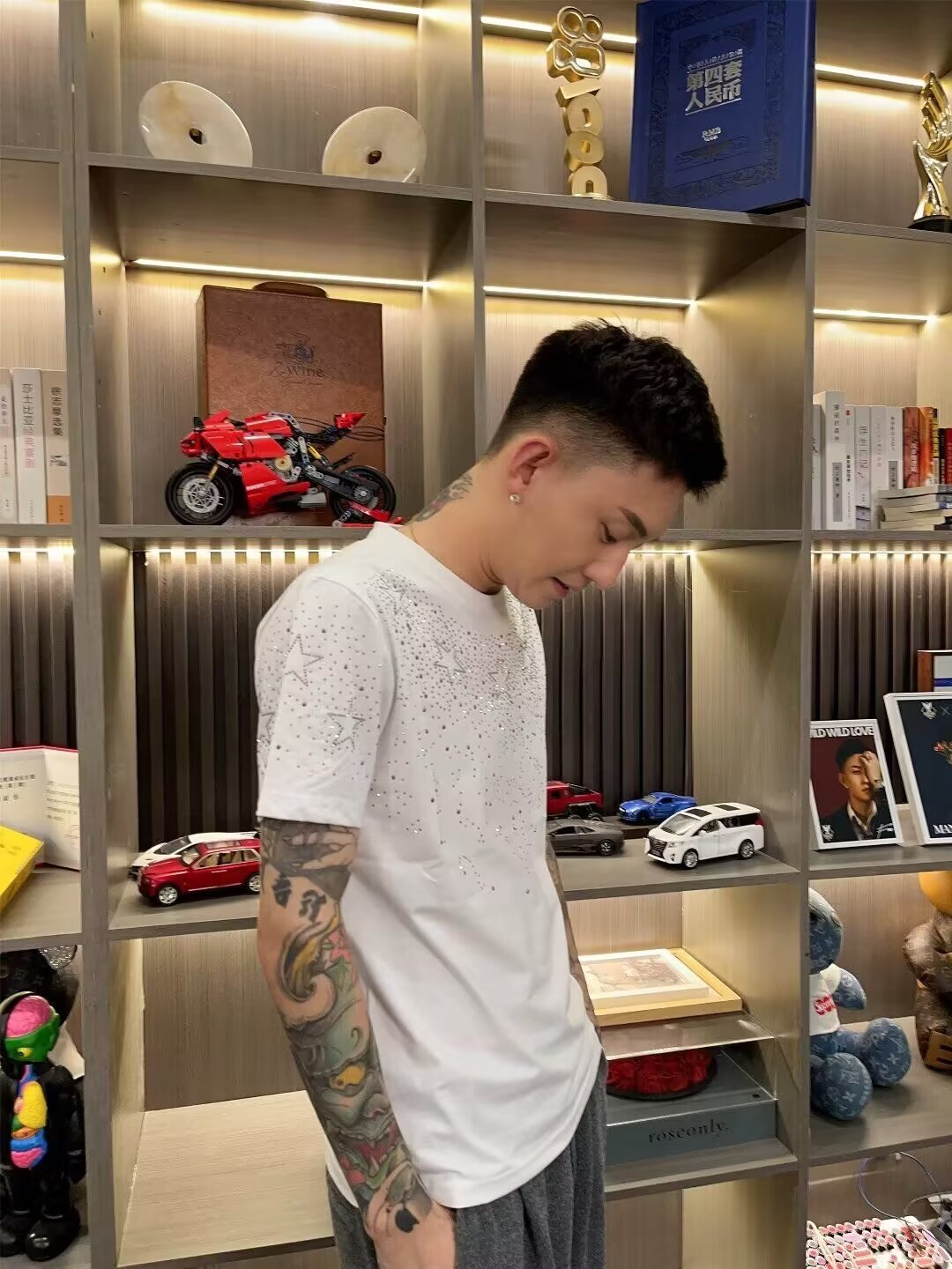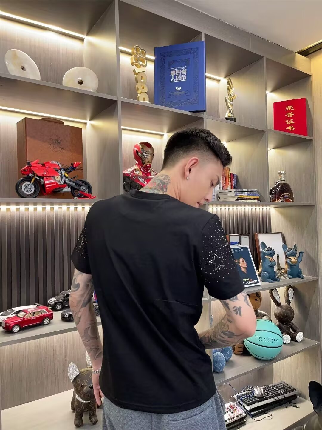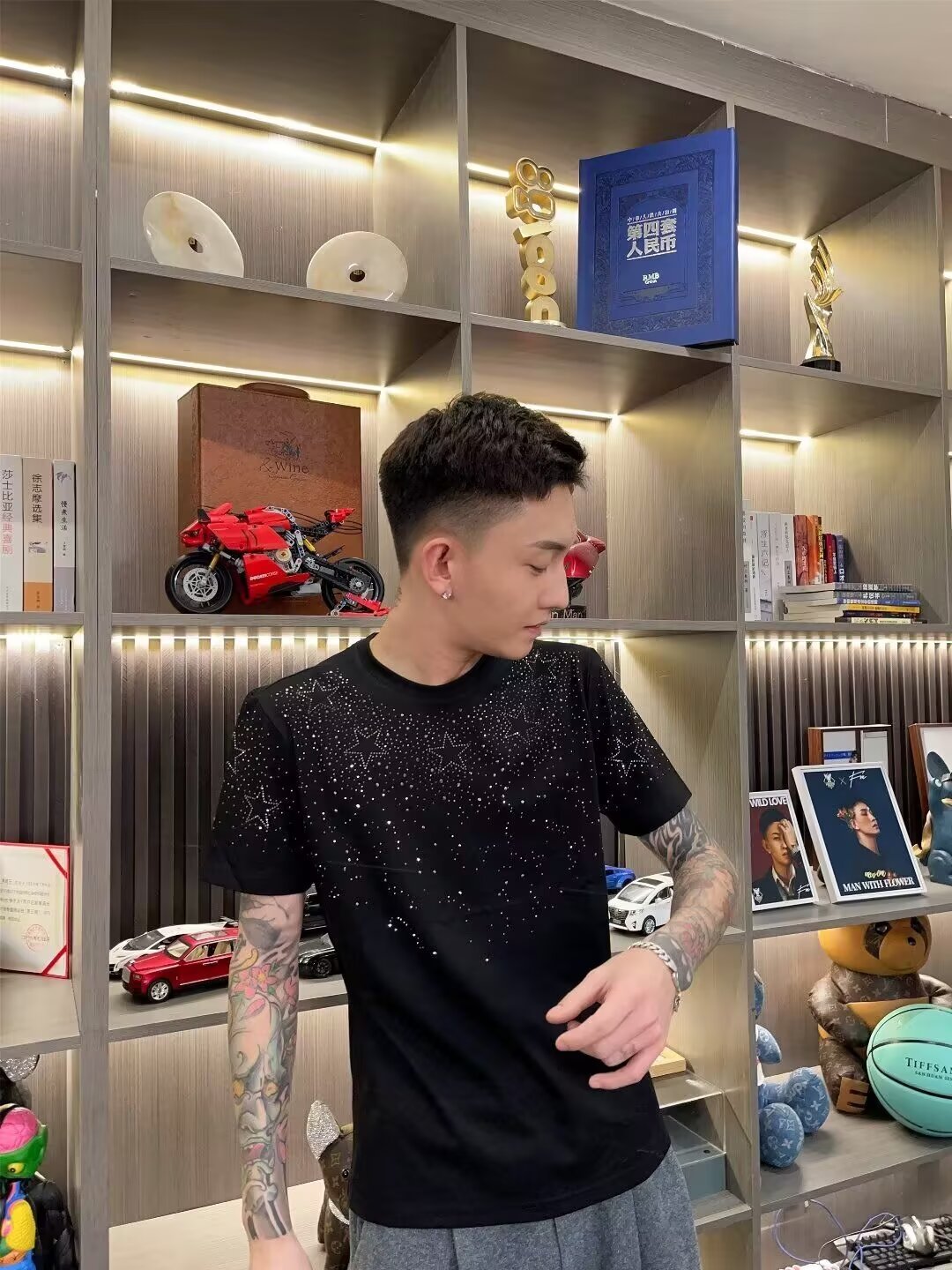 유럽 역 패션 브랜드 라이트 럭셔리 남성 티셔츠 반팔 스타 핫 다이아몬드 인터넷 연예인 핫 스타일 하이 엔드 틈새 반팔 티셔츠스토어 가기