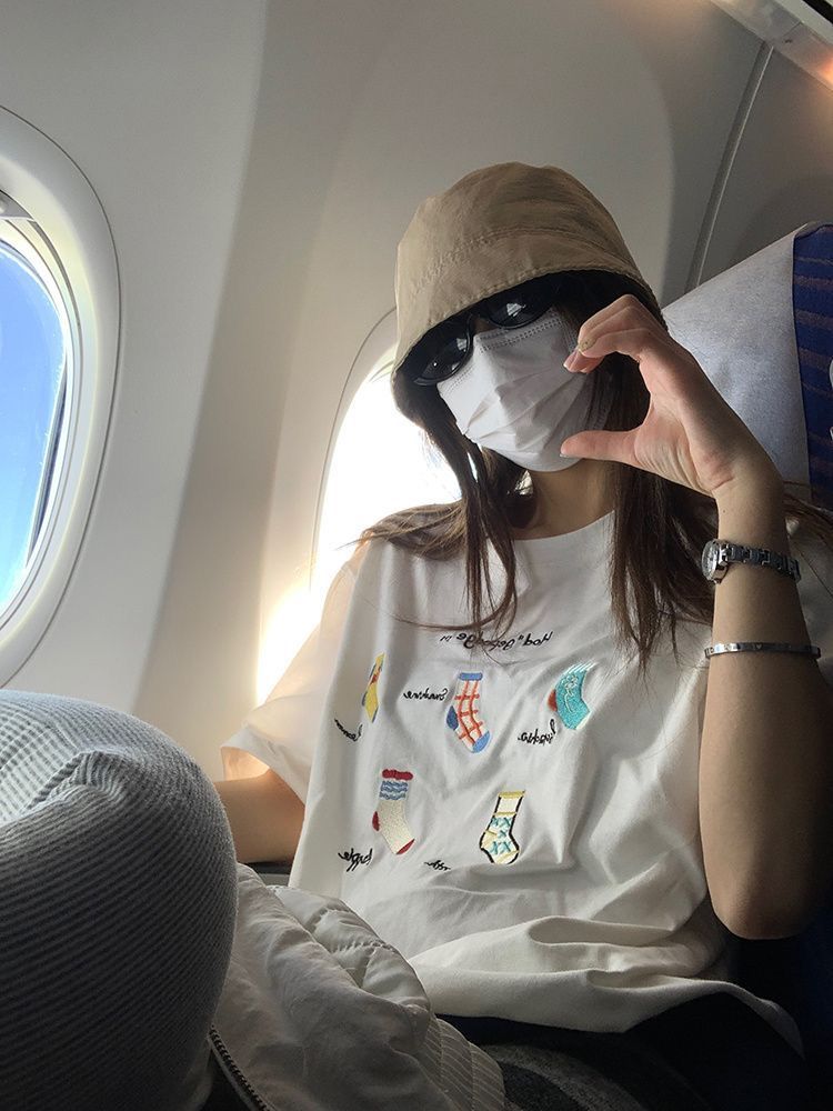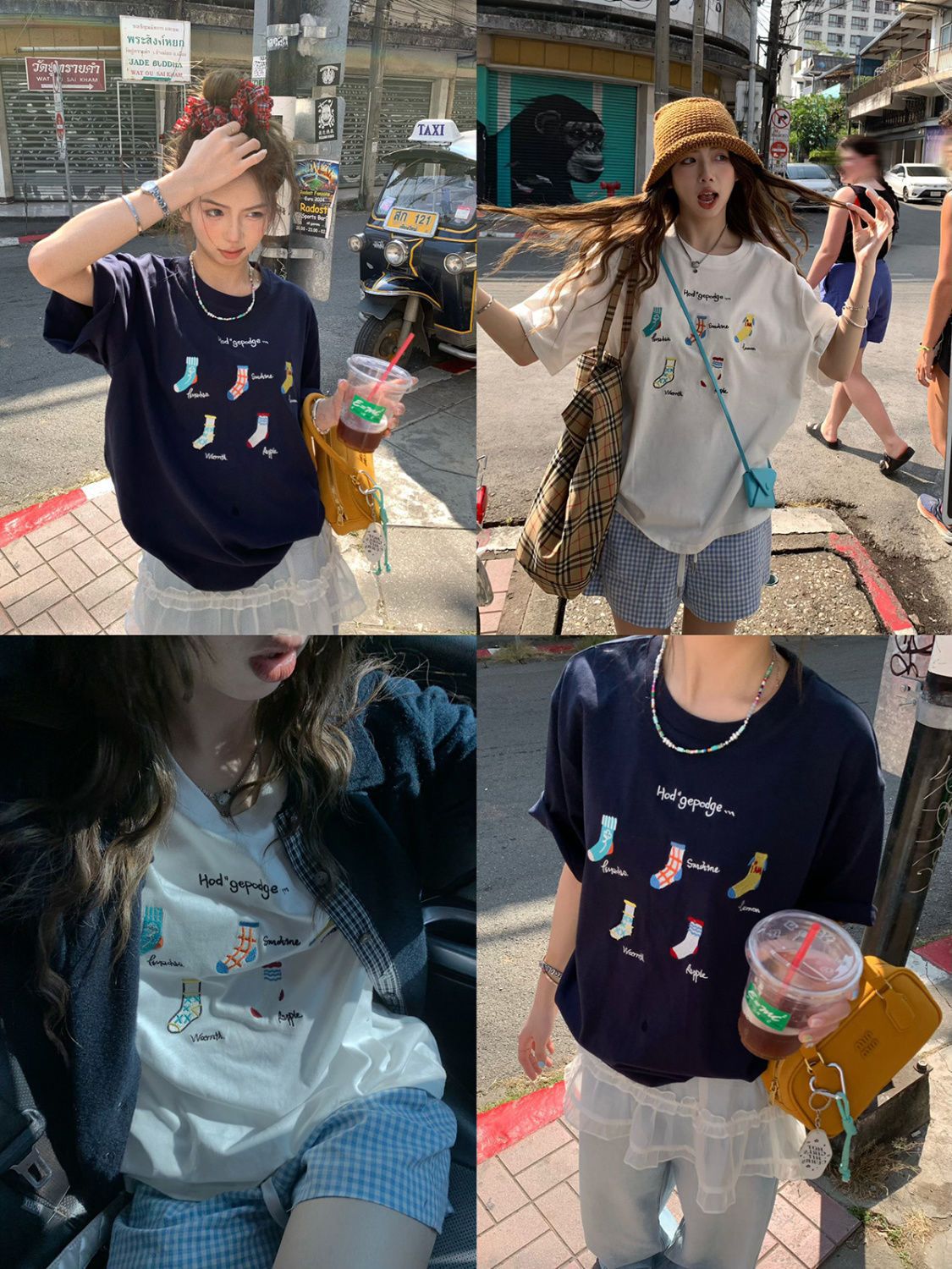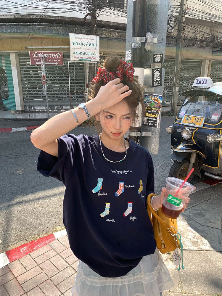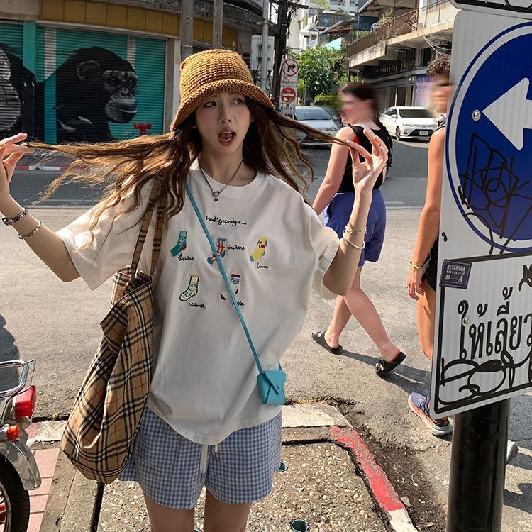여성용 아메리칸 레트로 네이비 블루 재미있는 자수 반팔 티셔츠, 루즈, 게으른 스타일, 다용도, 연령 감소 탑 인스토어 가기
