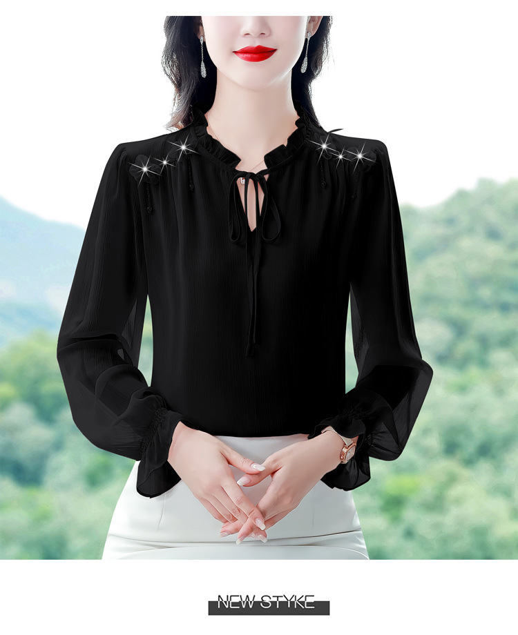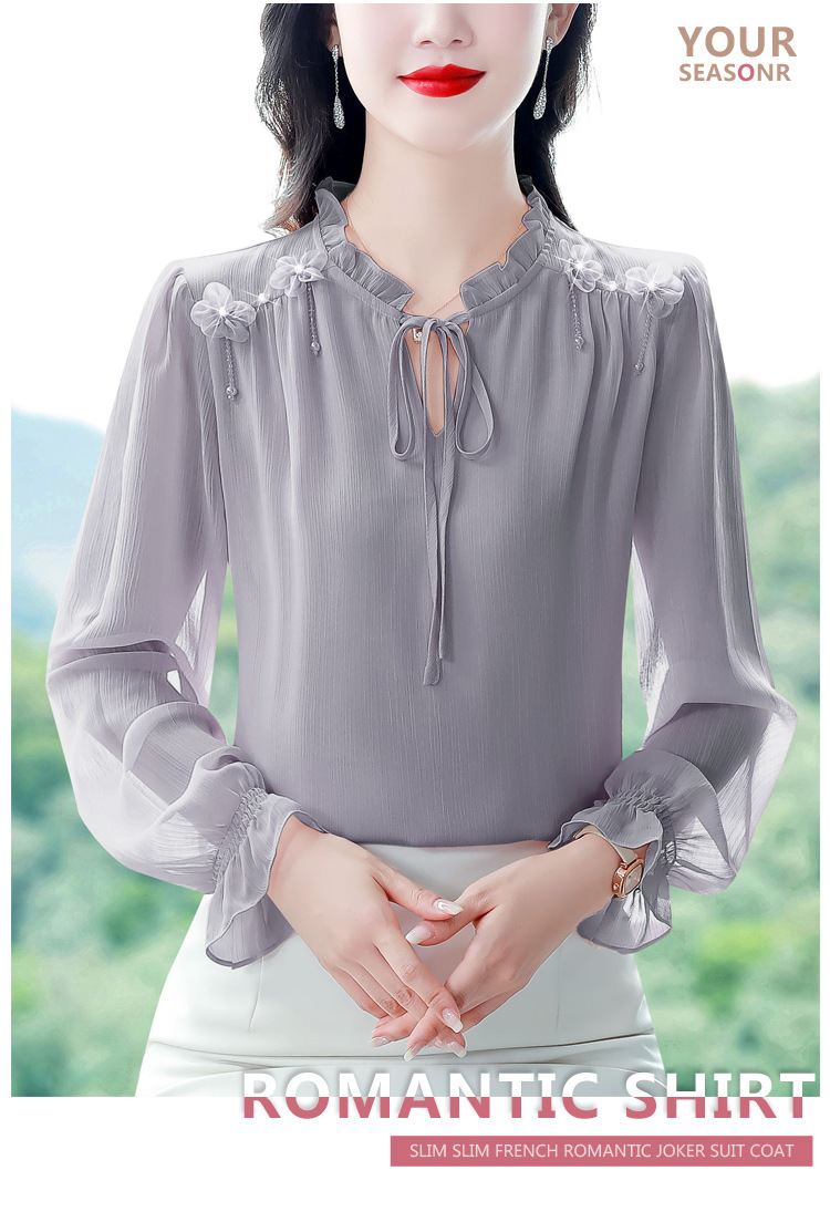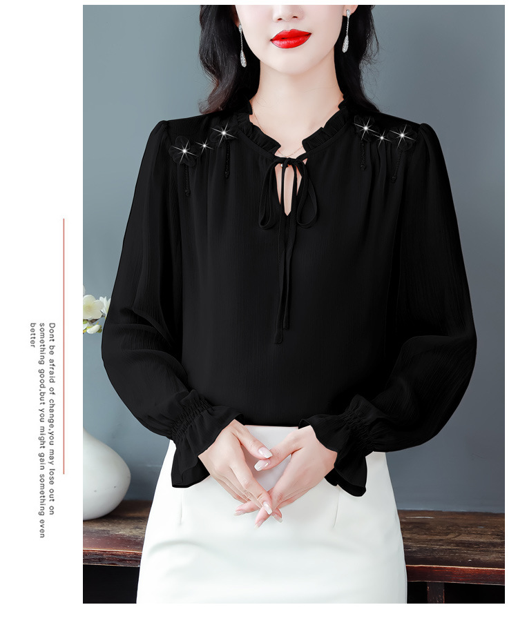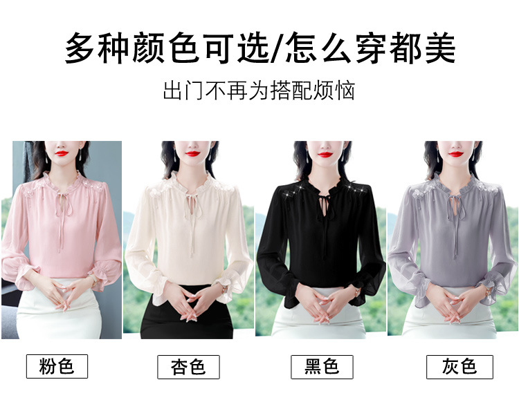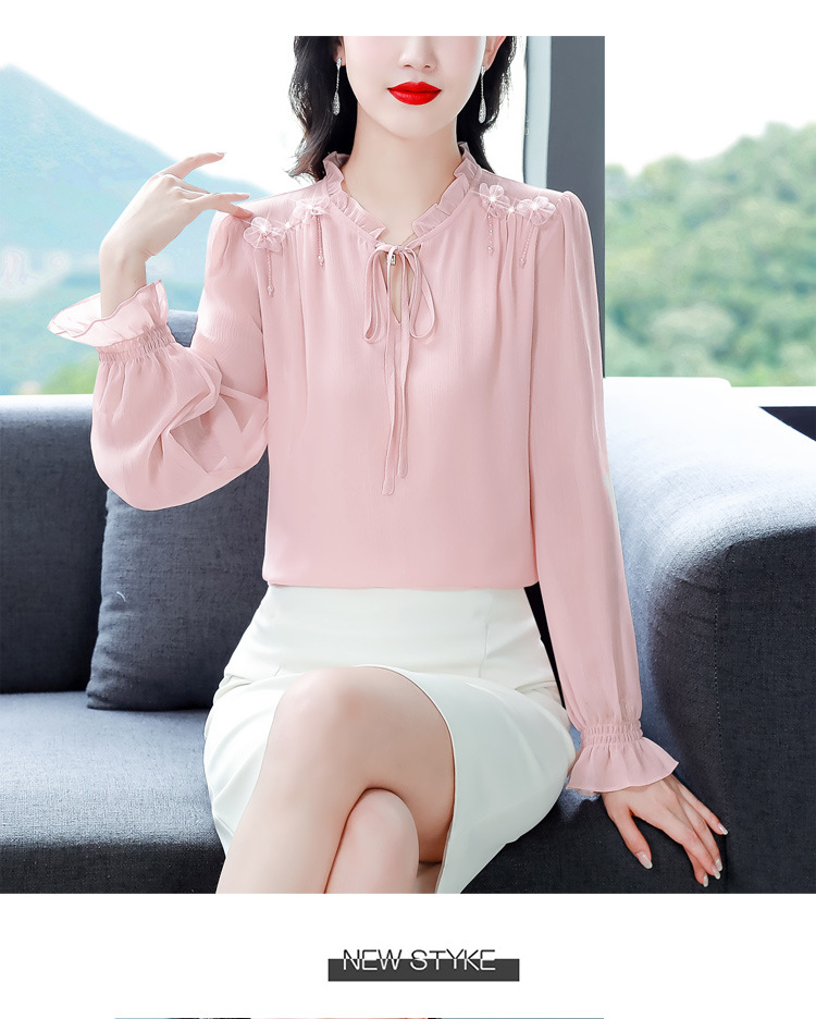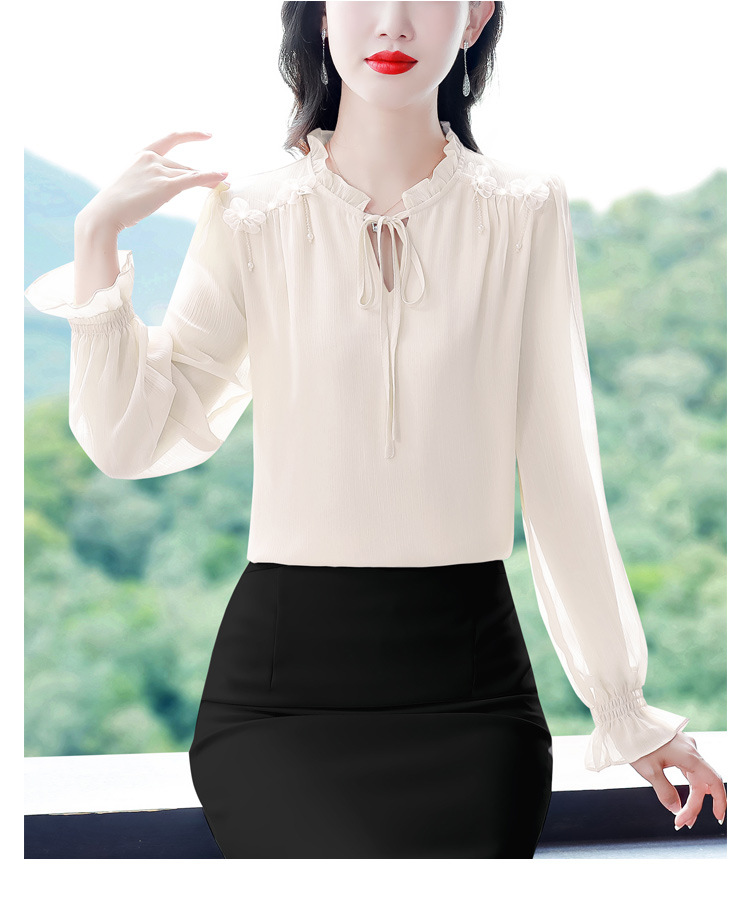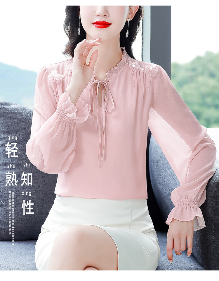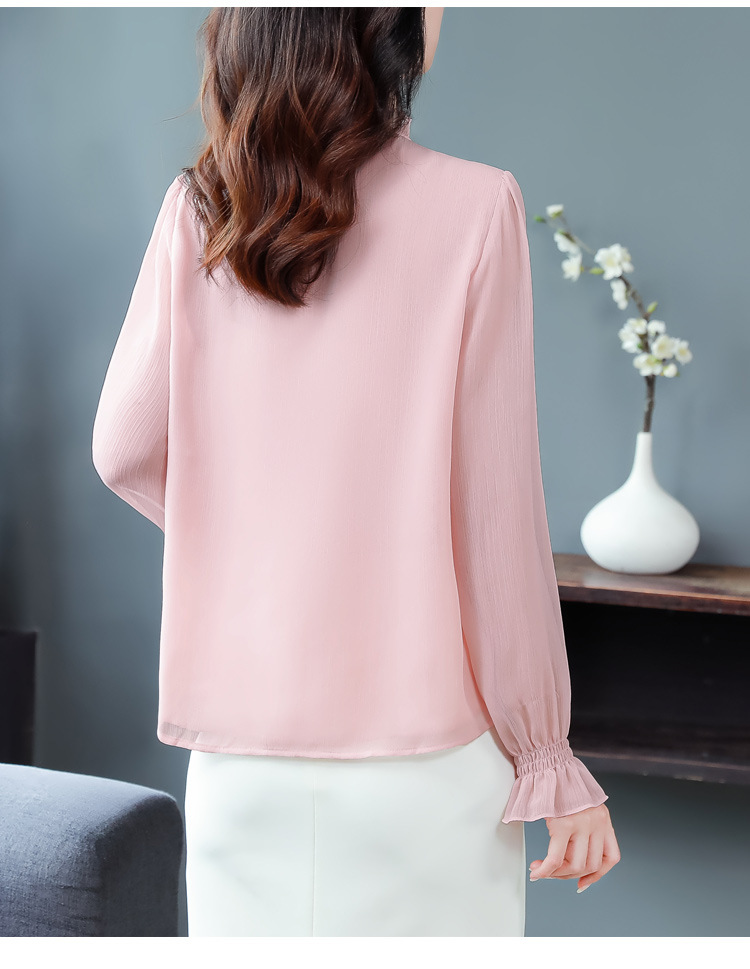 리얼 샷 2025 봄 새로운 활 칼라 긴팔 쉬폰 셔츠 여성 최고의 서양식 기본 셔츠 슬림 셔츠스토어 가기