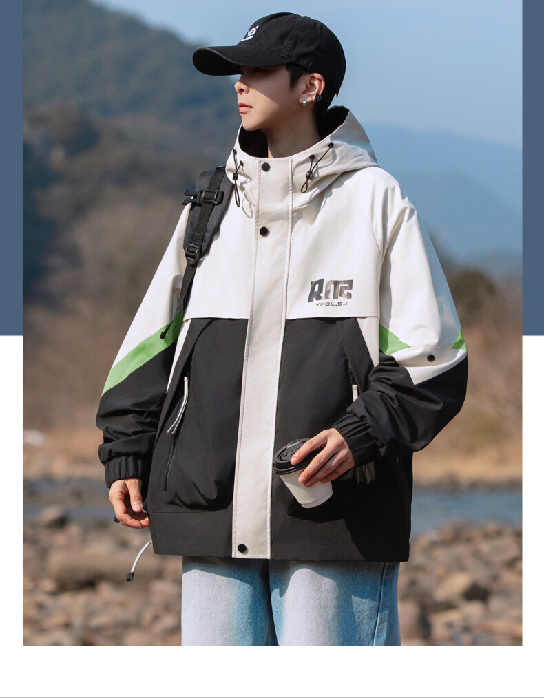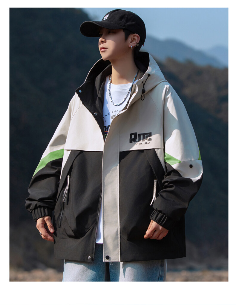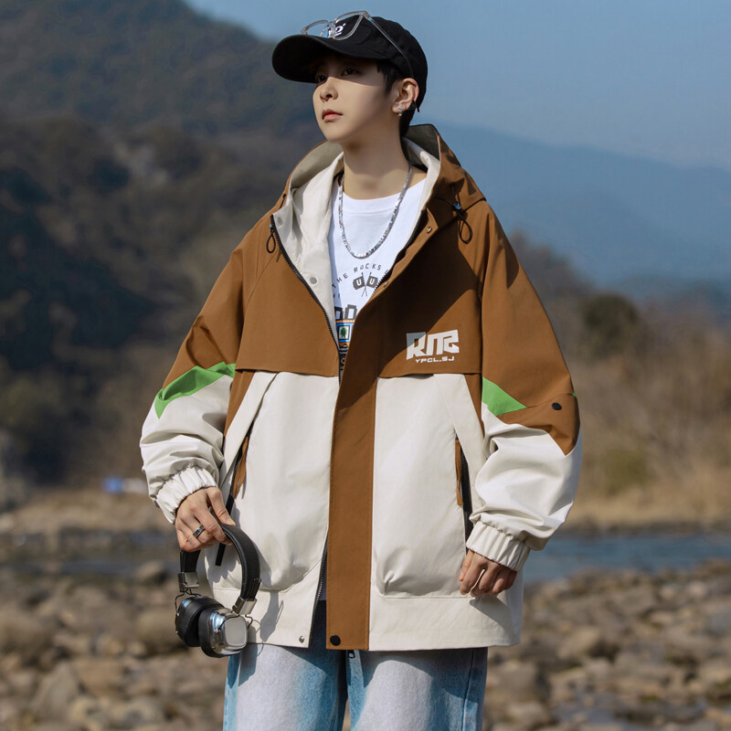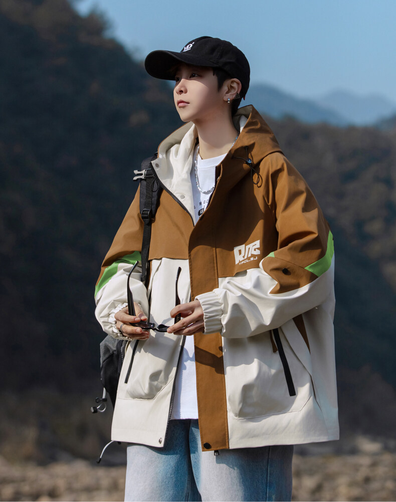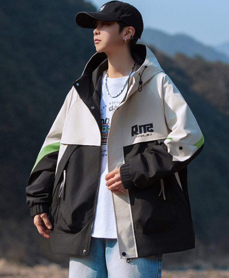 야외 등산 재킷 남성 봄과 가을 컬러 차단 후드 작업 재킷 남성 충전 옷 느슨한 캐주얼 어퍼 옷
