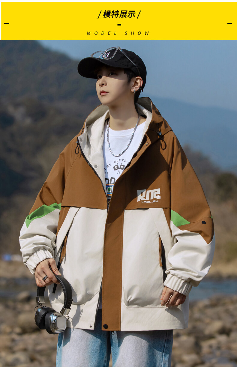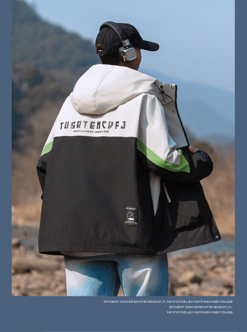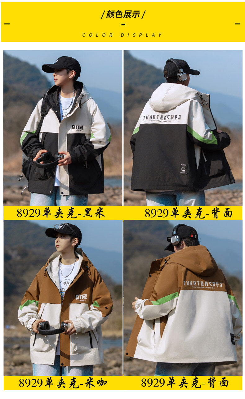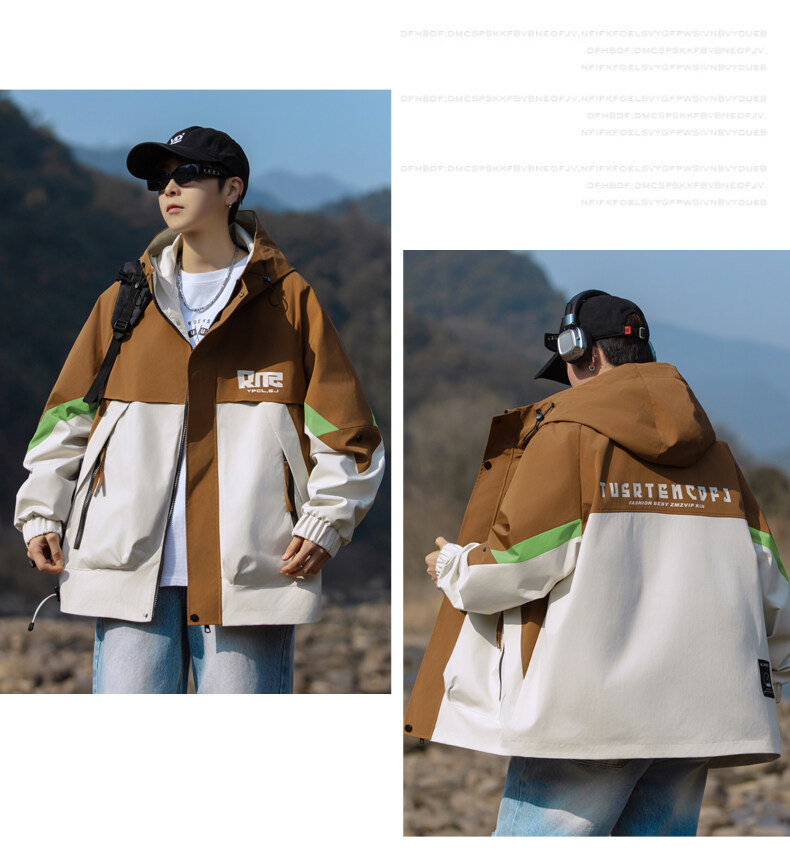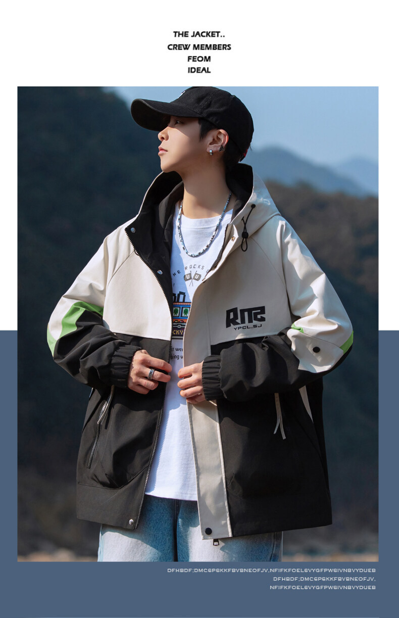야외 등산 재킷 남성 봄과 가을 컬러 차단 후드 작업 재킷 남성 충전 옷 느슨한 캐주얼 어퍼 옷