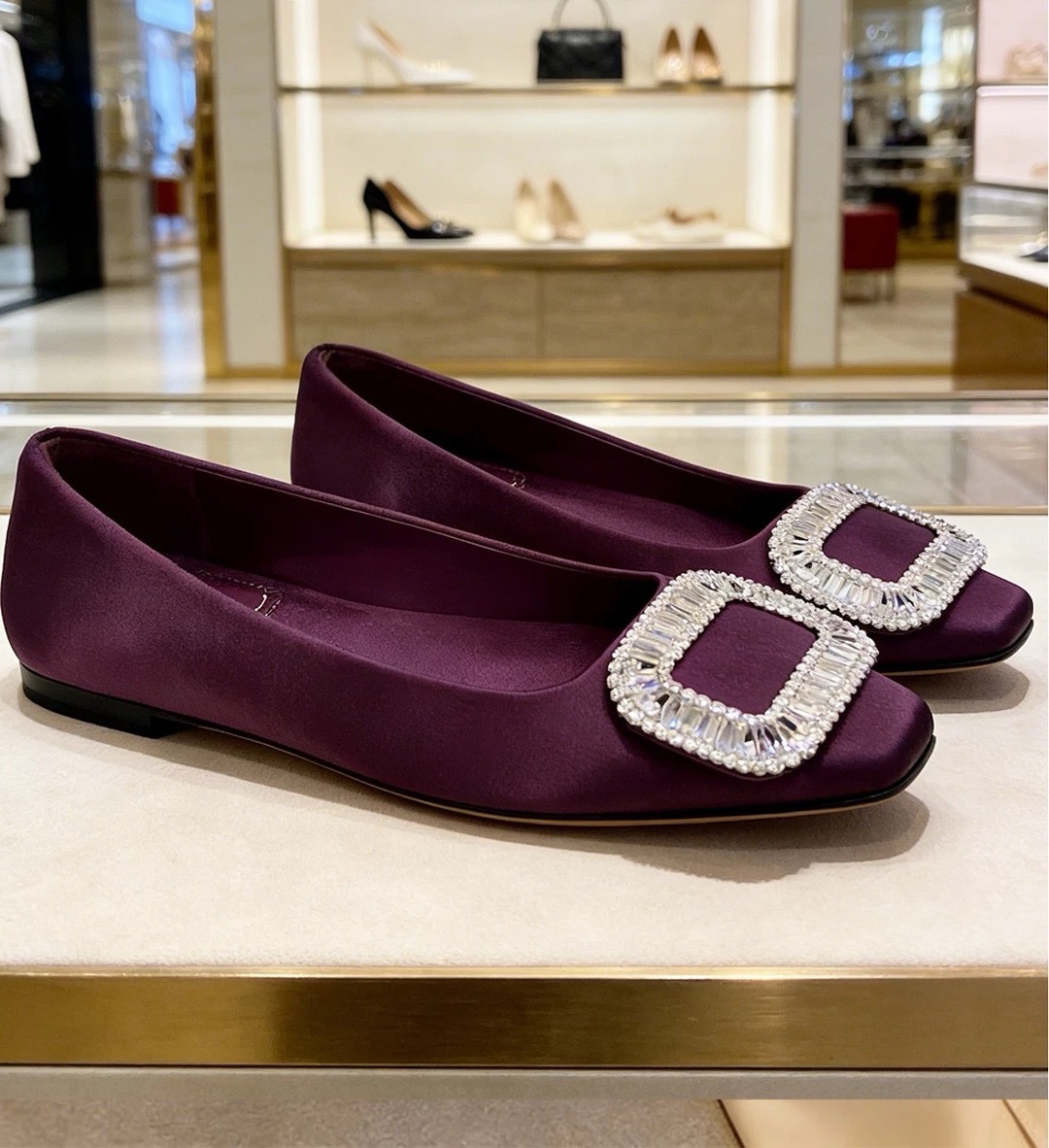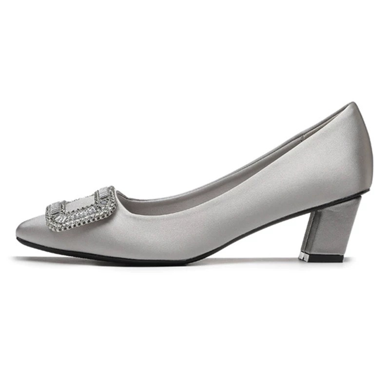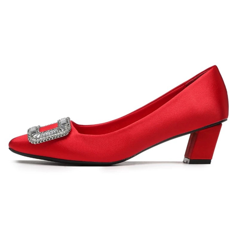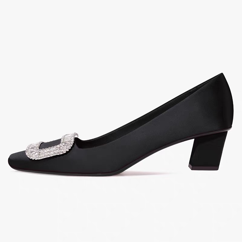 Rv 사각 버클 라인 스톤 새틴 하이힐 여성의 낮은 발 뒤꿈치 얕은 입 사각형 발가락 신발 결혼식 신발 전문 통근 신발 봄과 여름 새로운