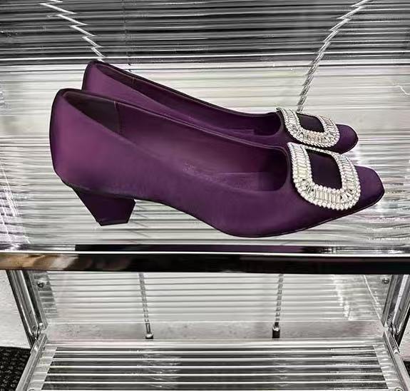 Rv 사각 버클 라인 스톤 새틴 하이힐 여성의 낮은 발 뒤꿈치 얕은 입 사각형 발가락 신발 결혼식 신발 전문 통근 신발 봄과 여름 새로운스토어 가기