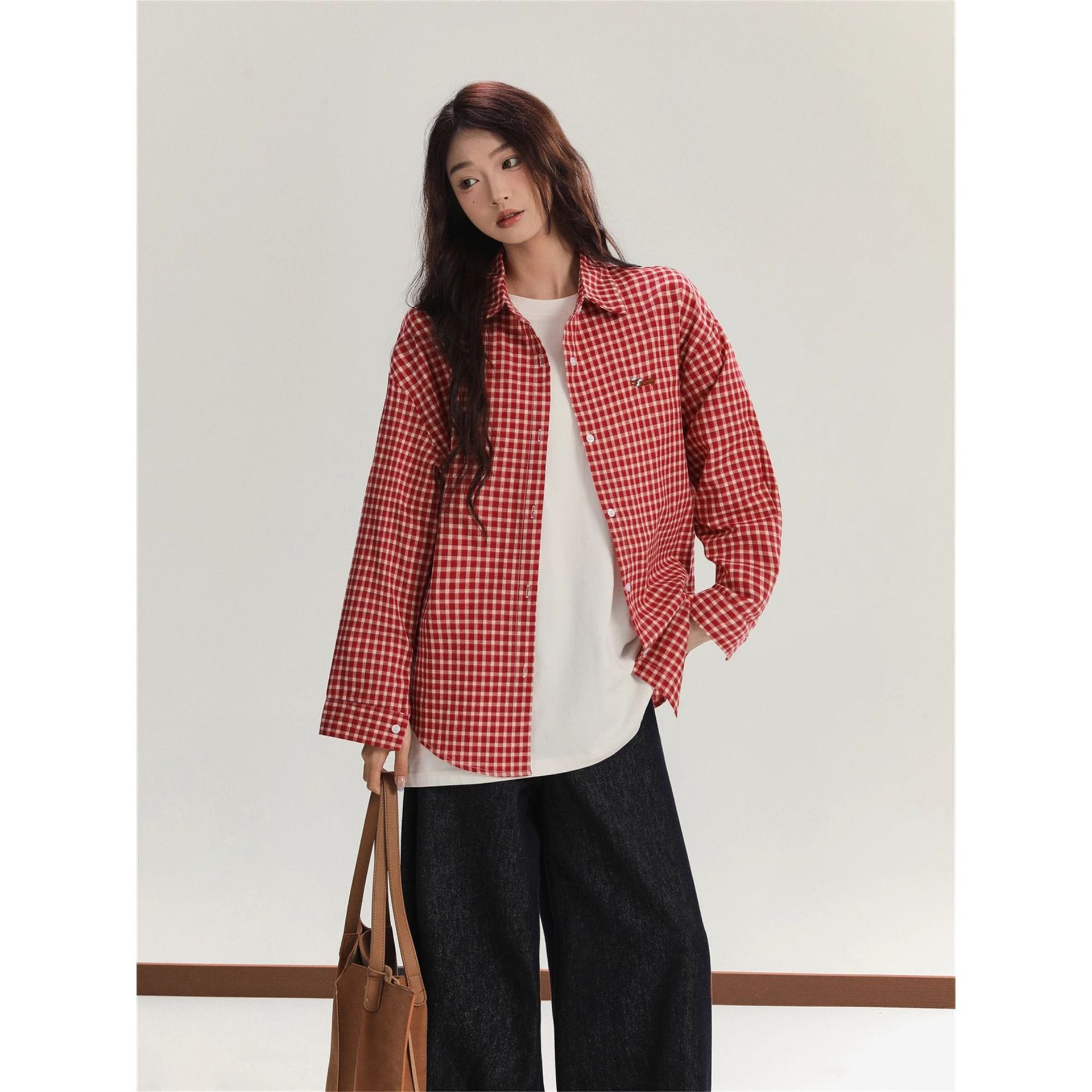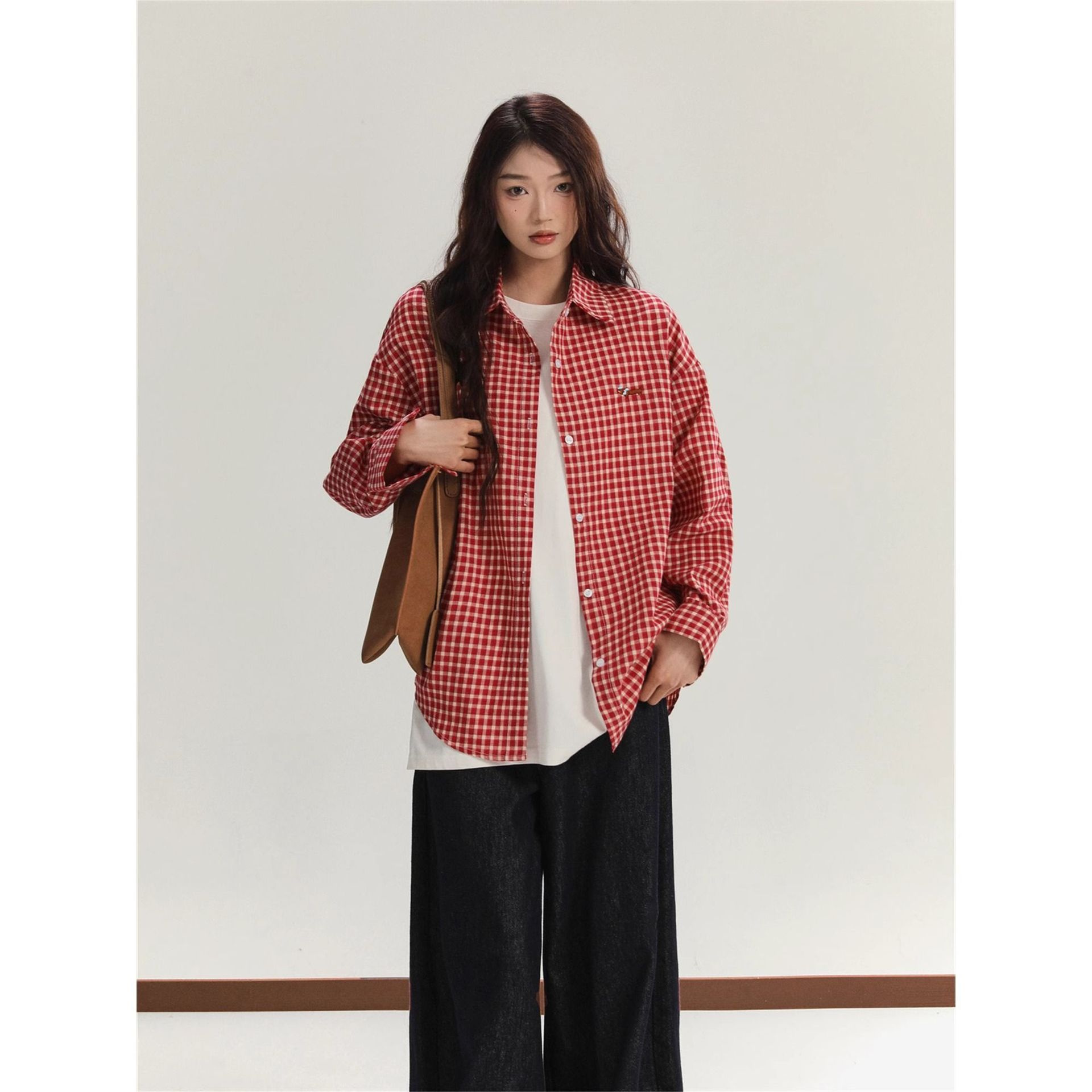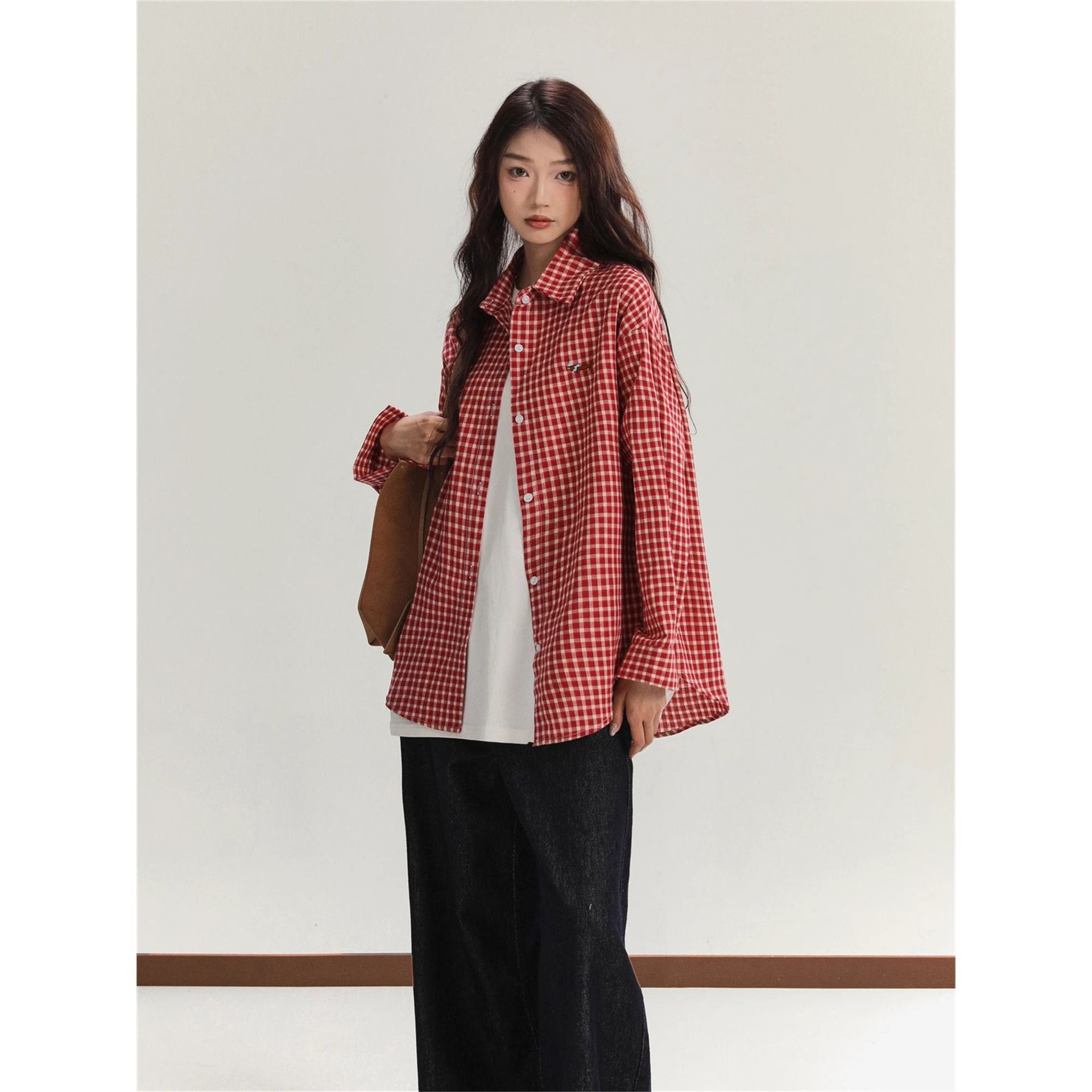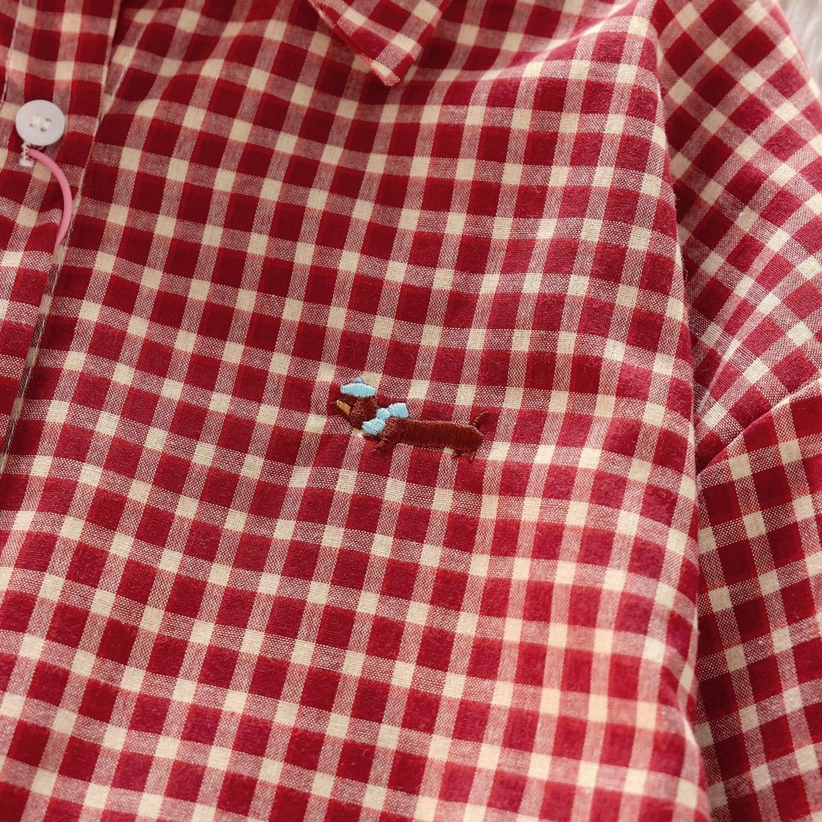 아메리칸 스타일 레트로 Wachshund 강아지 빨간 격자 무늬 셔츠 여성의 봄과 가을 새로운 느슨한 올 매치 선 스크린 긴팔 외부 풀오버스토어 가기
