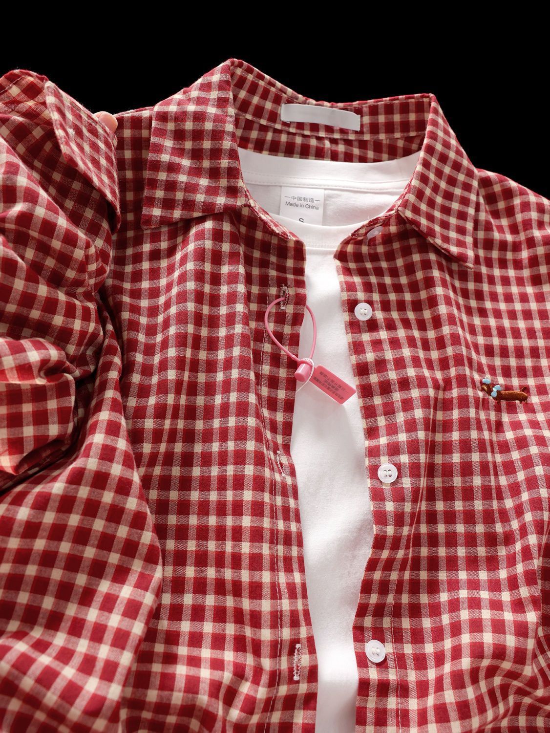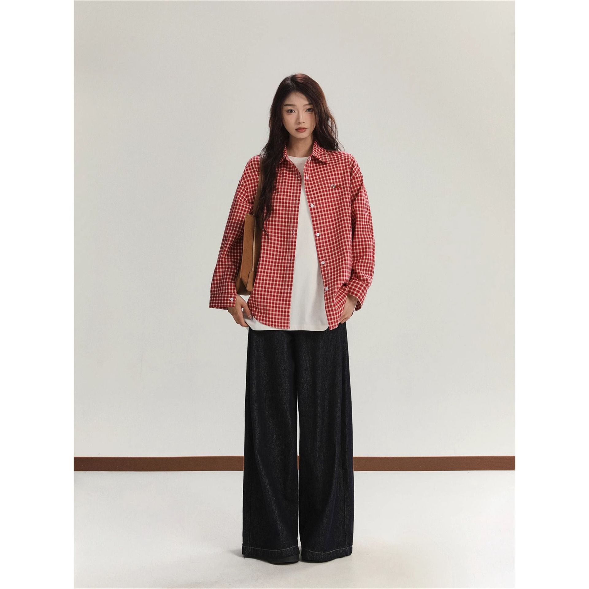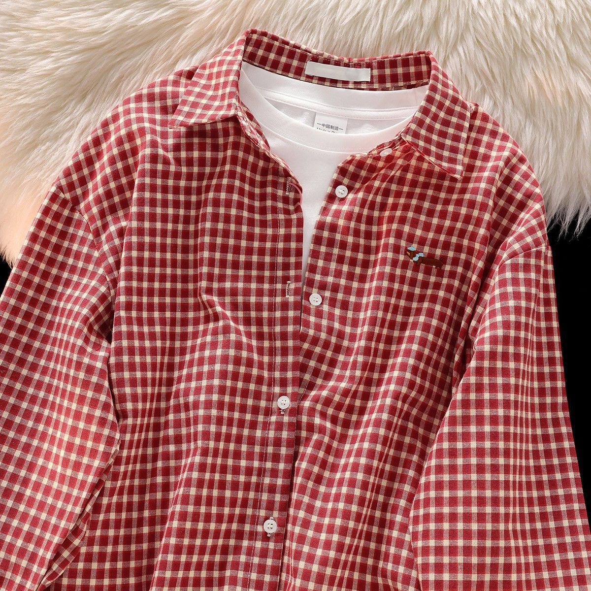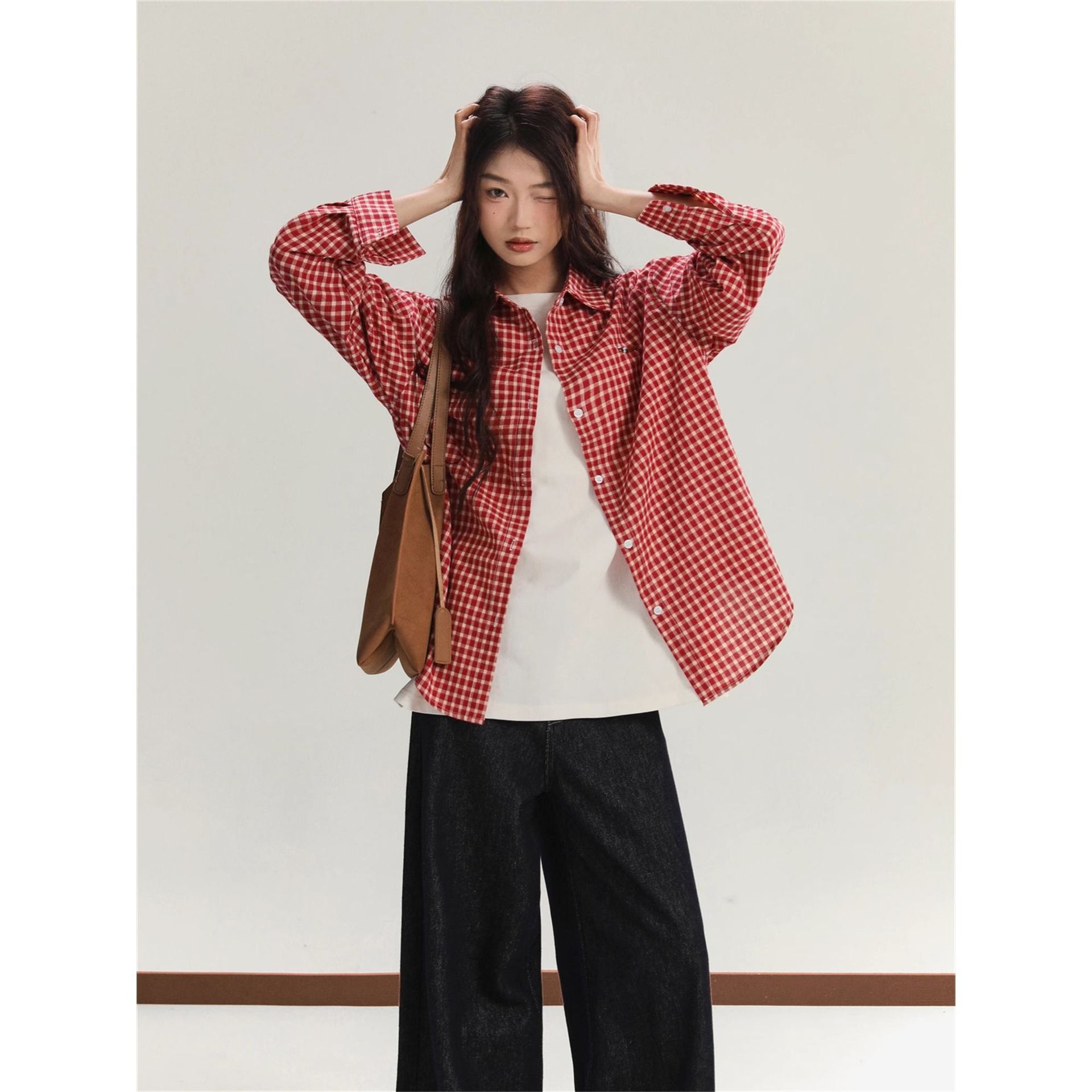 아메리칸 스타일 레트로 Wachshund 강아지 빨간 격자 무늬 셔츠 여성의 봄과 가을 새로운 느슨한 올 매치 선 스크린 긴팔 외부 풀오버스토어 가기