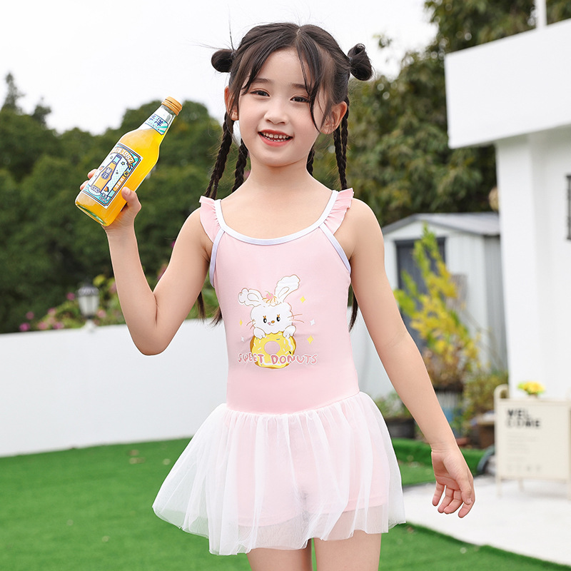 달콤하고 귀여운 토끼 프린트 투투 스커트 소녀 스타일리제 귀여운 해변 휴가 수영복 민소매 원피스 메쉬 스커트스토어 가기