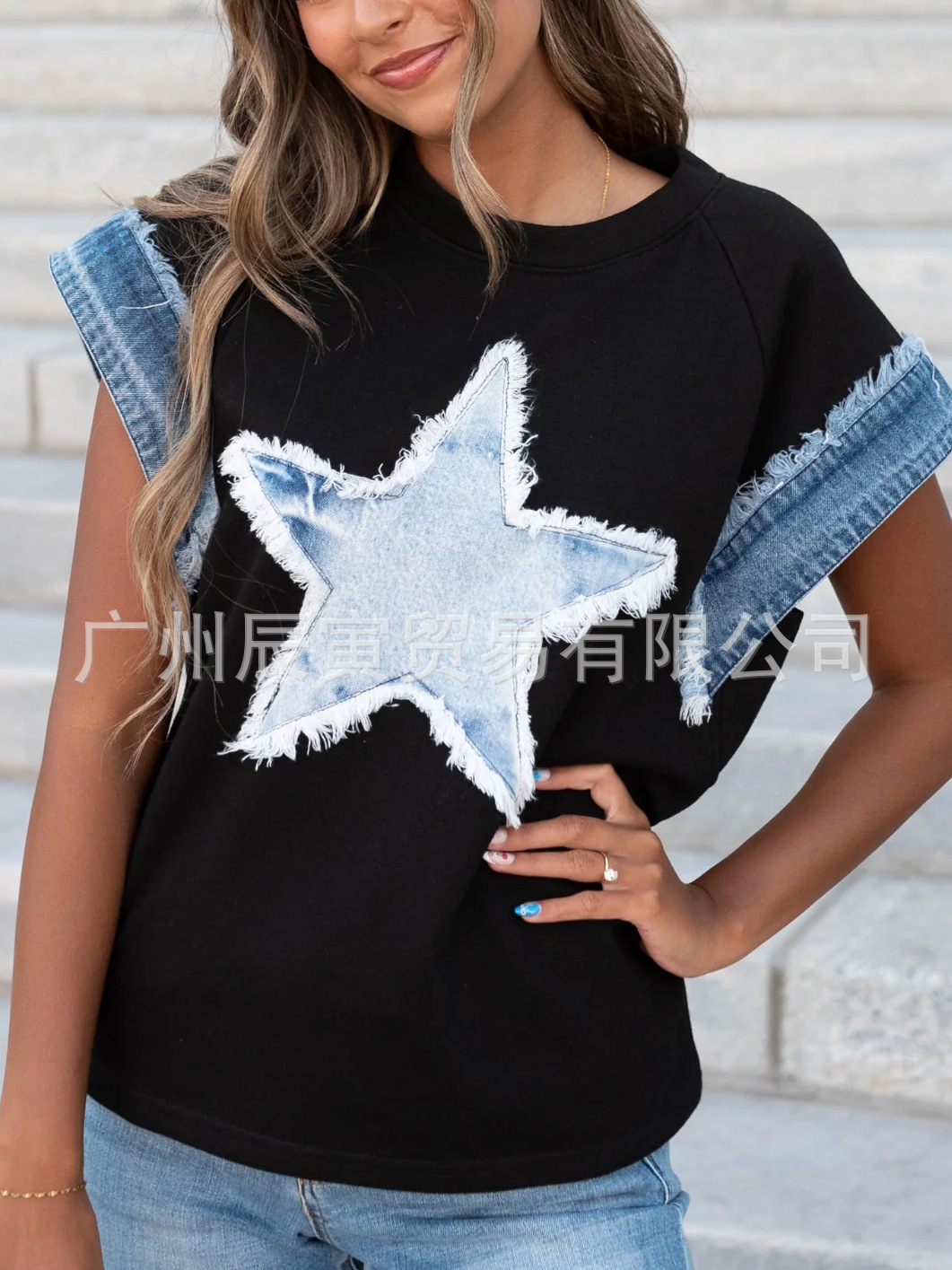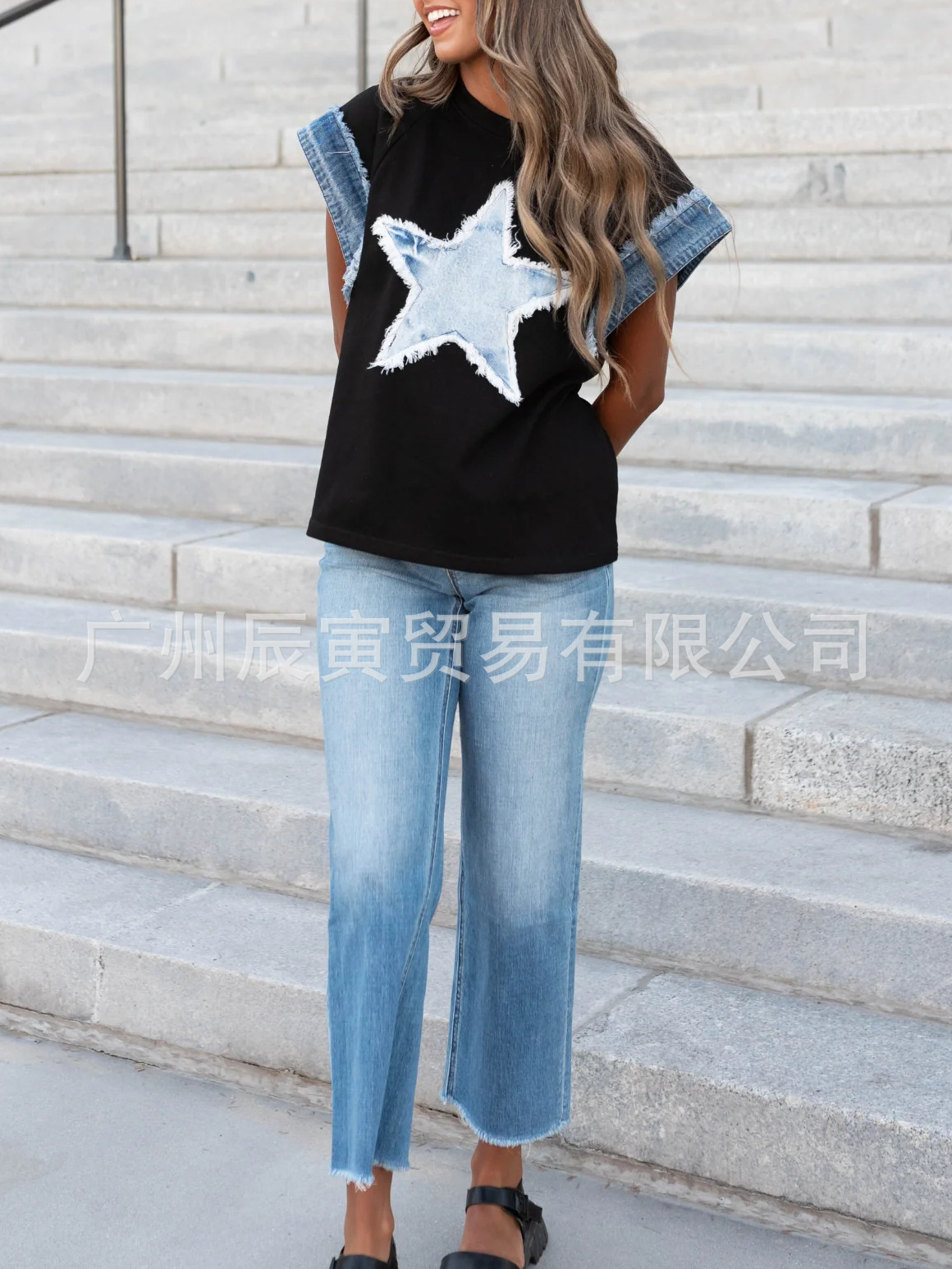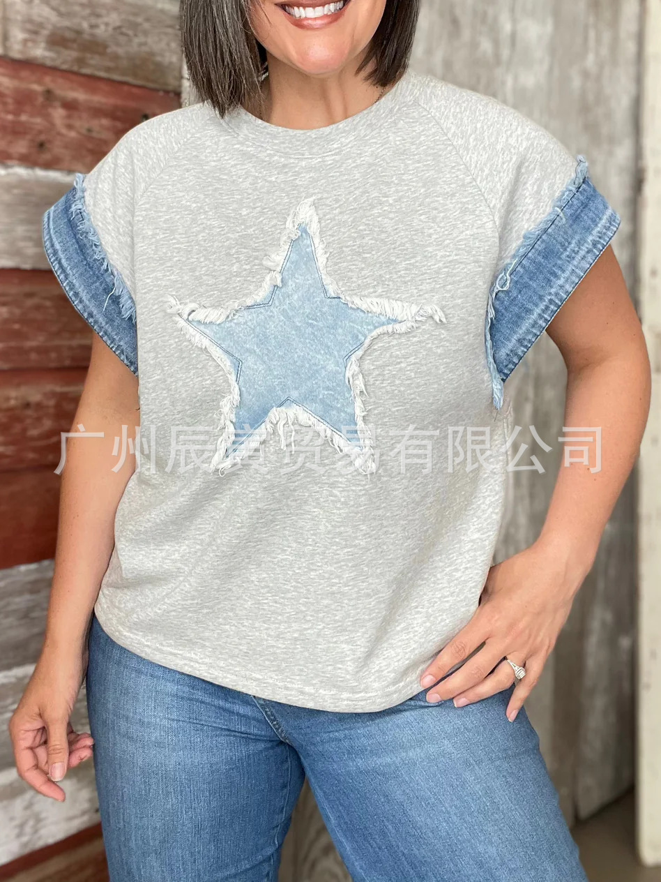 Ins 뜨거운 판매 유럽과 미국의 봄과 여름 여성의 면화 데님 스타 스티커 세척 라운드 넥 느슨한 티셔츠