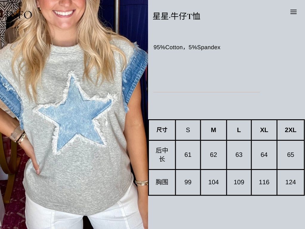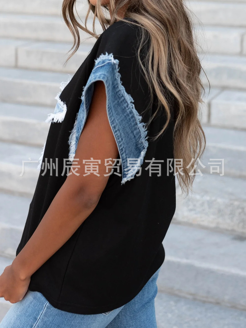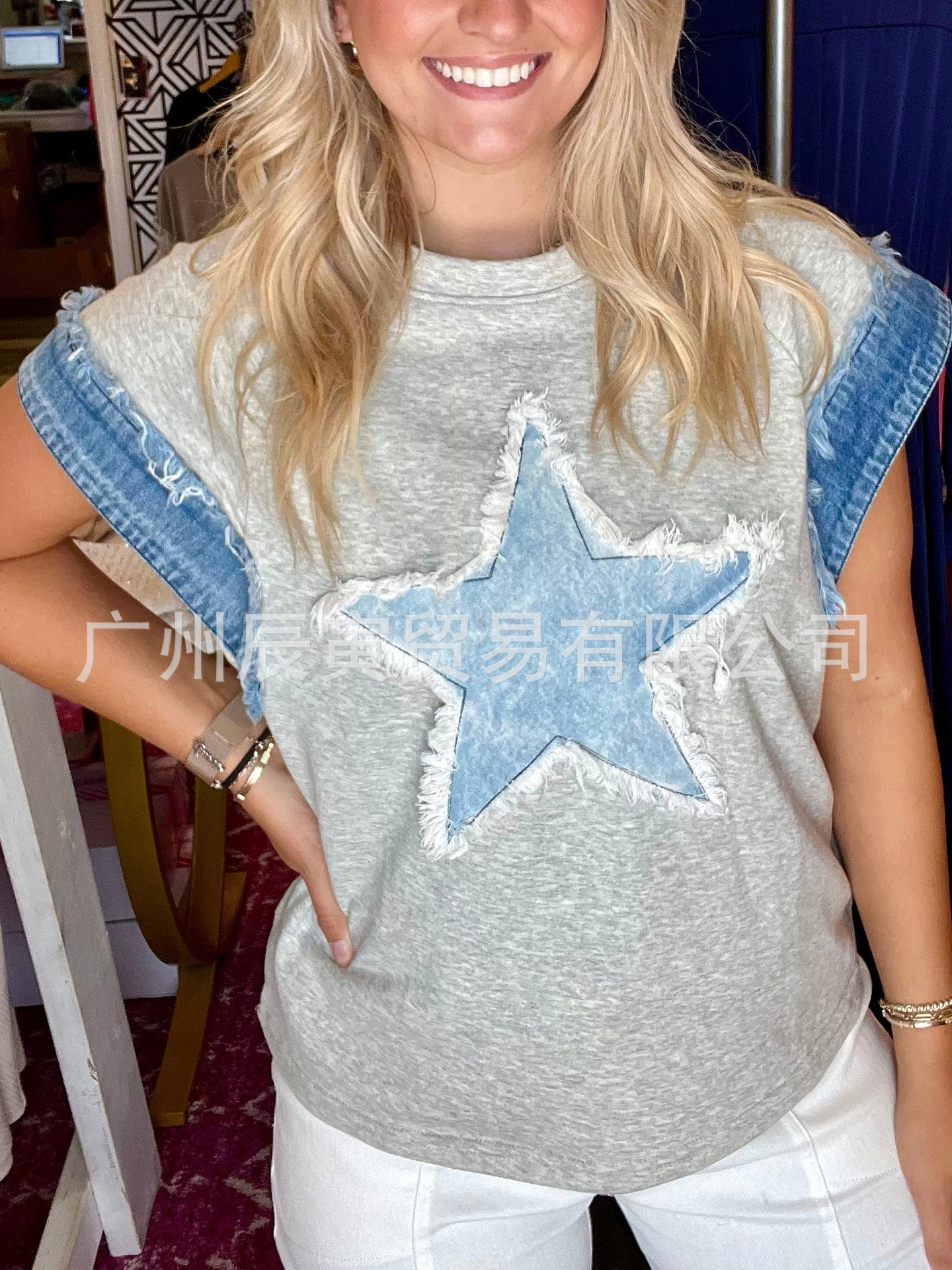 Ins 뜨거운 판매 유럽과 미국의 봄과 여름 여성의 면화 데님 스타 스티커 세척 라운드 넥 느슨한 티셔츠