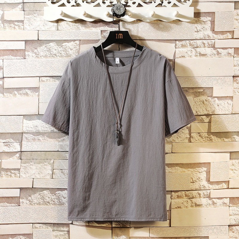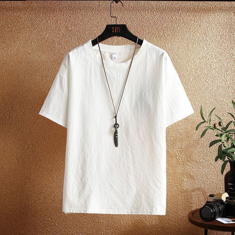 아이스 실크 리넨 반팔 티셔츠 남자 여름 트렌디 브랜드 코튼 및 리넨 반소매 탑 옷 아빠 일본식 빈티지 티셔츠
