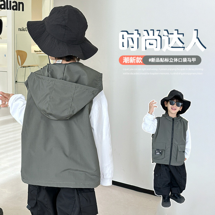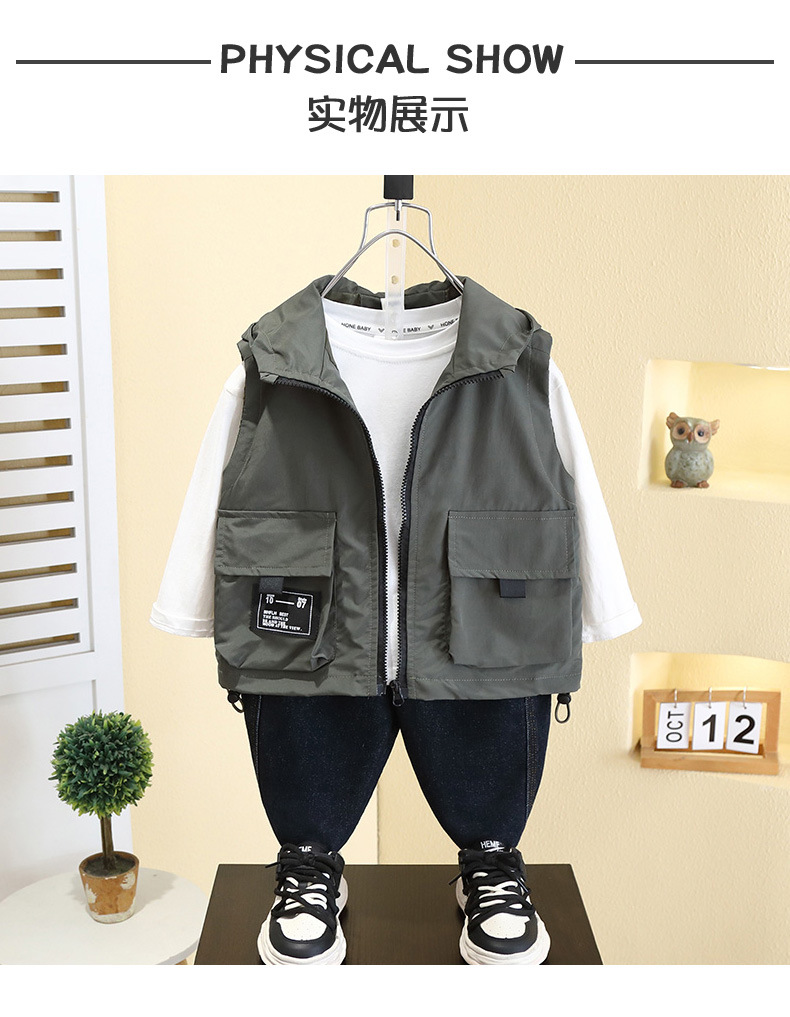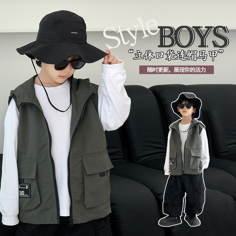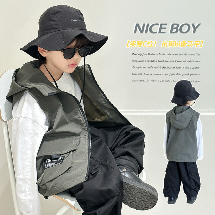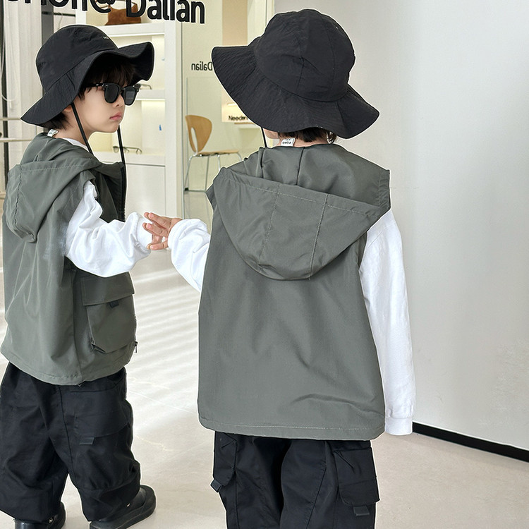 7527 어린이 조끼 봄 소년의 얇은 후드 민소매 재킷 2025 새로운 봄과 가을 캐주얼 탑 트렌디스토어 가기