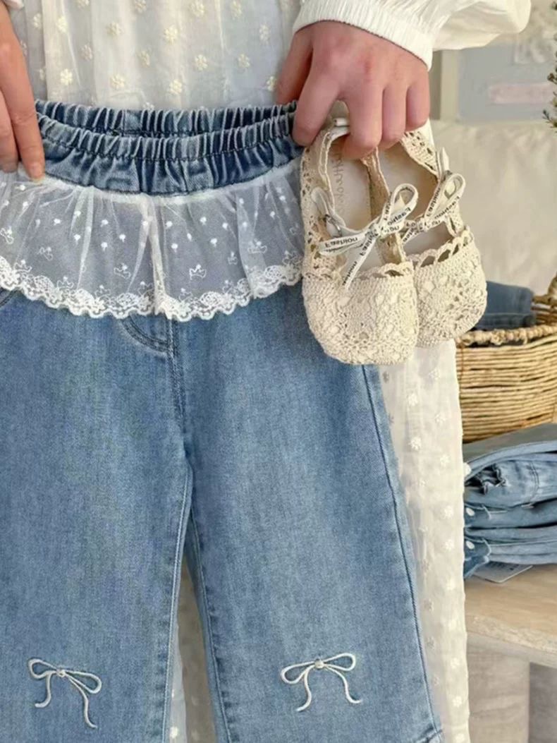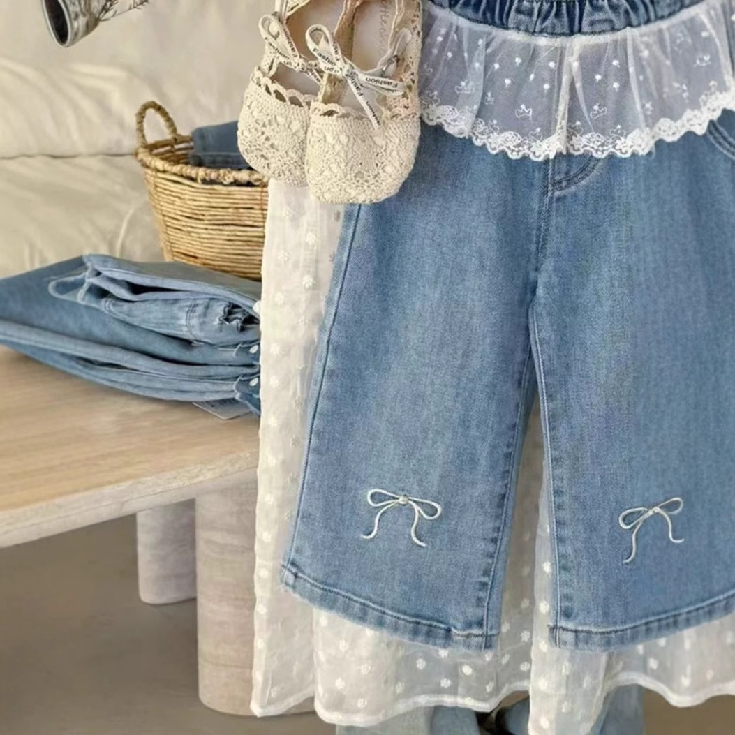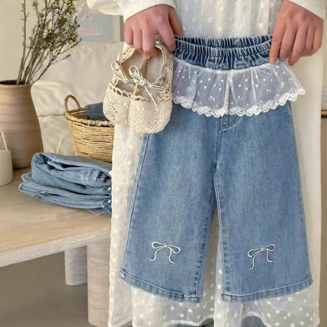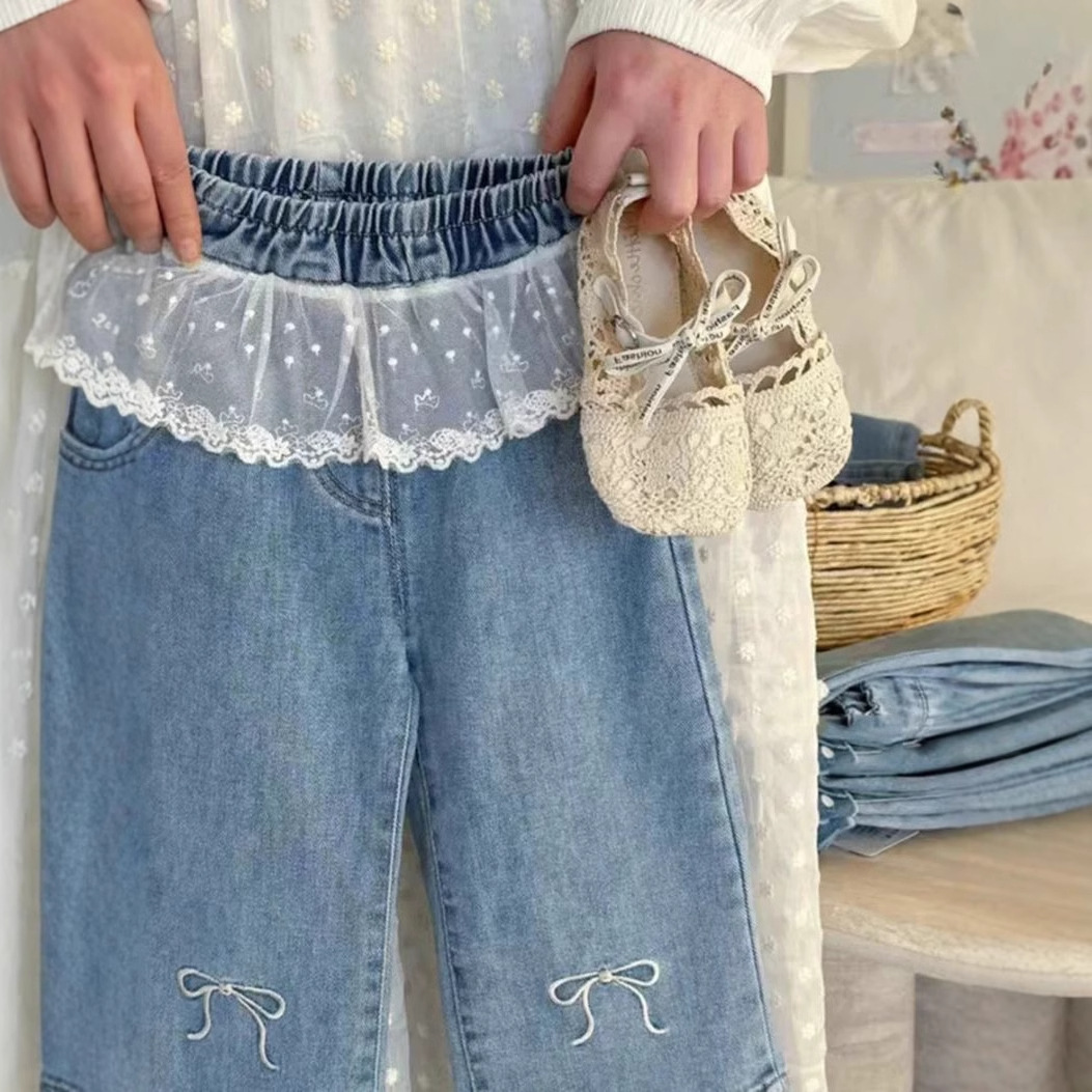 한국식 아동복 소녀 바지 봄 서양식 어린이 블루 청바지 아기의 패셔너블 레이스 레이스 와이드 다리 바지스토어 가기