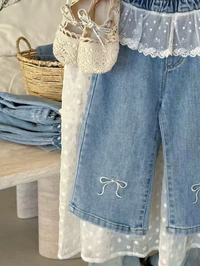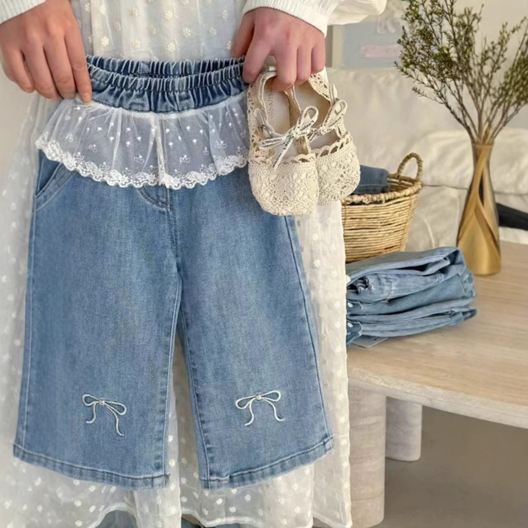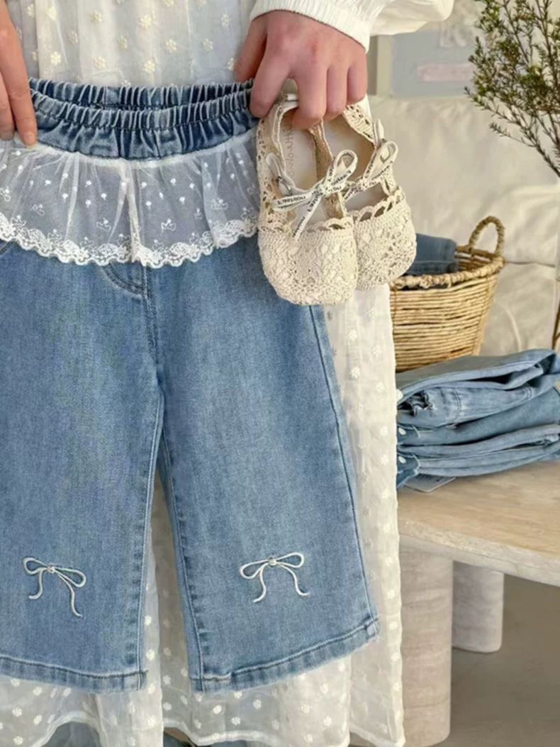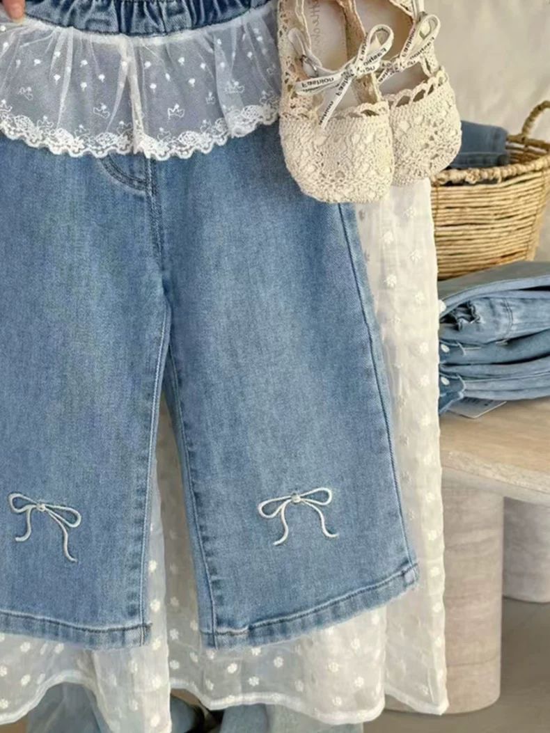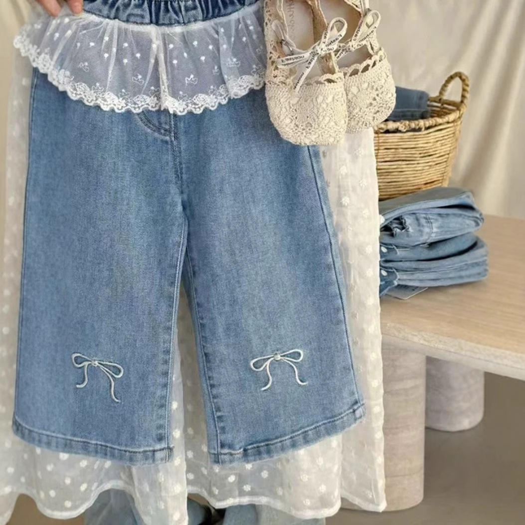 한국식 아동복 소녀 바지 봄 서양식 어린이 블루 청바지 아기의 패셔너블 레이스 레이스 와이드 다리 바지스토어 가기