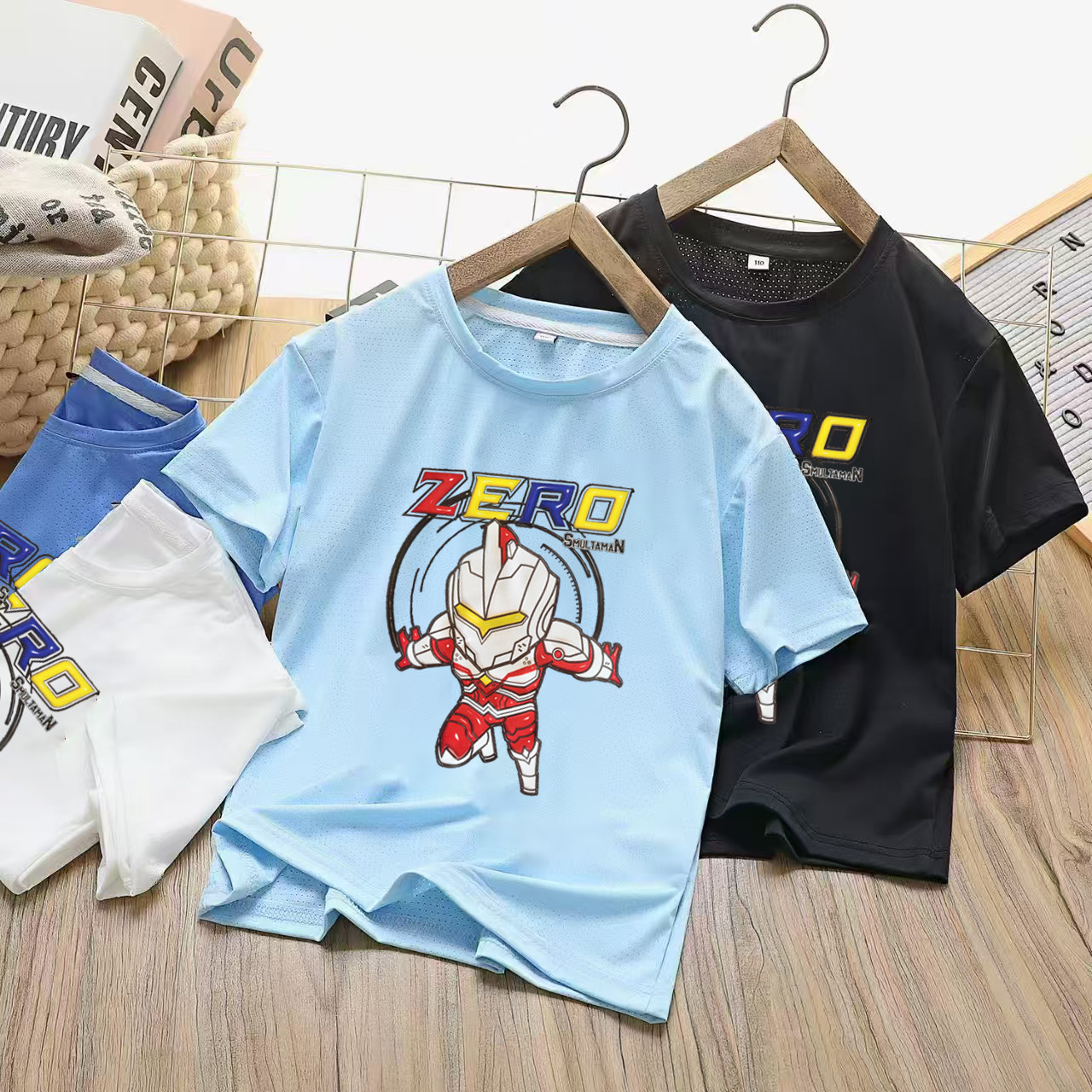 여름 어린이 티셔츠 소년 소녀 반팔 아이스 실크 빠른 건조 티셔츠베이스 셔츠 중간 및 큰 어린이 만화 아이스 실크 탑