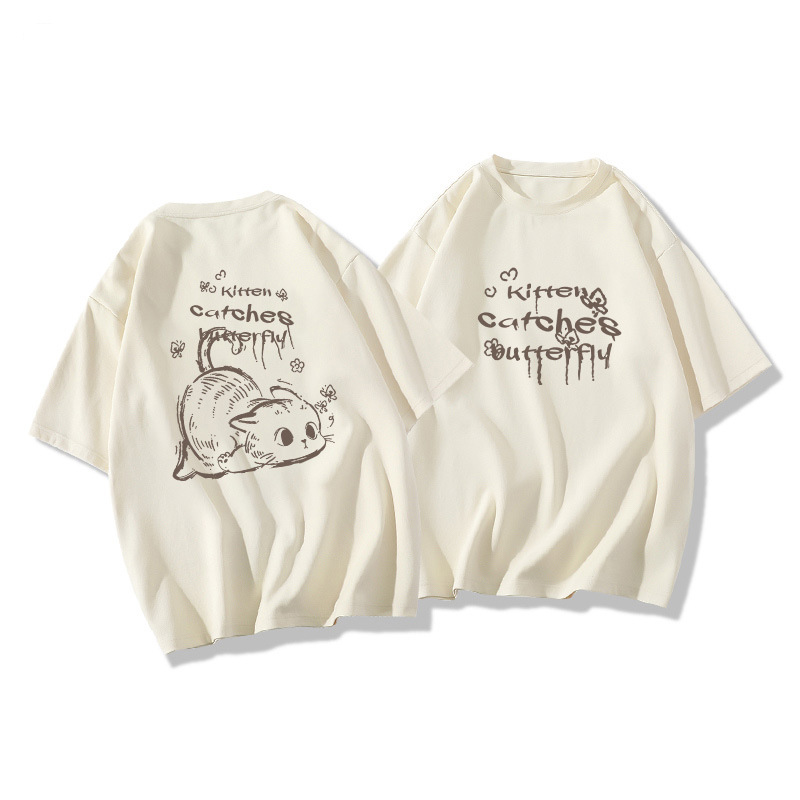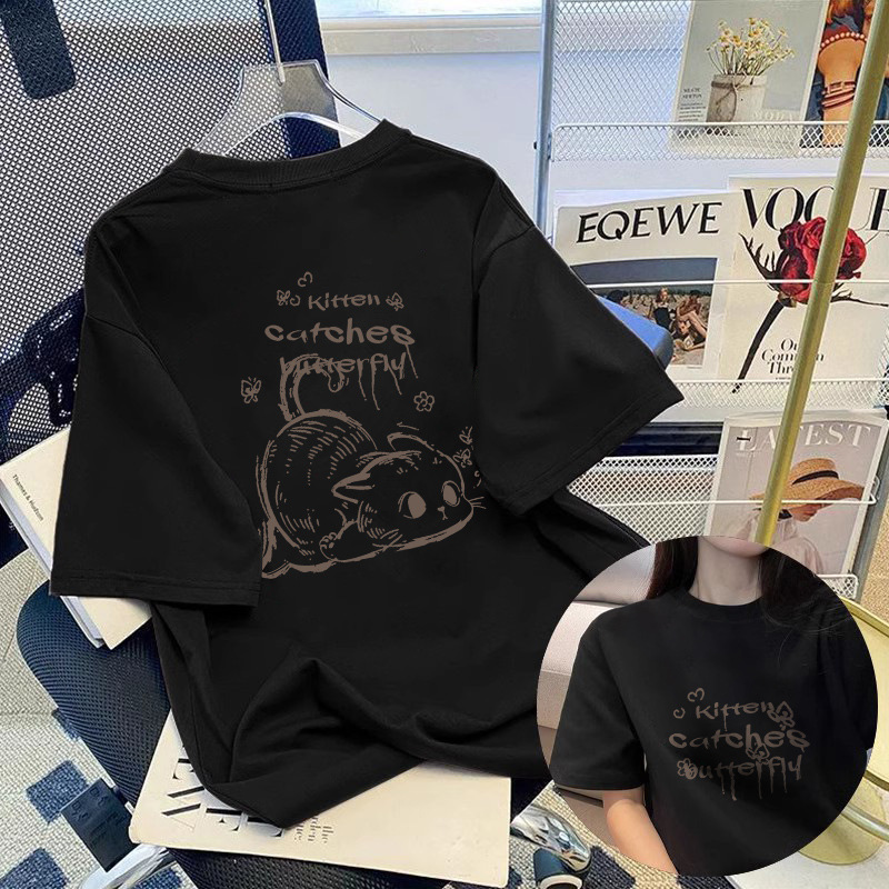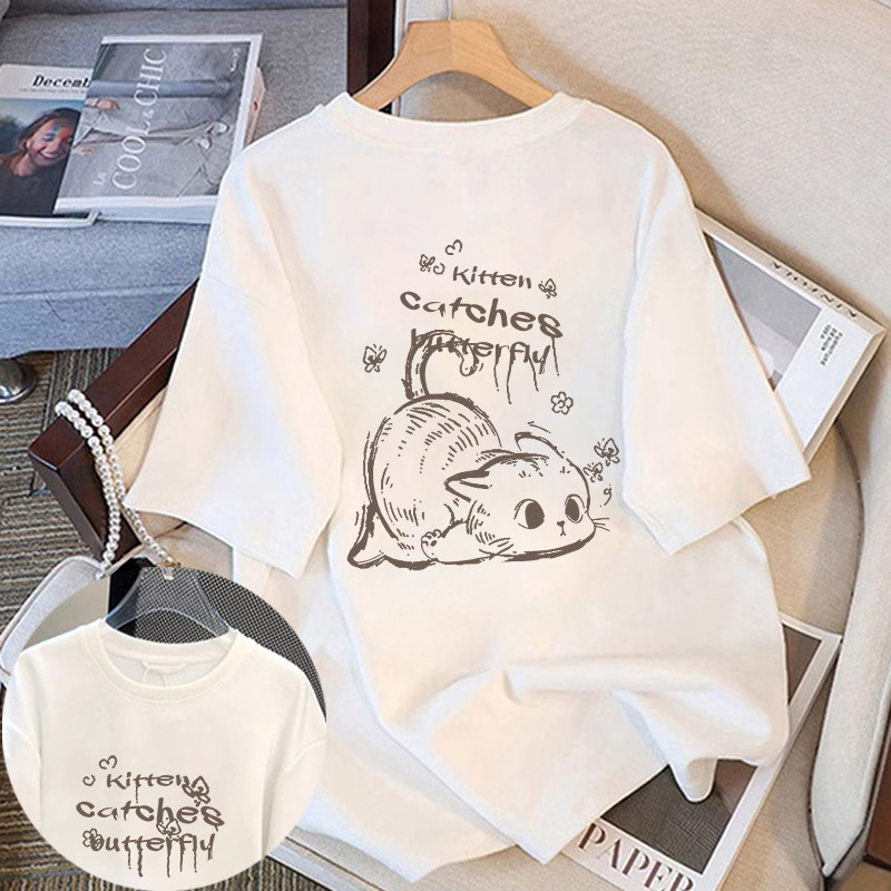 미국 스타일의 트렌디 한 브랜드 고양이 반팔 티셔츠 여성 화이트 여름 2025 새로운 느슨한 플러스 사이즈 디자인 센스 티셔츠 탑스토어 가기