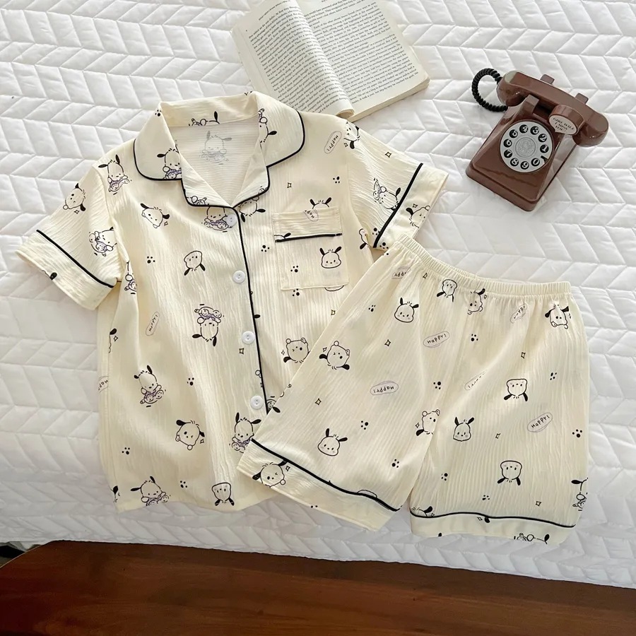 여름 어린이 만화 크레용 작은 새 잠옷 소년 용 홈 의류 소녀와 아기를위한 반소매 에어컨 얇은 옷