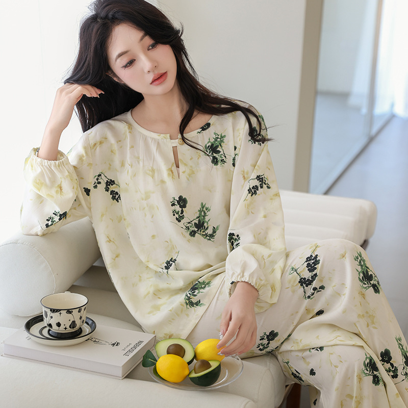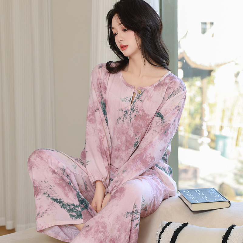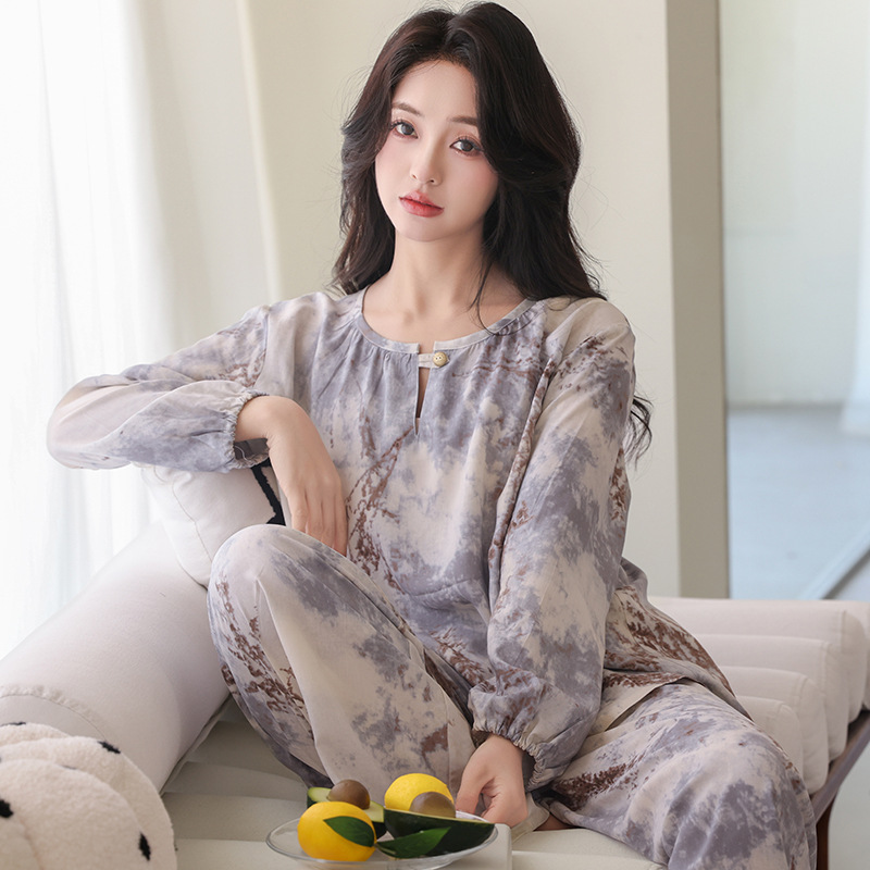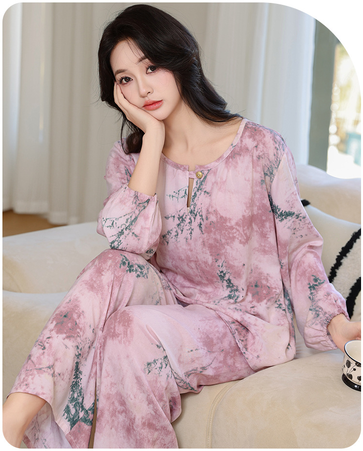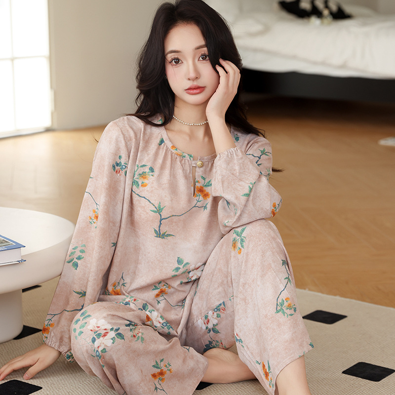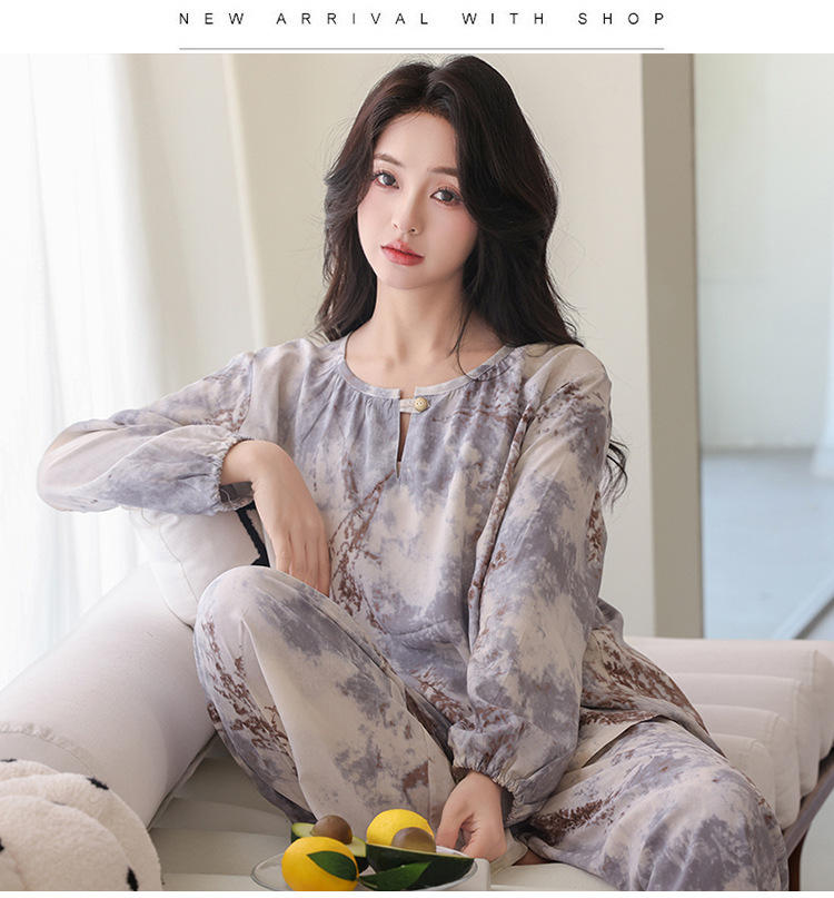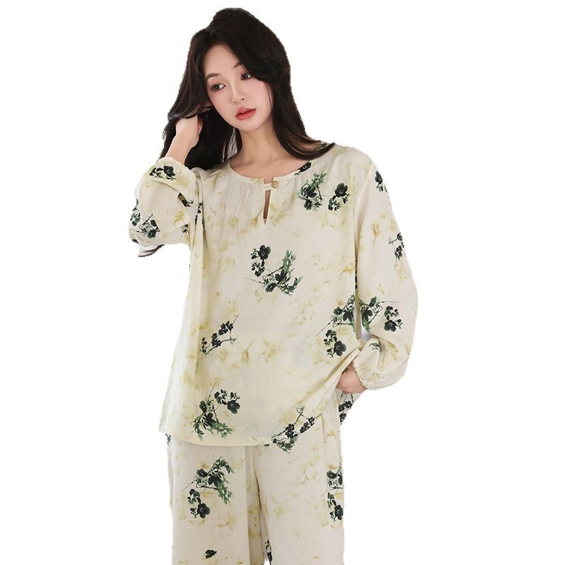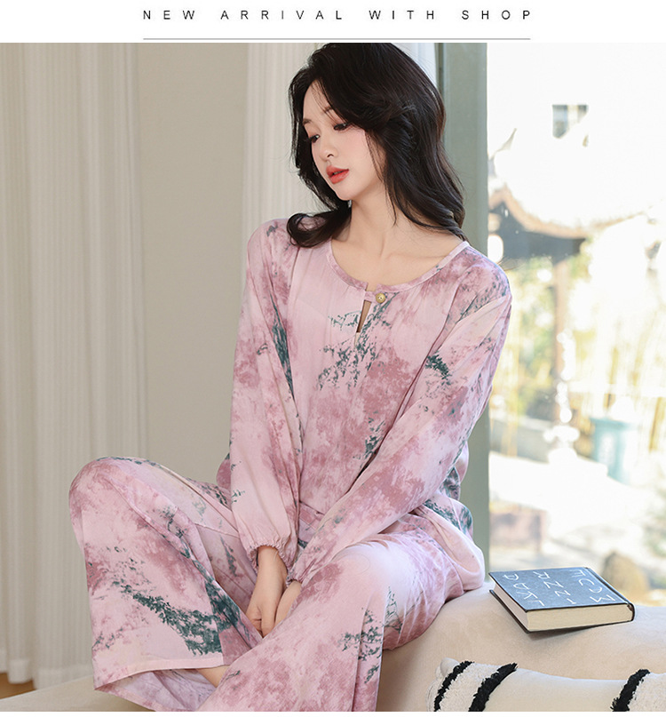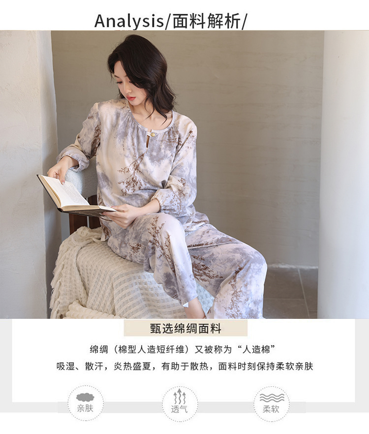면 실크 잠옷 여성의 여름 얇은 새로운 중국 스타일 홈 옷 봄과 가을 긴 소매 인공 면 외부 착용 간단한 국가 스타일 세트스토어 가기