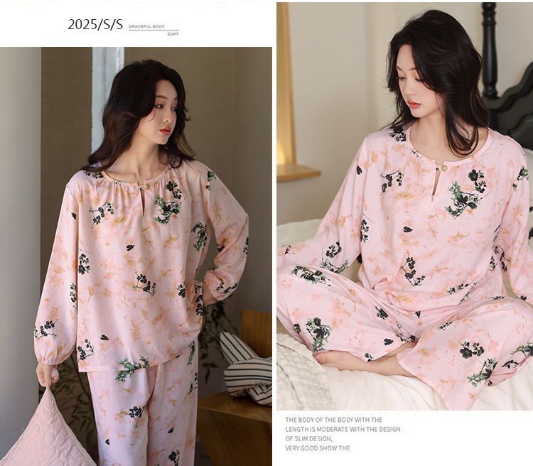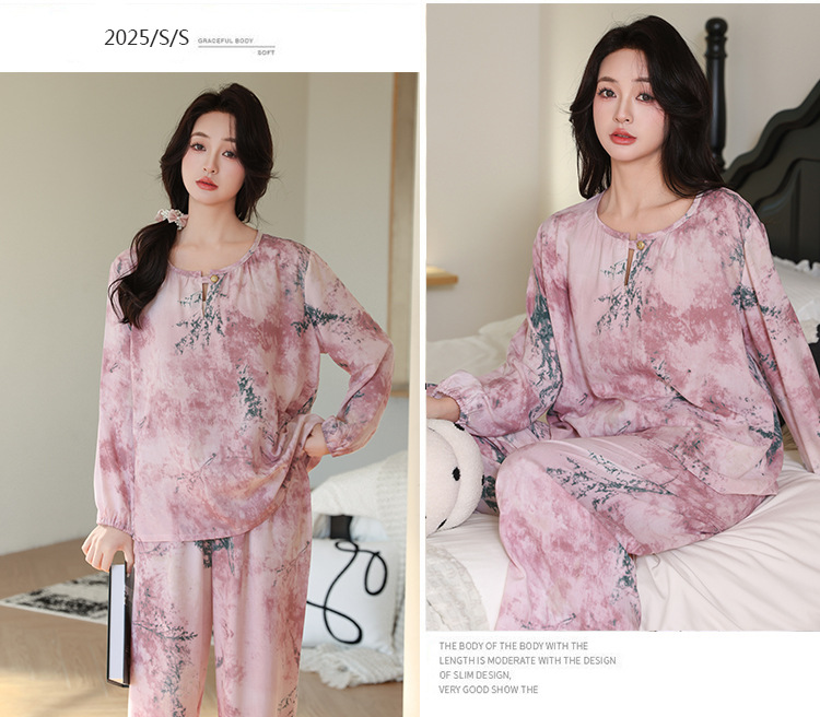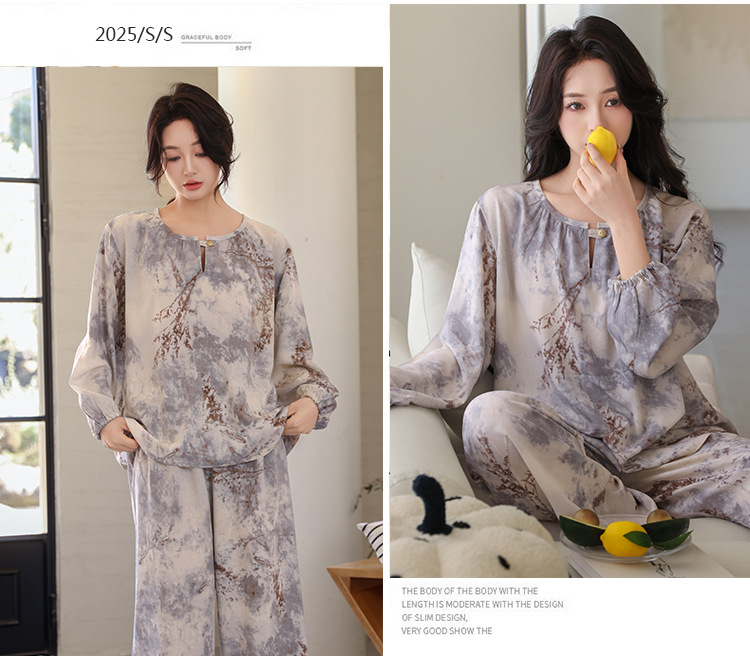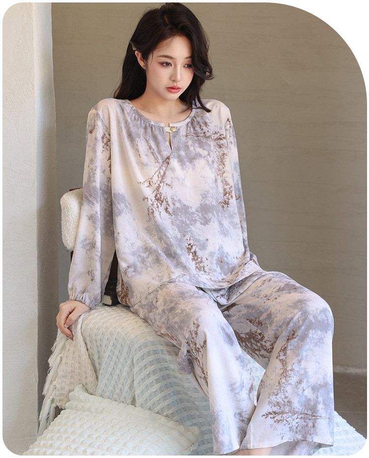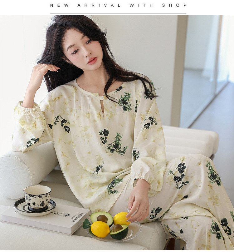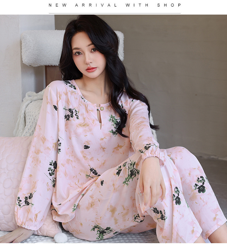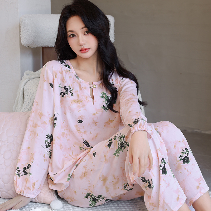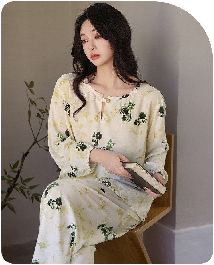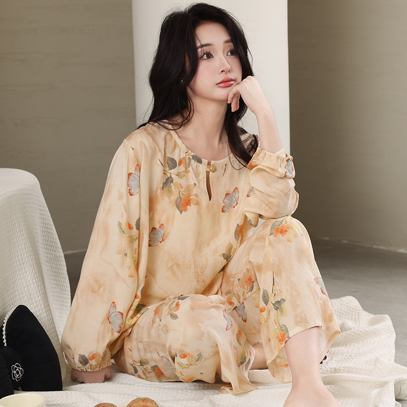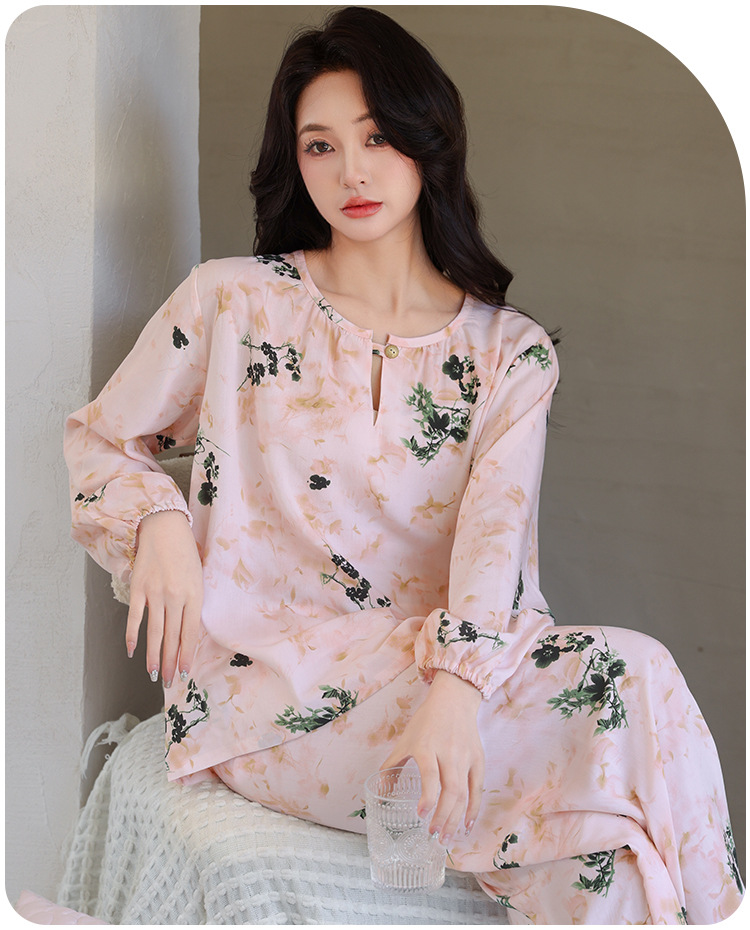 면 실크 잠옷 여성의 여름 얇은 새로운 중국 스타일 홈 옷 봄과 가을 긴 소매 인공 면 외부 착용 간단한 국가 스타일 세트스토어 가기