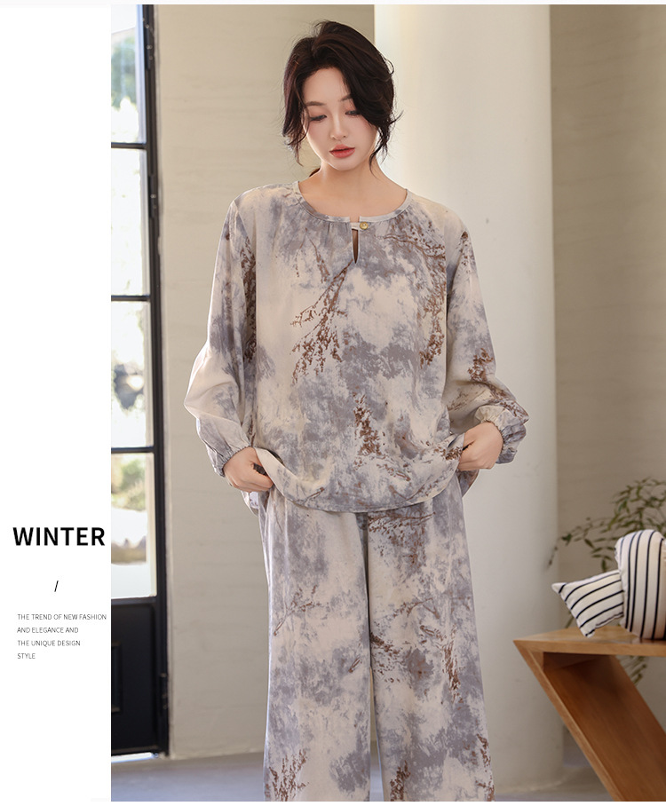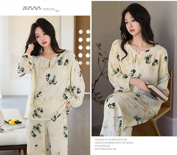 면 실크 잠옷 여성의 여름 얇은 새로운 중국 스타일 홈 옷 봄과 가을 긴 소매 인공 면 외부 착용 간단한 국가 스타일 세트