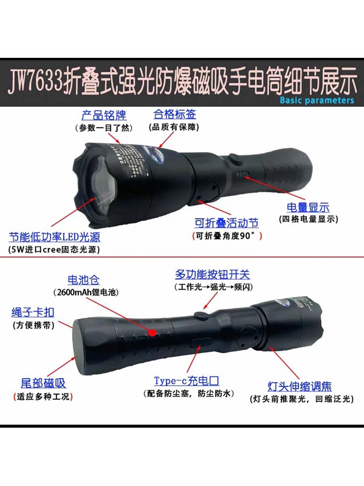 오션 킹 JW7633 강력한 방폭 다기능 작업등 후면 자석 부착 접이식 충전식 손전등