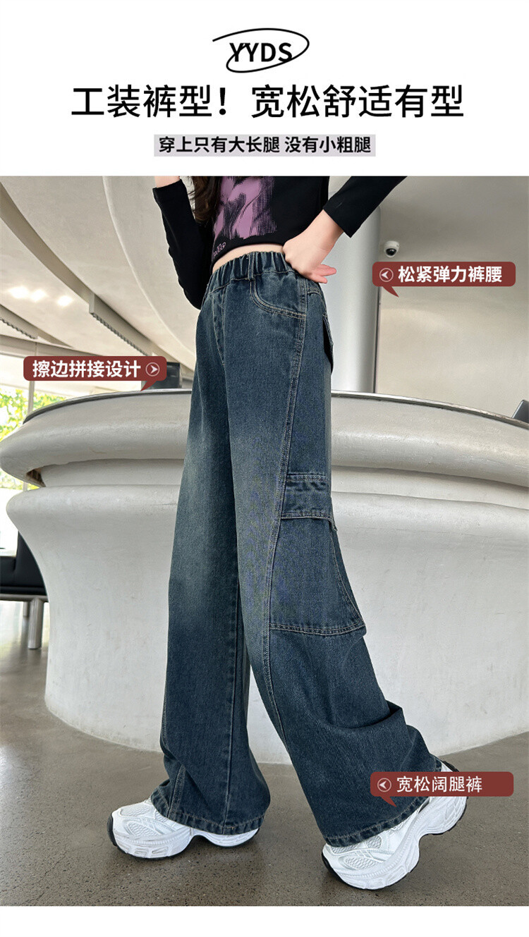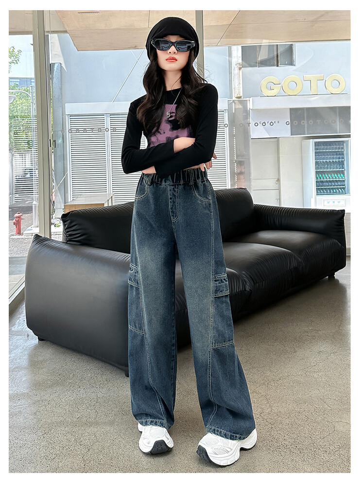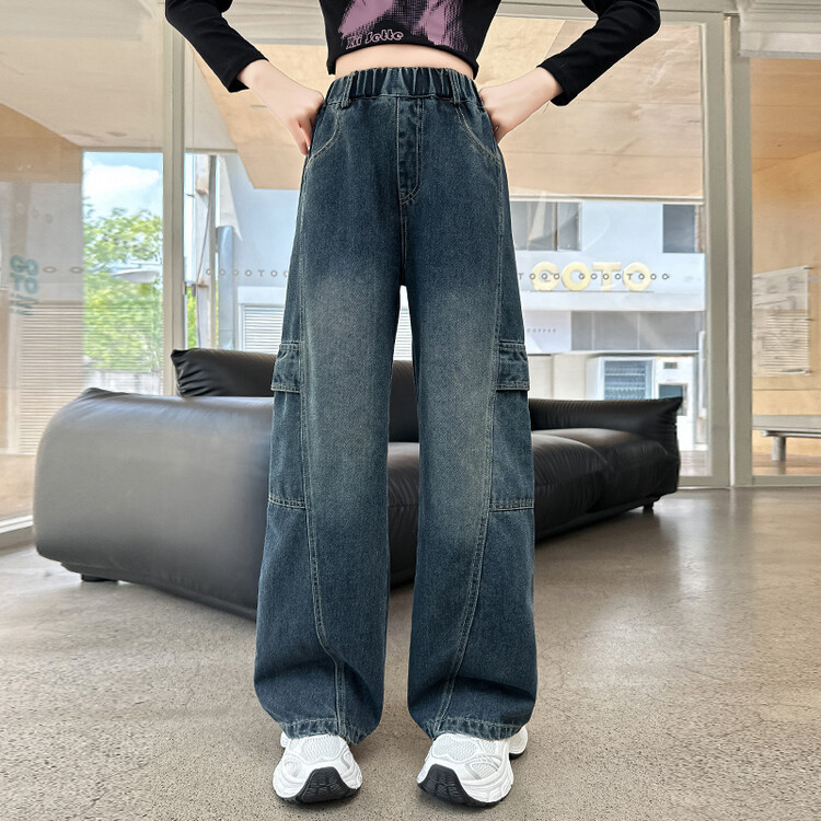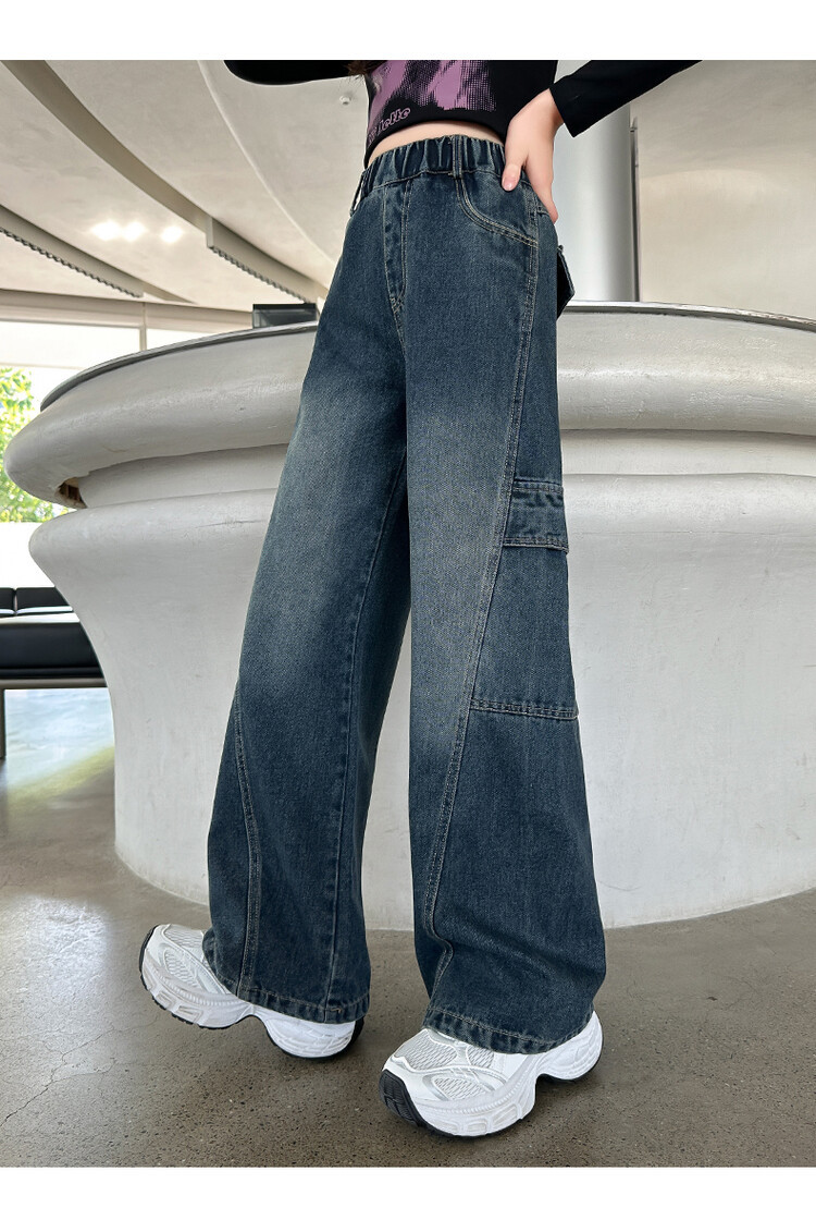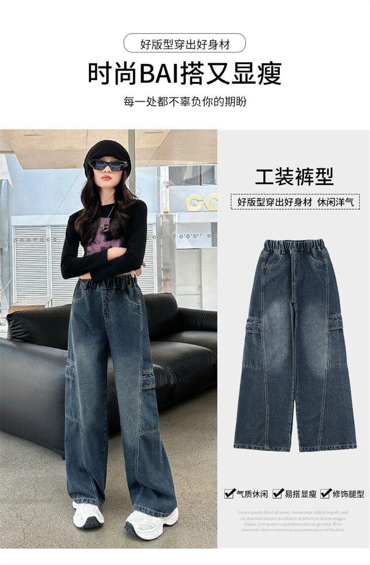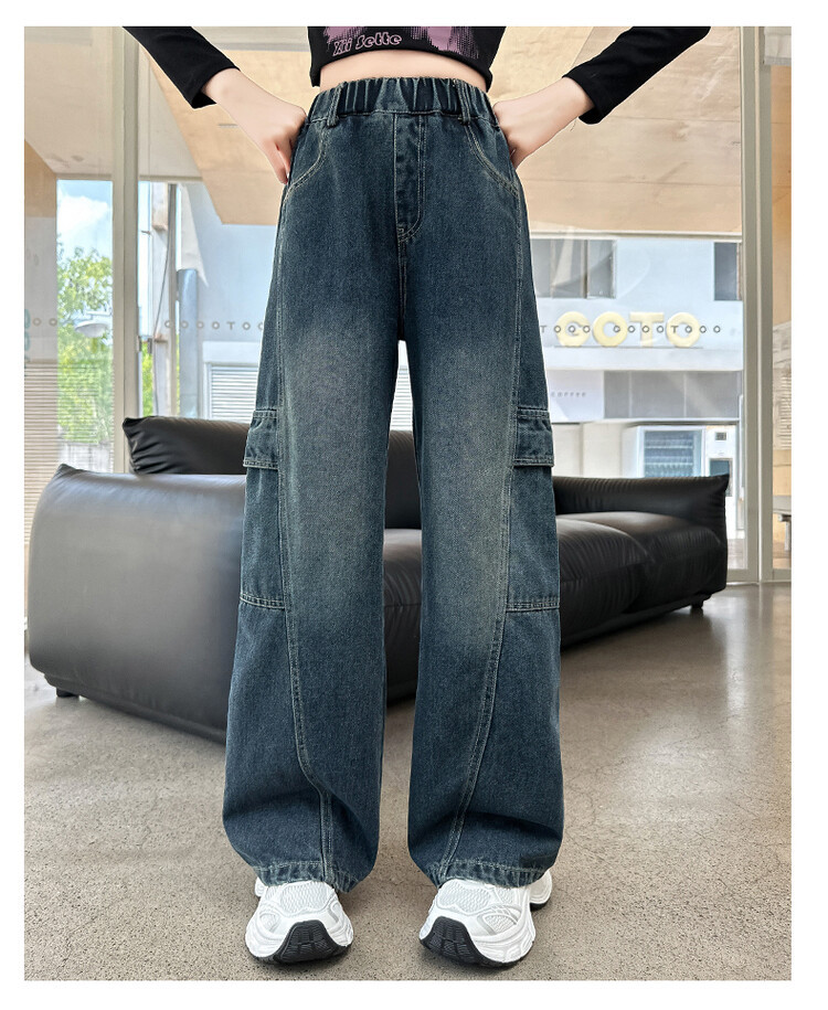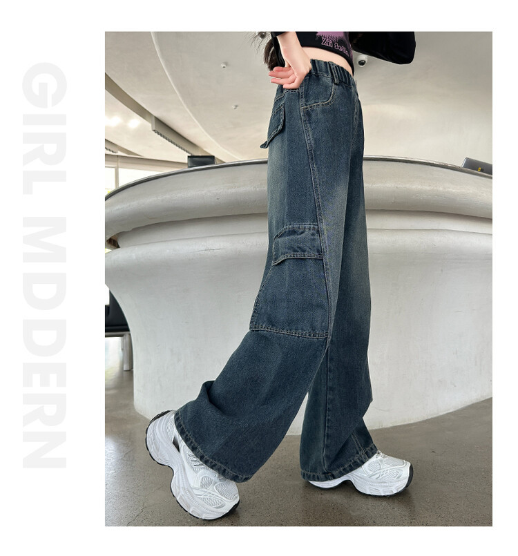 크로스보더 여아 데님 워크웨어 롱 팬츠, 중대형 아동용 봄가을 레트로 스트레이트 슬림핏 와이드 팬츠, 아동용 루즈핏 바지스토어 가기
