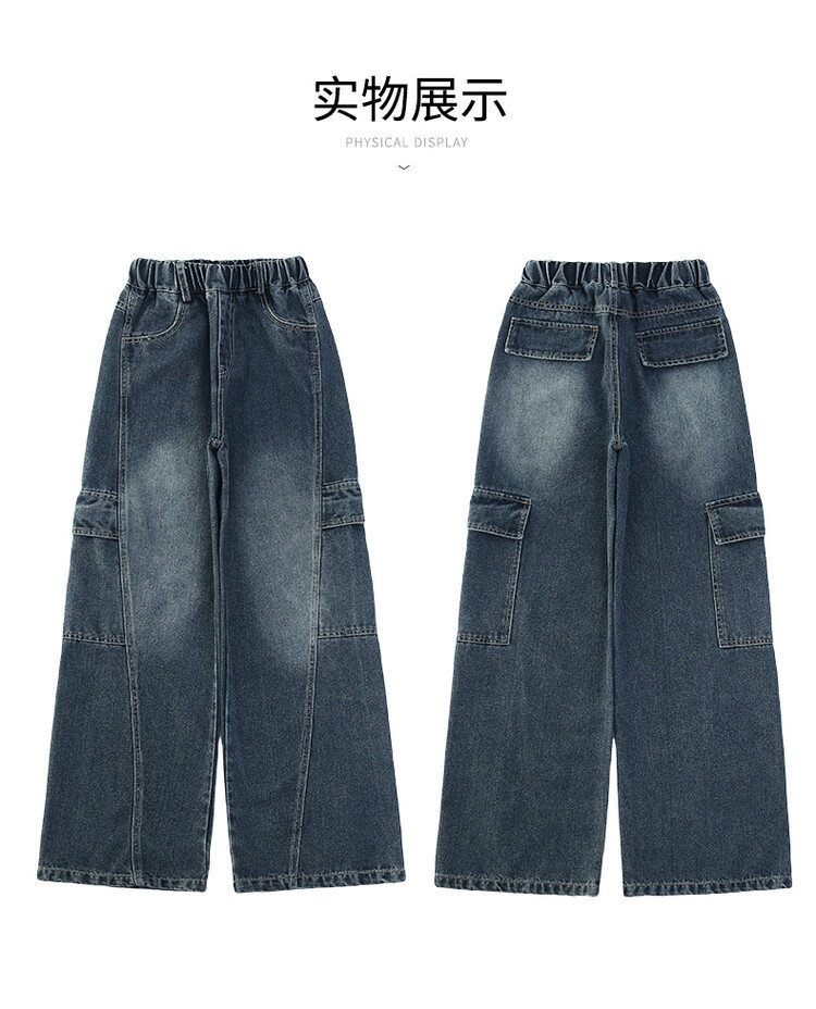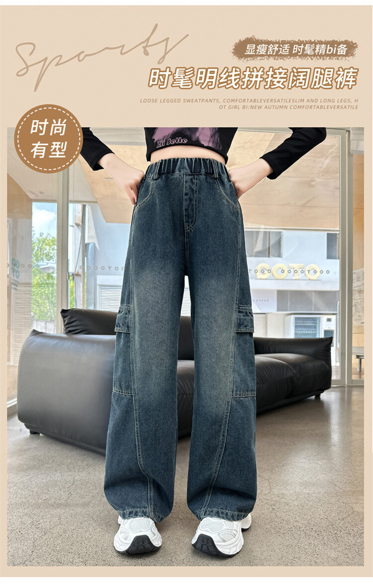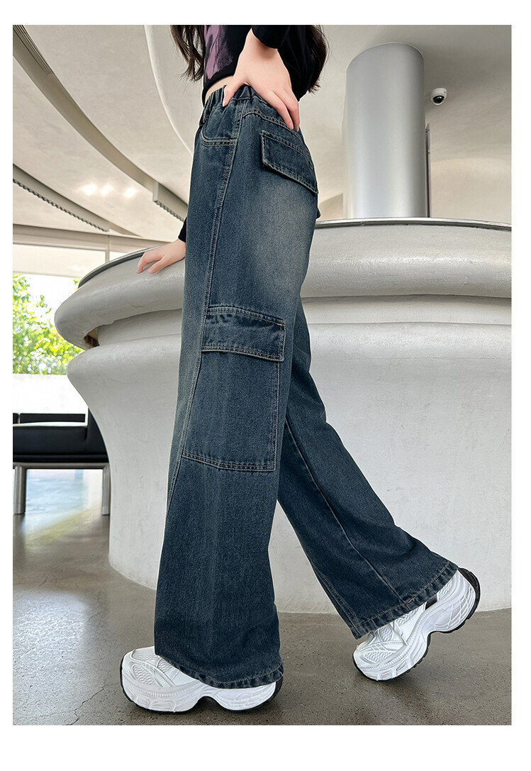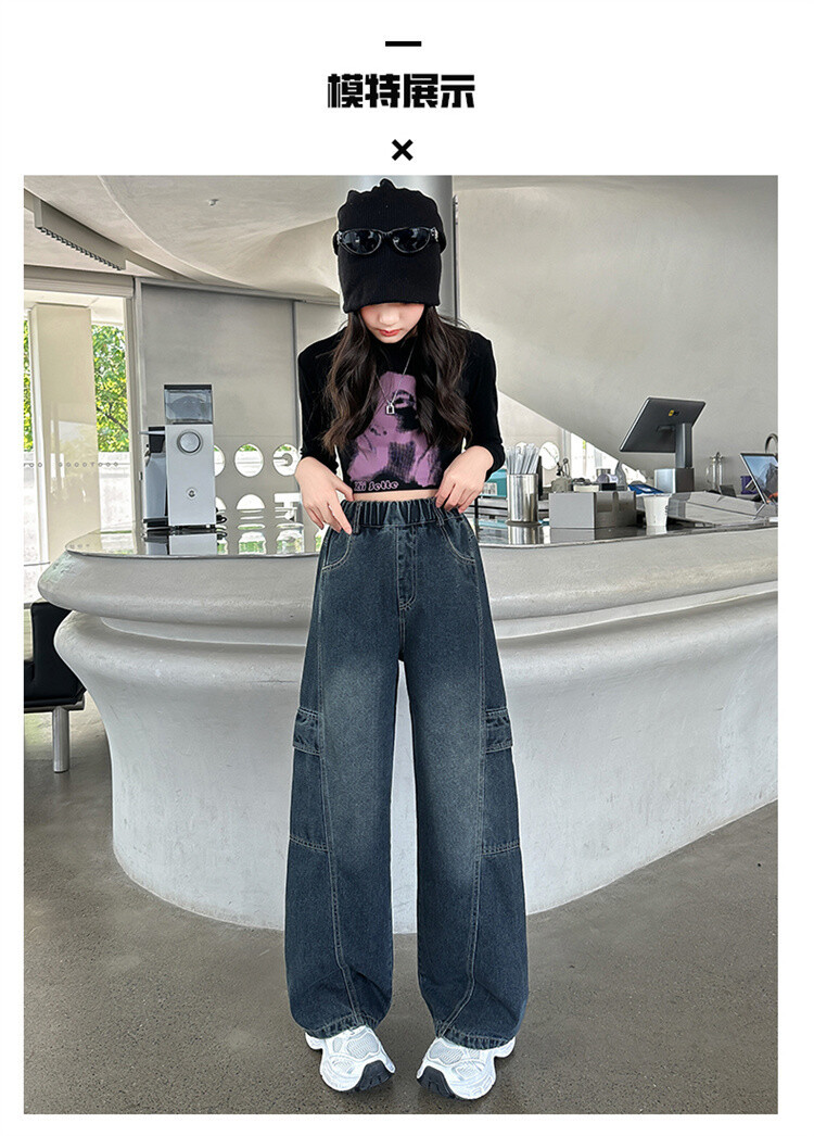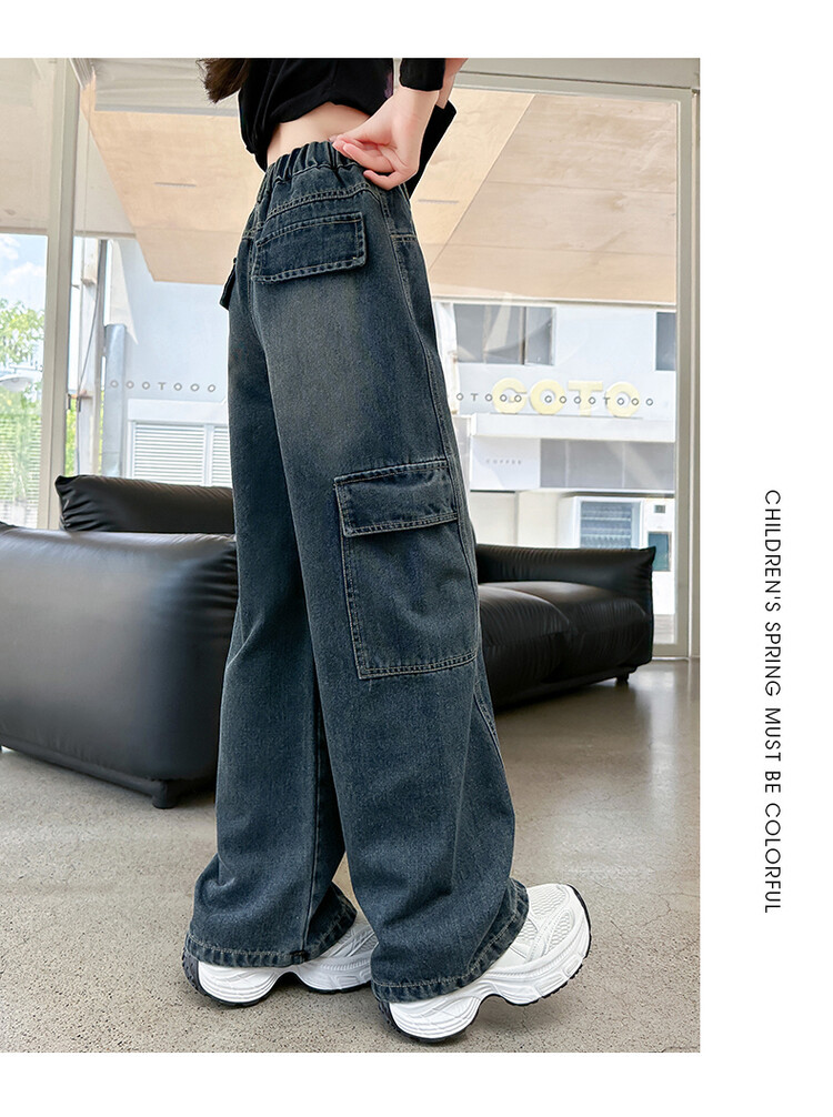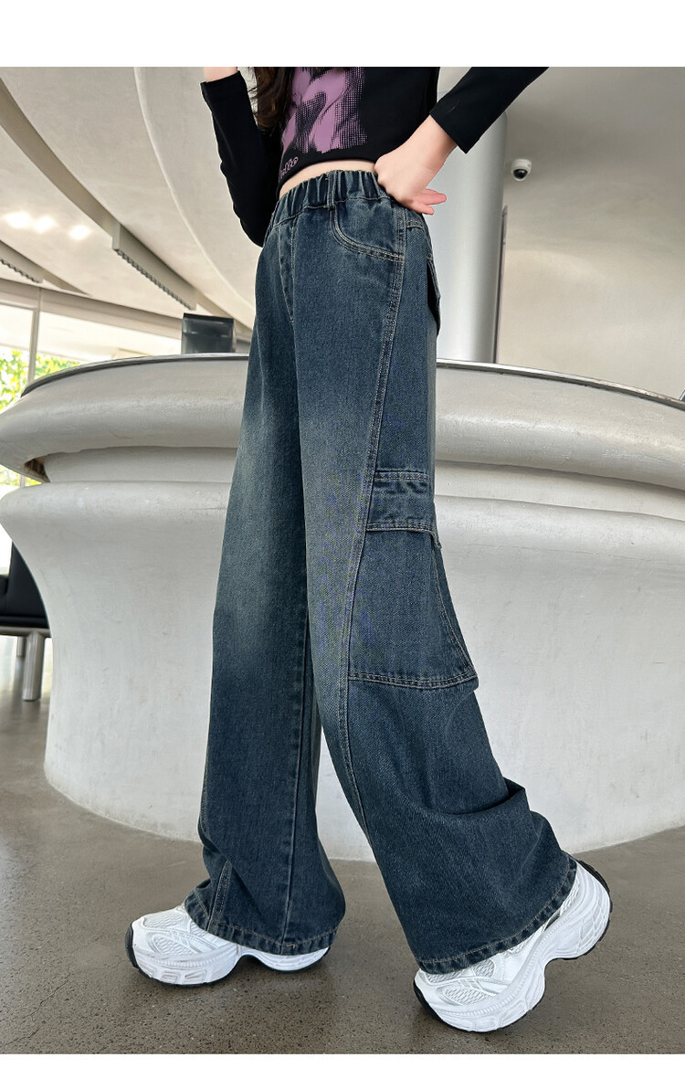 크로스보더 여아 데님 워크웨어 롱 팬츠, 중대형 아동용 봄가을 레트로 스트레이트 슬림핏 와이드 팬츠, 아동용 루즈핏 바지스토어 가기