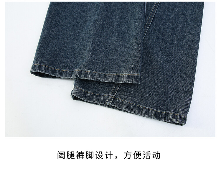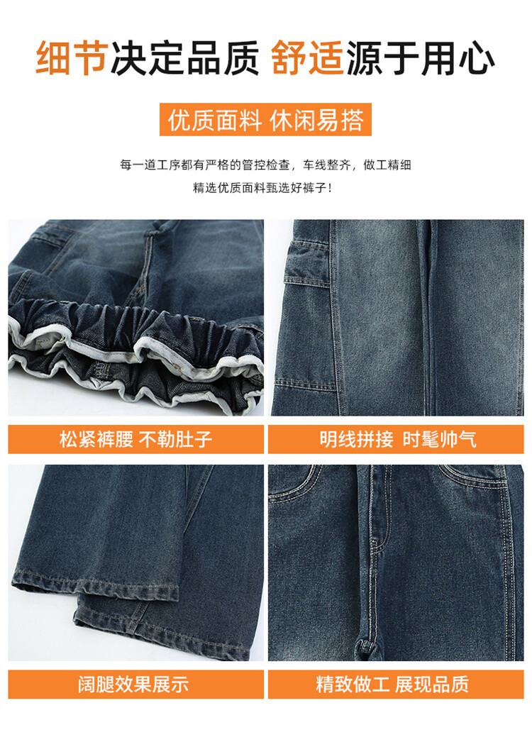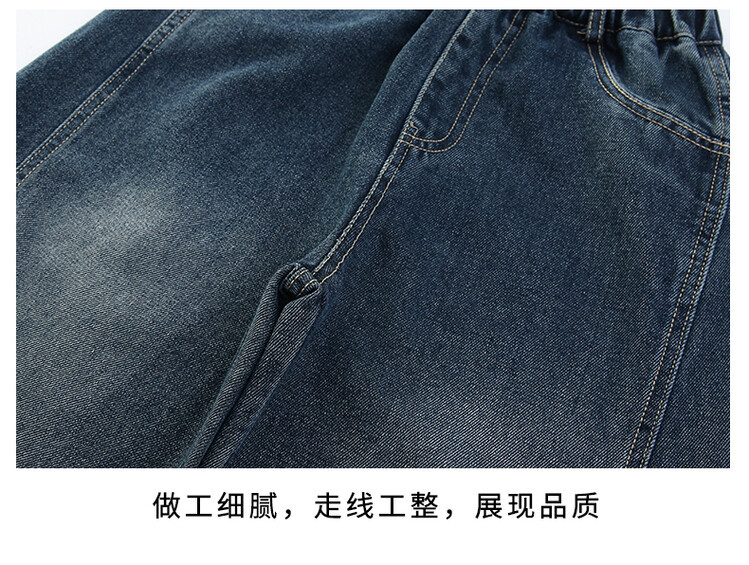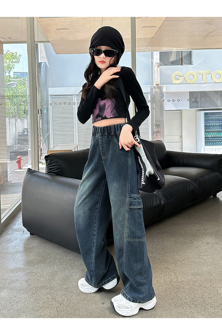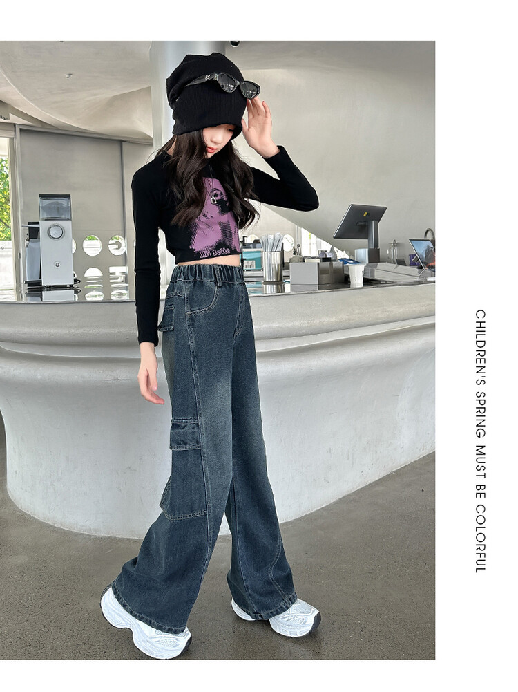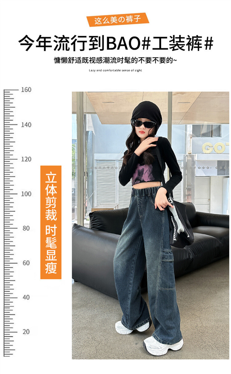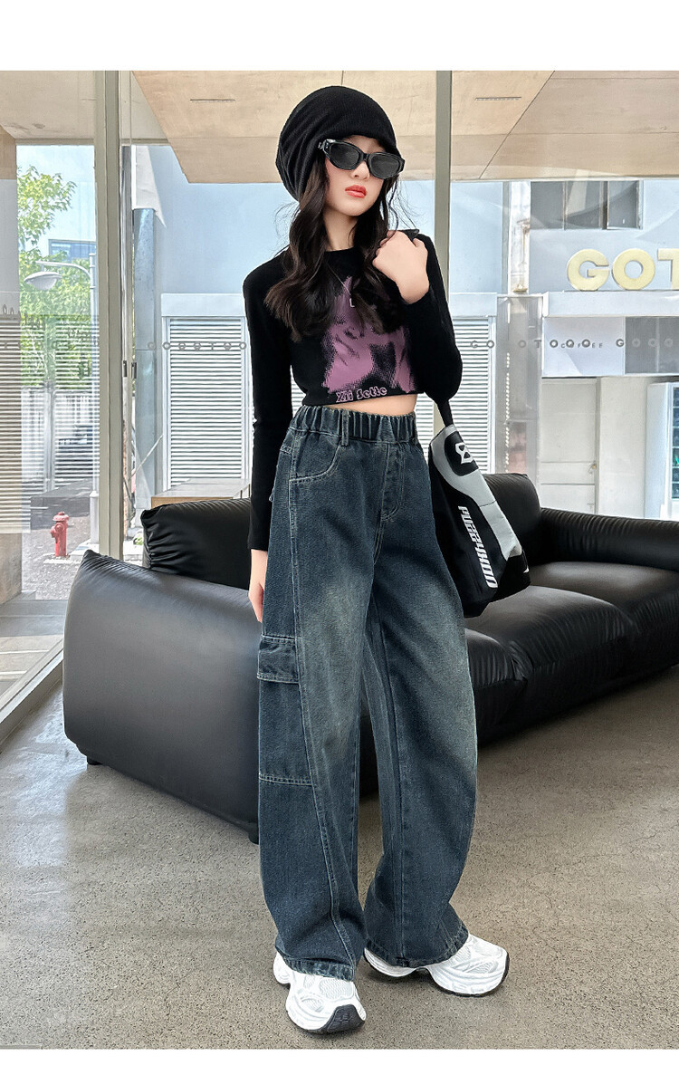 크로스보더 여아 데님 워크웨어 롱 팬츠, 중대형 아동용 봄가을 레트로 스트레이트 슬림핏 와이드 팬츠, 아동용 루즈핏 바지스토어 가기