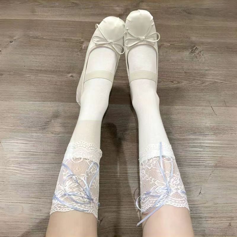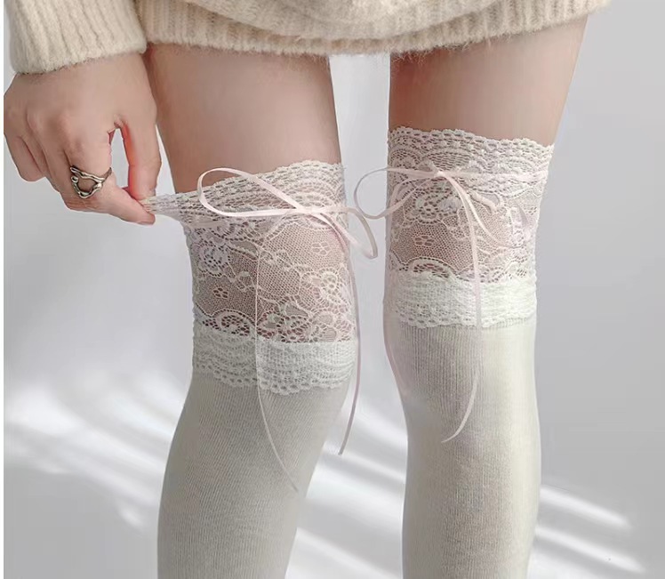 일본식 흰색 레이스 레이스 튜브 양말 여성용 로리타 스타일 리본 묶음 무릎 위 양말 땀 흡수 및 미끄럼 방지